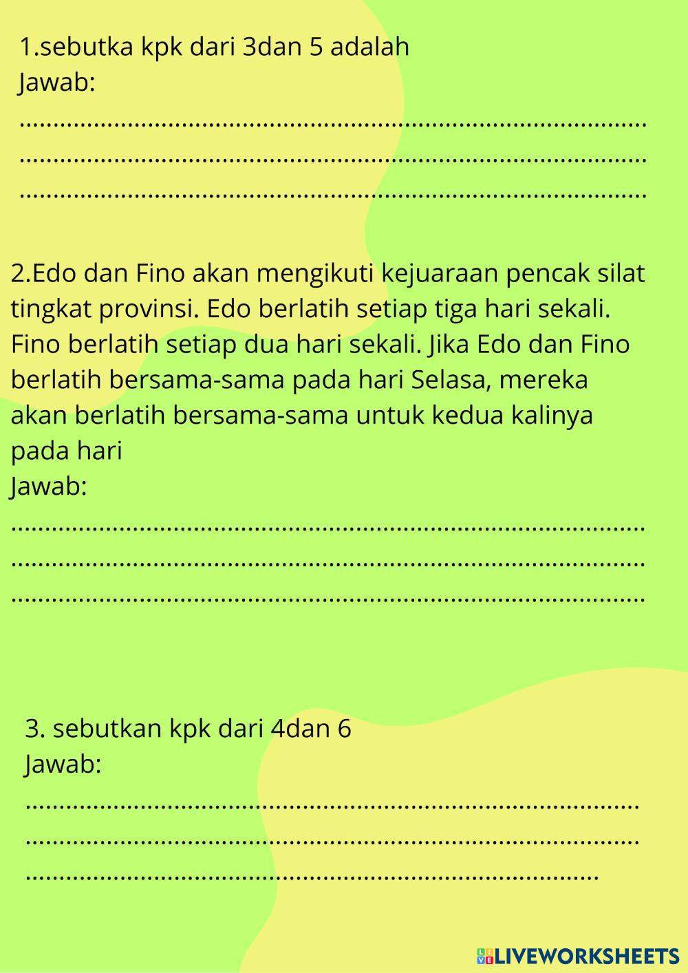 Created byKhoiriah Matematika KPK dan FPB Age 10-14 level: 4 Indonesian Author's Instructions My Google Classroom Courses × 0 classes selected (0 students total) Quick Access Select all classes (0 classes) All Classes Loading courses... Cancel Share Share to selected Course __COURSE_NAME__ __STUDENT_NAME__ (__STUDENT_EMAIL__) LEMBAR KERJA PESERTA DIDIK 5 Download Worksheet Validation Check my answers Emails my answers to my teacher Full name Group/level School subject Teacher's email or key code Close Submit Validating worksheet... (12) Your answers have been sent to your teacher. Good luck! OK We encountered an error submitting your answers. Please try again. OK Advertisement | Go Ad Free Created byKhoiriah Matematika KPK dan FPB Age 10-14 level: 4 Indonesian Author's Instructions