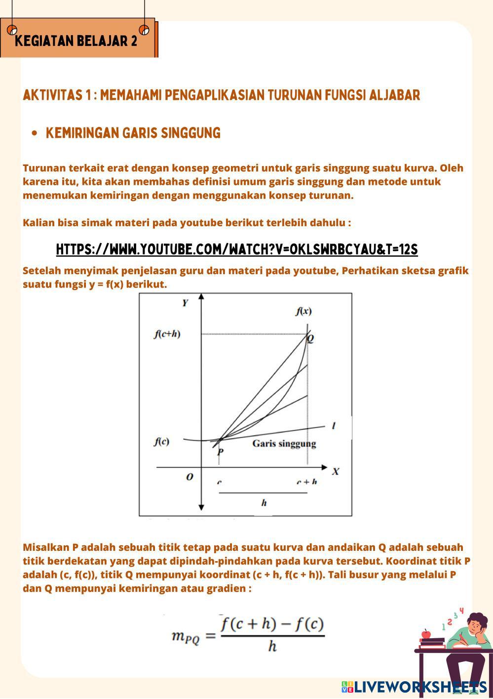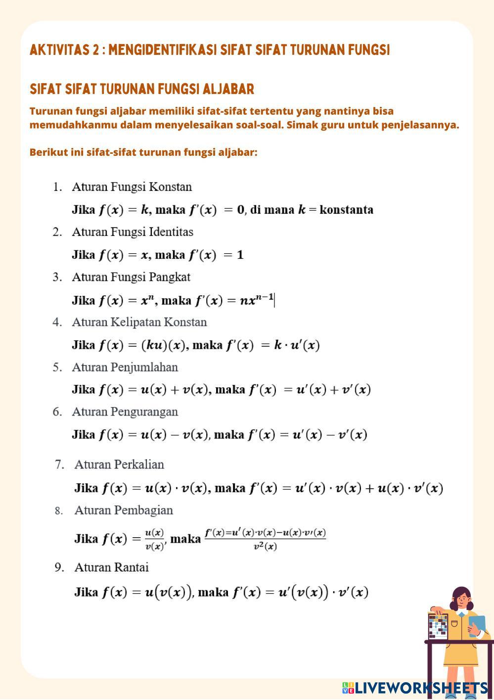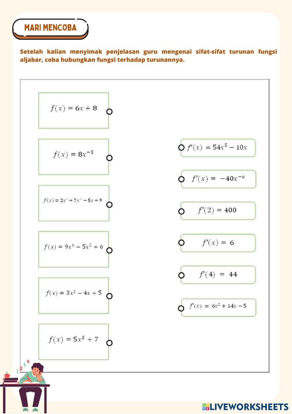 Created byAnnisa Wardah Matematika Turunan Fungsi Aljabar Age 17+ level: 11 Indonesian Author's Instructions My Google Classroom Courses × 0 classes selected (0 students total) Quick Access Select all classes (0 classes) All Classes Loading courses... Cancel Share Share to selected Course __COURSE_NAME__ __STUDENT_NAME__ (__STUDENT_EMAIL__) E-LKPD Turunan Fungsi Aljabar Download Worksheet Validation Check my answers Emails my answers to my teacher Full name Group/level School subject Teacher's email or key code Close Submit Validating worksheet... (12) Your answers have been sent to your teacher. Good luck! OK We encountered an error submitting your answers. Please try again. OK Advertisement | Go Ad Free Created byAnnisa Wardah Matematika Turunan Fungsi Aljabar Age 17+ level: 11 Indonesian Author's Instructions