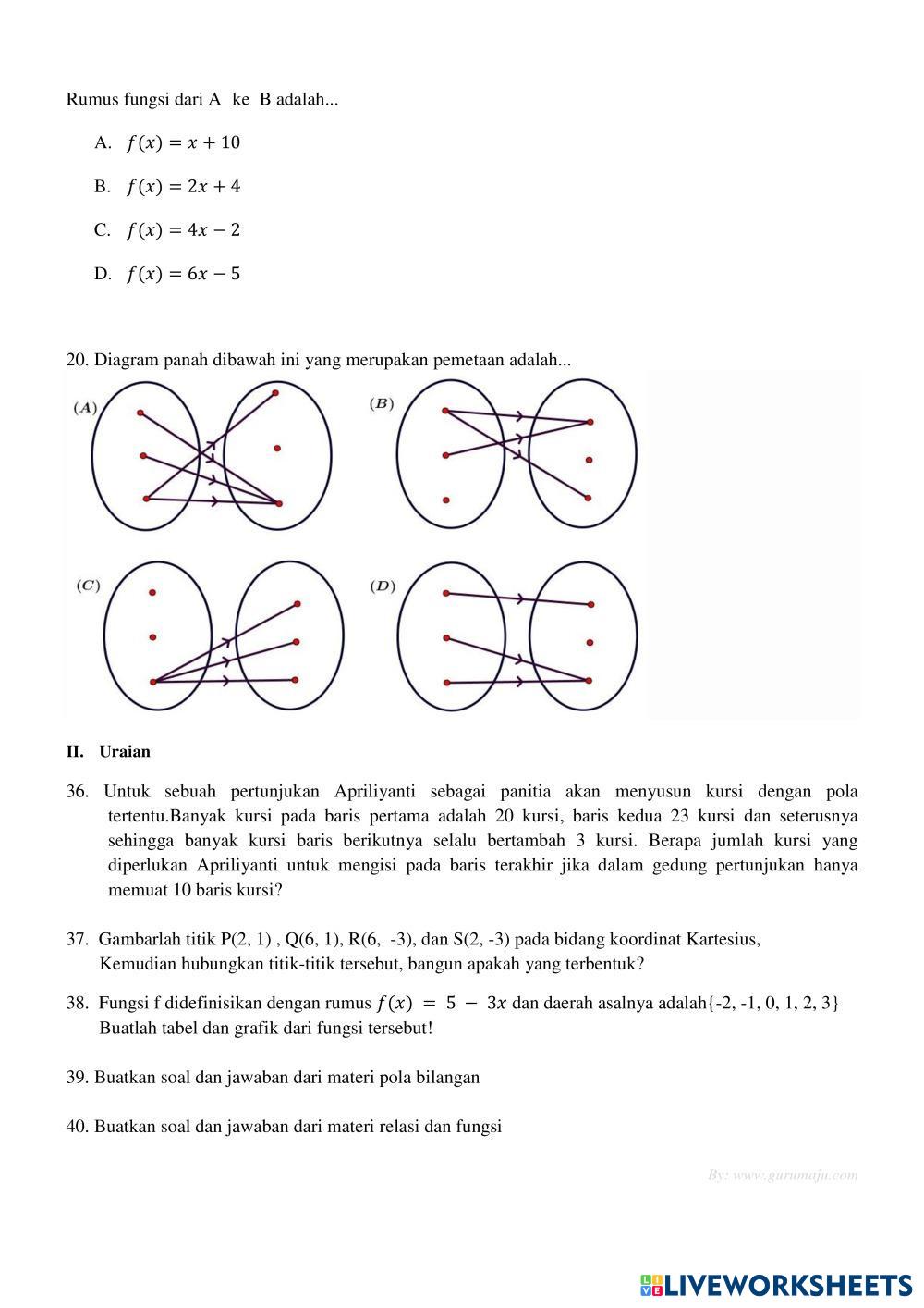 Created byintan sondari Matematika Matematika smp Age 10+ level: D Indonesian Author's Instructions My Google Classroom Courses × 0 classes selected (0 students total) Quick Access Select all classes (0 classes) All Classes Loading courses... Cancel Share Share to selected Course __COURSE_NAME__ __STUDENT_NAME__ (__STUDENT_EMAIL__) PAS MATEMATIKA KELAS 8 Download Worksheet Validation Check my answers Emails my answers to my teacher Full name Group/level School subject Teacher's email or key code Close Submit Validating worksheet... (12) Your answers have been sent to your teacher. Good luck! OK We encountered an error submitting your answers. Please try again. OK Advertisement | Go Ad Free Created byintan sondari Matematika Matematika smp Age 10+ level: D Indonesian Author's Instructions