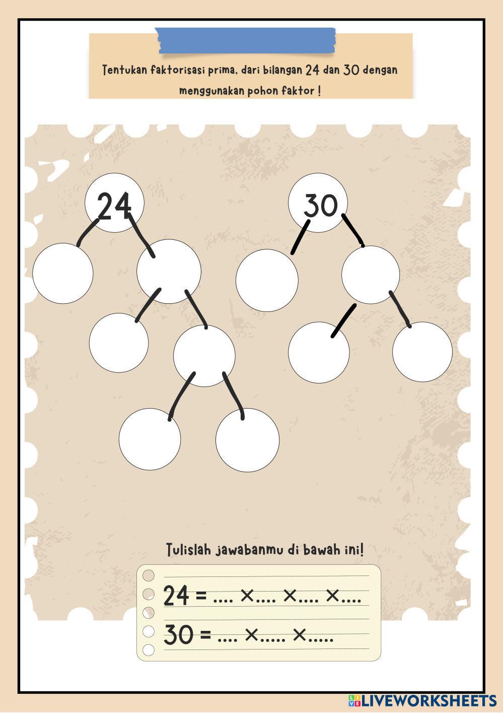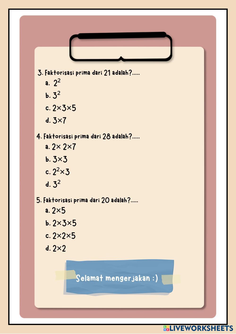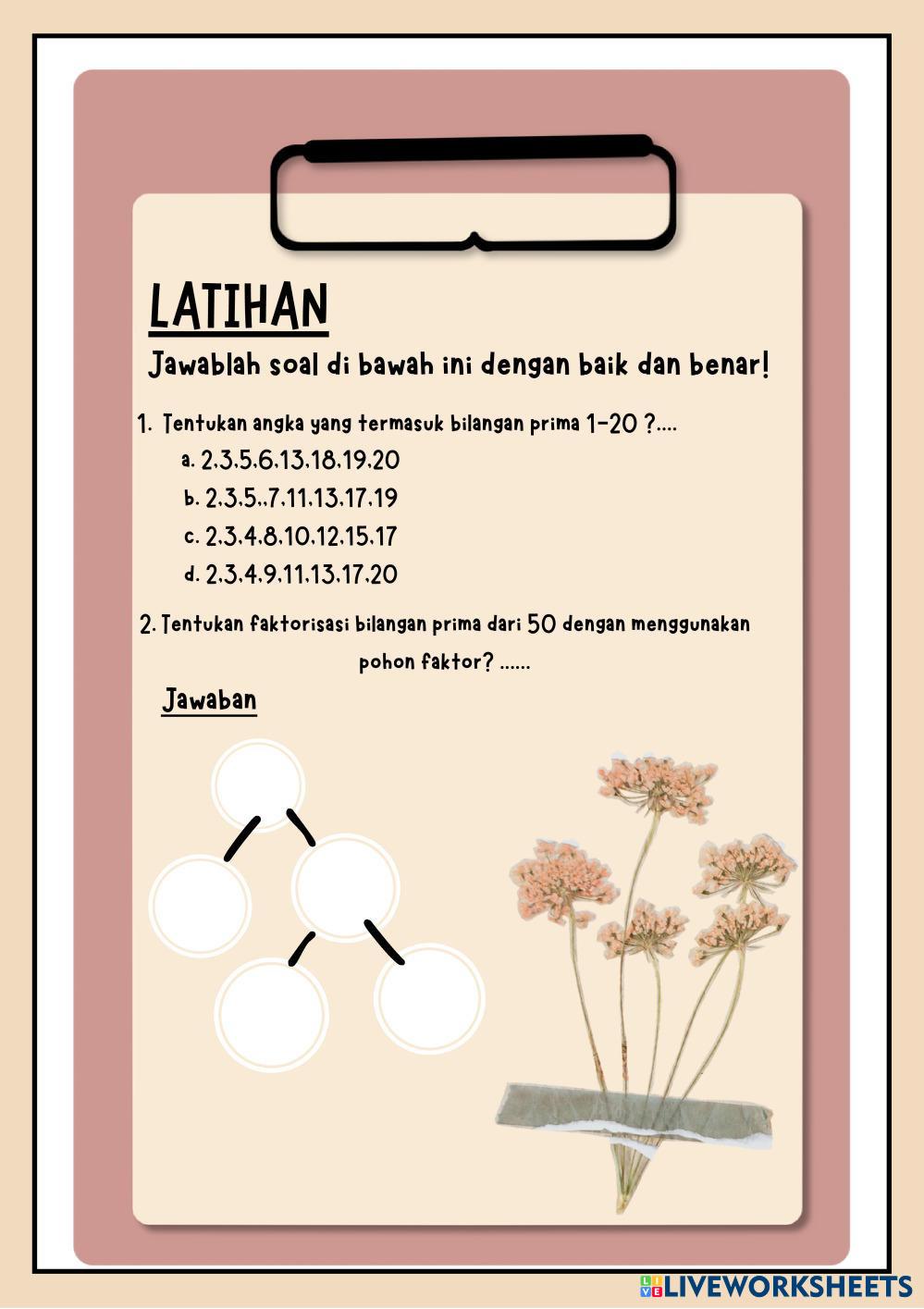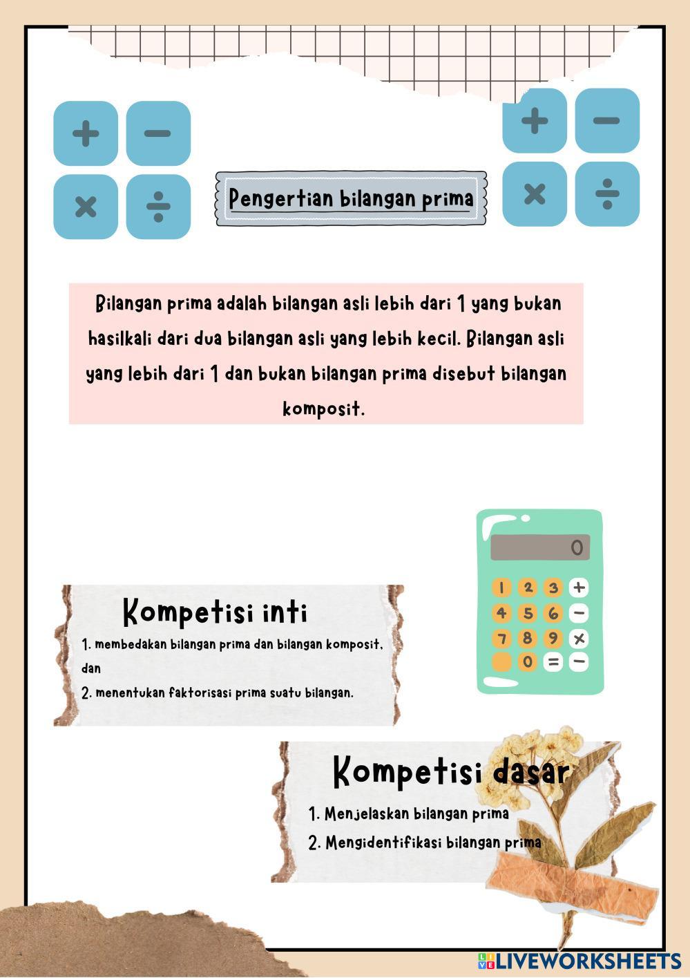 Created byNadia Humairah Matematika Bilangan Prima Age 9-14 level: 4 Indonesian Author's Instructions Bilangan Prima My Google Classroom Courses × 0 classes selected (0 students total) Quick Access Select all classes (0 classes) All Classes Loading courses... Cancel Share Share to selected Course __COURSE_NAME__ __STUDENT_NAME__ (__STUDENT_EMAIL__) Bilangan Prima Download Worksheet Validation Check my answers Emails my answers to my teacher Full name Group/level School subject Teacher's email or key code Close Submit Validating worksheet... (12) Your answers have been sent to your teacher. Good luck! OK We encountered an error submitting your answers. Please try again. OK Advertisement | Go Ad Free Created byNadia Humairah Matematika Bilangan Prima Age 9-14 level: 4 Indonesian Author's Instructions Bilangan Prima
