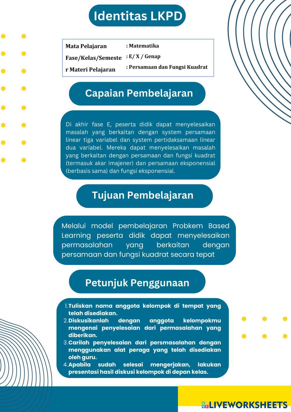 Created byAkmal Satria Husada Matematika Persamaan dan fungsi kuadrat Age 15+ level: 10 Indonesian Author's Instructions My Google Classroom Courses × 0 classes selected (0 students total) Quick Access Select all classes (0 classes) All Classes Loading courses... Cancel Share Share to selected Course __COURSE_NAME__ __STUDENT_NAME__ (__STUDENT_EMAIL__) LKPD VISUAL Download Worksheet Validation Check my answers Emails my answers to my teacher Full name Group/level School subject Teacher's email or key code Close Submit Validating worksheet... (12) Your answers have been sent to your teacher. Good luck! OK We encountered an error submitting your answers. Please try again. OK Advertisement | Go Ad Free Created byAkmal Satria Husada Matematika Persamaan dan fungsi kuadrat Age 15+ level: 10 Indonesian Author's Instructions