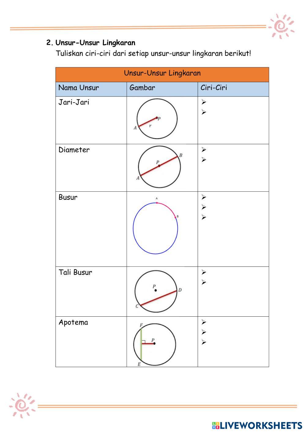 Created by kholilah Matematika Unsur Lingkaran Age 12-15 level: VIII Indonesian Author's Instructions My Google Classroom Courses × 0 classes selected (0 students total) Quick Access Select all classes (0 classes) All Classes Loading courses... Cancel Share Share to selected Course __COURSE_NAME__ __STUDENT_NAME__ (__STUDENT_EMAIL__) Lingkaran Download Worksheet Validation Check my answers Emails my answers to my teacher Full name Group/level School subject Teacher's email or key code Close Submit Validating worksheet... (12) Your answers have been sent to your teacher. Good luck! OK We encountered an error submitting your answers. Please try again. OK Advertisement | Go Ad Free Created by kholilah Matematika Unsur Lingkaran Age 12-15 level: VIII Indonesian Author's Instructions