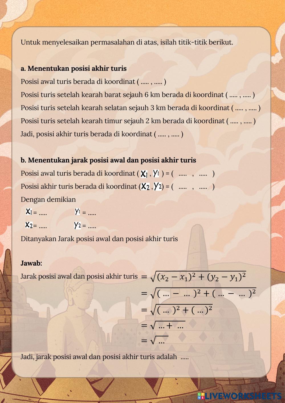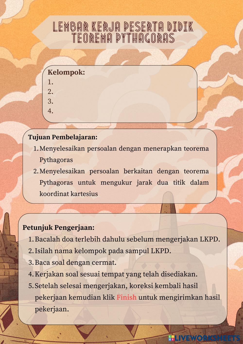 Created byDiyan Oktafiani Matematika Teorema phytagoras Age 12+ level: 2 Indonesian Author's Instructions My Google Classroom Courses × 0 classes selected (0 students total) Quick Access Select all classes (0 classes) All Classes Loading courses... Cancel Share Share to selected Course __COURSE_NAME__ __STUDENT_NAME__ (__STUDENT_EMAIL__) Teorema Phytagoras Pertemuan 2 Download Worksheet Validation Check my answers Emails my answers to my teacher Full name Group/level School subject Teacher's email or key code Close Submit Validating worksheet... (12) Your answers have been sent to your teacher. Good luck! OK We encountered an error submitting your answers. Please try again. OK Advertisement | Go Ad Free Created byDiyan Oktafiani Matematika Teorema phytagoras Age 12+ level: 2 Indonesian Author's Instructions