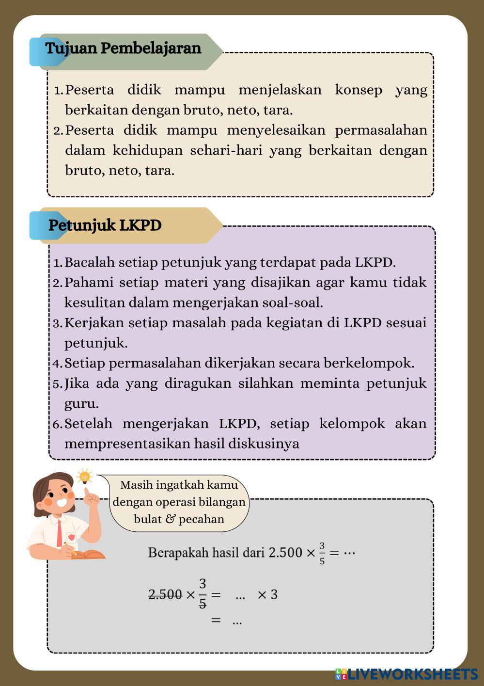 Created byAidaLatifah Matematika Aritmetika Sosial Age 13-18 level: 8 Indonesian Author's Instructions Bruto, Neto, Tara My Google Classroom Courses × 0 classes selected (0 students total) Quick Access Select all classes (0 classes) All Classes Loading courses... Cancel Share Share to selected Course __COURSE_NAME__ __STUDENT_NAME__ (__STUDENT_EMAIL__) E-LKPD 4 Download Worksheet Validation Check my answers Emails my answers to my teacher Full name Group/level School subject Teacher's email or key code Close Submit Validating worksheet... (12) Your answers have been sent to your teacher. Good luck! OK We encountered an error submitting your answers. Please try again. OK Advertisement | Go Ad Free Created byAidaLatifah Matematika Aritmetika Sosial Age 13-18 level: 8 Indonesian Author's Instructions Bruto, Neto, Tara