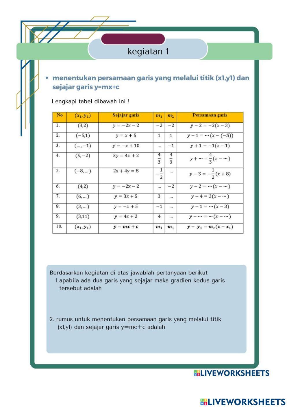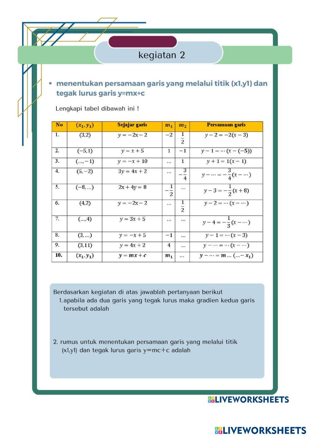 Created bymokhamad said Matematika Gradien Garis Lurus Age 13+ level: 8 Indonesian Author's Instructions My Google Classroom Courses × 0 classes selected (0 students total) Quick Access Select all classes (0 classes) All Classes Loading courses... Cancel Share Share to selected Course __COURSE_NAME__ __STUDENT_NAME__ (__STUDENT_EMAIL__) 111 Download Worksheet Validation Check my answers Emails my answers to my teacher Full name Group/level School subject Teacher's email or key code Close Submit Validating worksheet... (12) Your answers have been sent to your teacher. Good luck! OK We encountered an error submitting your answers. Please try again. OK Advertisement | Go Ad Free Created bymokhamad said Matematika Gradien Garis Lurus Age 13+ level: 8 Indonesian Author's Instructions
