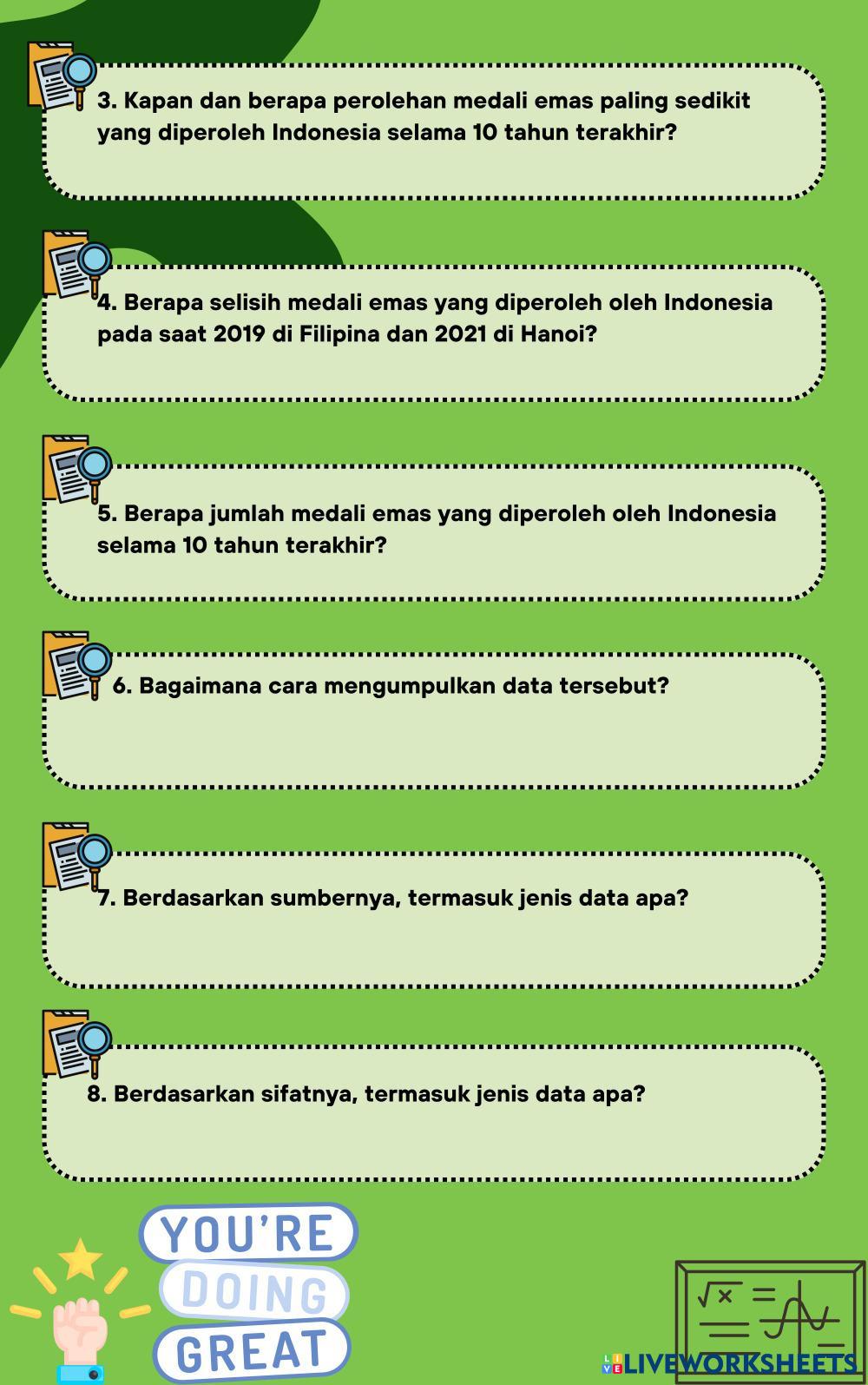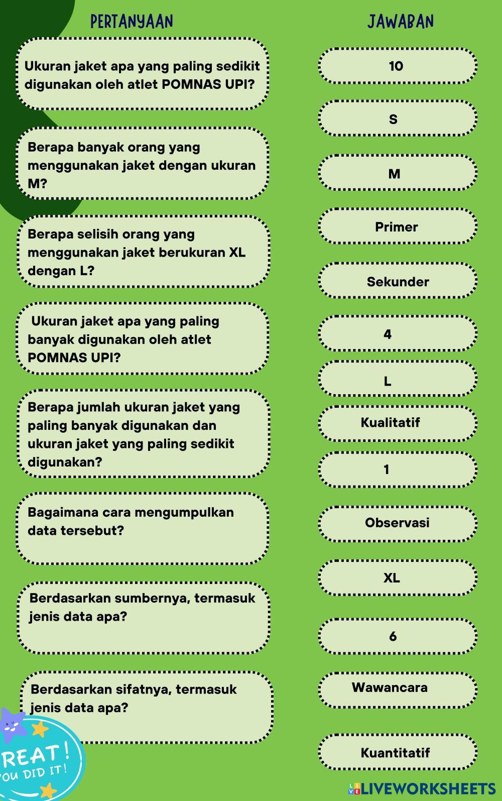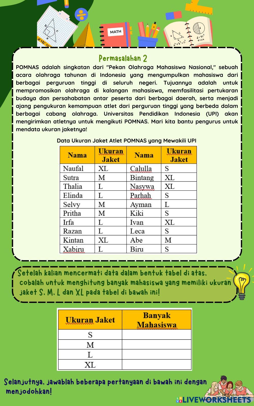 Created byThalia Rizka Amalia Bachteriawan Matematika Pengumpulan Data Age 12-16 level: 7 Indonesian Author's Instructions My Google Classroom Courses × 0 classes selected (0 students total) Quick Access Select all classes (0 classes) All Classes Loading courses... Cancel Share Share to selected Course __COURSE_NAME__ __STUDENT_NAME__ (__STUDENT_EMAIL__) Lembar Kerja Peserta Didik_ Membaca dan Mengumpulkan Data Download Worksheet Validation Check my answers Emails my answers to my teacher Full name Group/level School subject Teacher's email or key code Close Submit Validating worksheet... (12) Your answers have been sent to your teacher. Good luck! OK We encountered an error submitting your answers. Please try again. OK Advertisement | Go Ad Free Created byThalia Rizka Amalia Bachteriawan Matematika Pengumpulan Data Age 12-16 level: 7 Indonesian Author's Instructions
