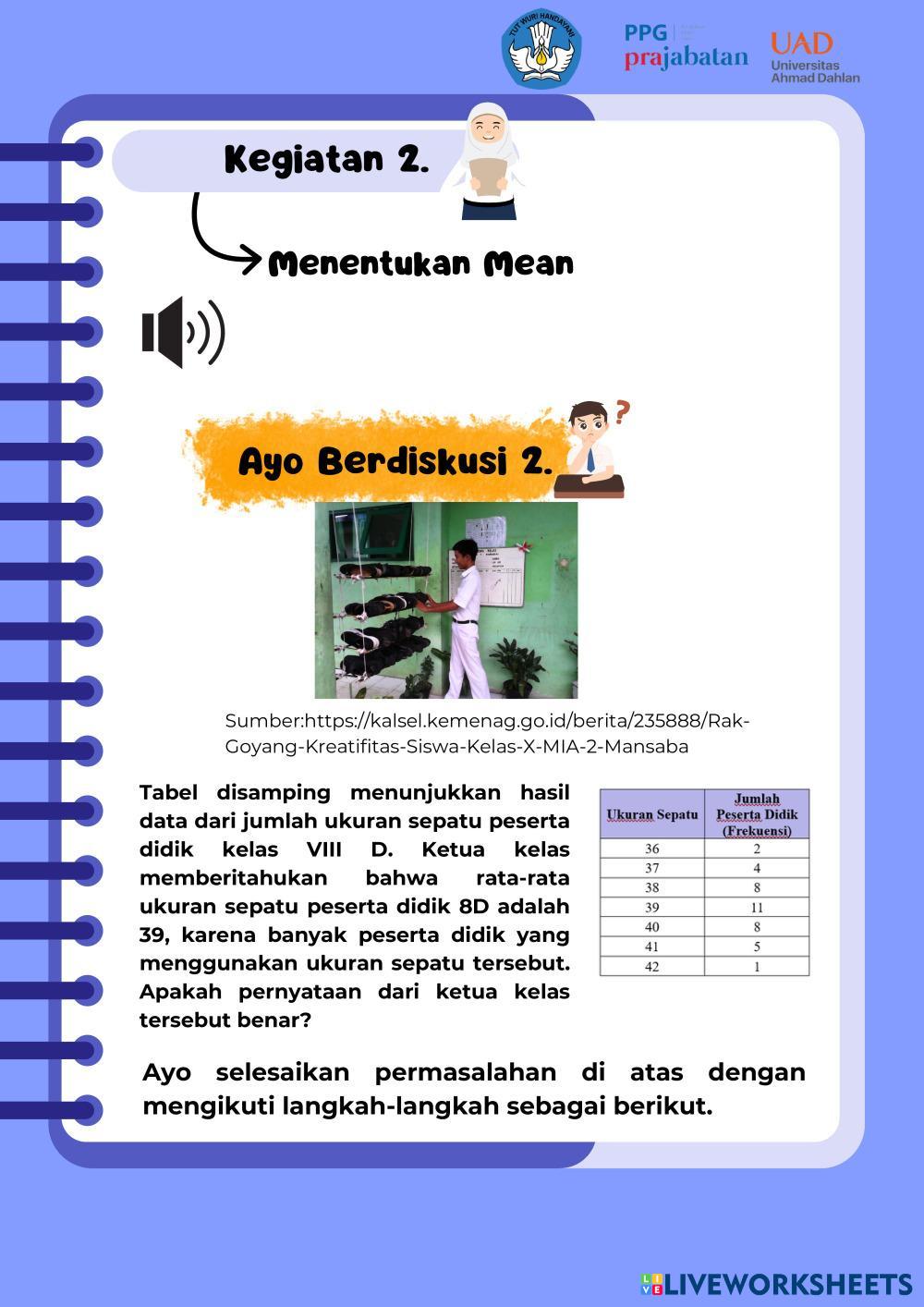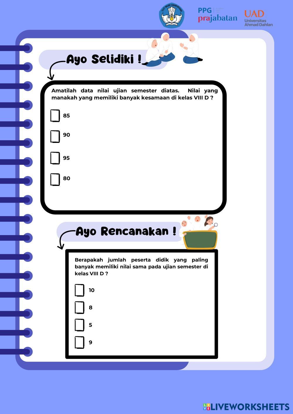 Created byJunia Matematika Statistika Ukuran pemusatan data Age 13-17 level: 8 Indonesian Author's Instructions My Google Classroom Courses × 0 classes selected (0 students total) Quick Access Select all classes (0 classes) All Classes Loading courses... Cancel Share Share to selected Course __COURSE_NAME__ __STUDENT_NAME__ (__STUDENT_EMAIL__) STATISTIKA PERTEMUAN 1 KELAS VIII Download Worksheet Validation Check my answers Emails my answers to my teacher Full name Group/level School subject Teacher's email or key code Close Submit Validating worksheet... (12) Your answers have been sent to your teacher. Good luck! OK We encountered an error submitting your answers. Please try again. OK Advertisement | Go Ad Free Created byJunia Matematika Statistika Ukuran pemusatan data Age 13-17 level: 8 Indonesian Author's Instructions