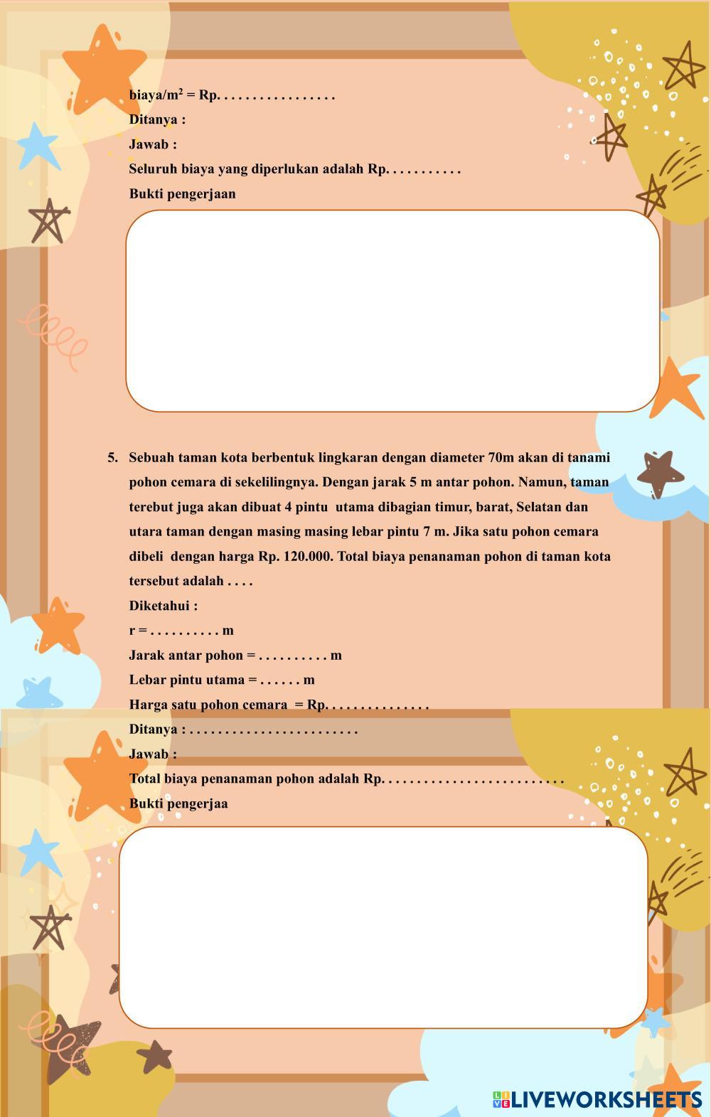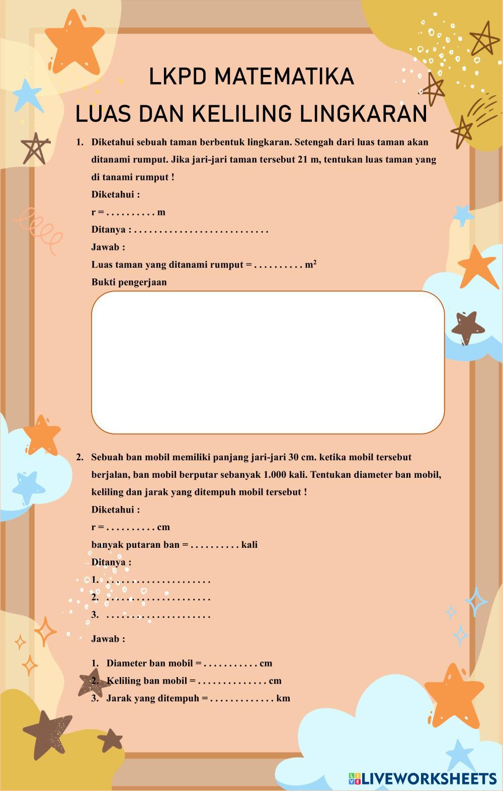 Created byFaraida Hadistian Matematika Keliling dan Luas Lingkaran Age 13-18 level: SMP Indonesian Author's Instructions My Google Classroom Courses × 0 classes selected (0 students total) Quick Access Select all classes (0 classes) All Classes Loading courses... Cancel Share Share to selected Course __COURSE_NAME__ __STUDENT_NAME__ (__STUDENT_EMAIL__) LKPD Luas dan Keliling Lingkaran Download Worksheet Validation Check my answers Emails my answers to my teacher Full name Group/level School subject Teacher's email or key code Close Submit Validating worksheet... (12) Your answers have been sent to your teacher. Good luck! OK We encountered an error submitting your answers. Please try again. OK Advertisement | Go Ad Free Created byFaraida Hadistian Matematika Keliling dan Luas Lingkaran Age 13-18 level: SMP Indonesian Author's Instructions