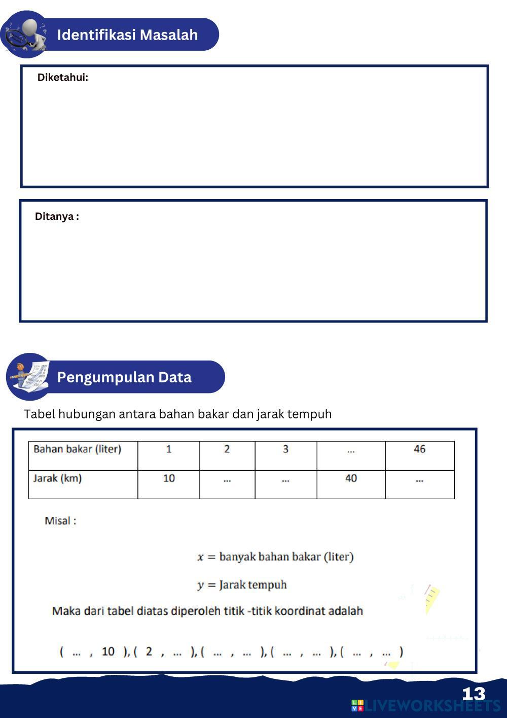 Created by Larasati95 Matematika Fungsi Linier Age 12+ level: 3 Indonesian Author's Instructions My Google Classroom Courses × 0 classes selected (0 students total) Quick Access Select all classes (0 classes) All Classes Loading courses... Cancel Share Share to selected Course __COURSE_NAME__ __STUDENT_NAME__ (__STUDENT_EMAIL__) LKPD Fungsi Linier Kegiatan 4 Download Worksheet Validation Check my answers Emails my answers to my teacher Full name Group/level School subject Teacher's email or key code Close Submit Validating worksheet... (12) Your answers have been sent to your teacher. Good luck! OK We encountered an error submitting your answers. Please try again. OK Advertisement | Go Ad Free Created by Larasati95 Matematika Fungsi Linier Age 12+ level: 3 Indonesian Author's Instructions