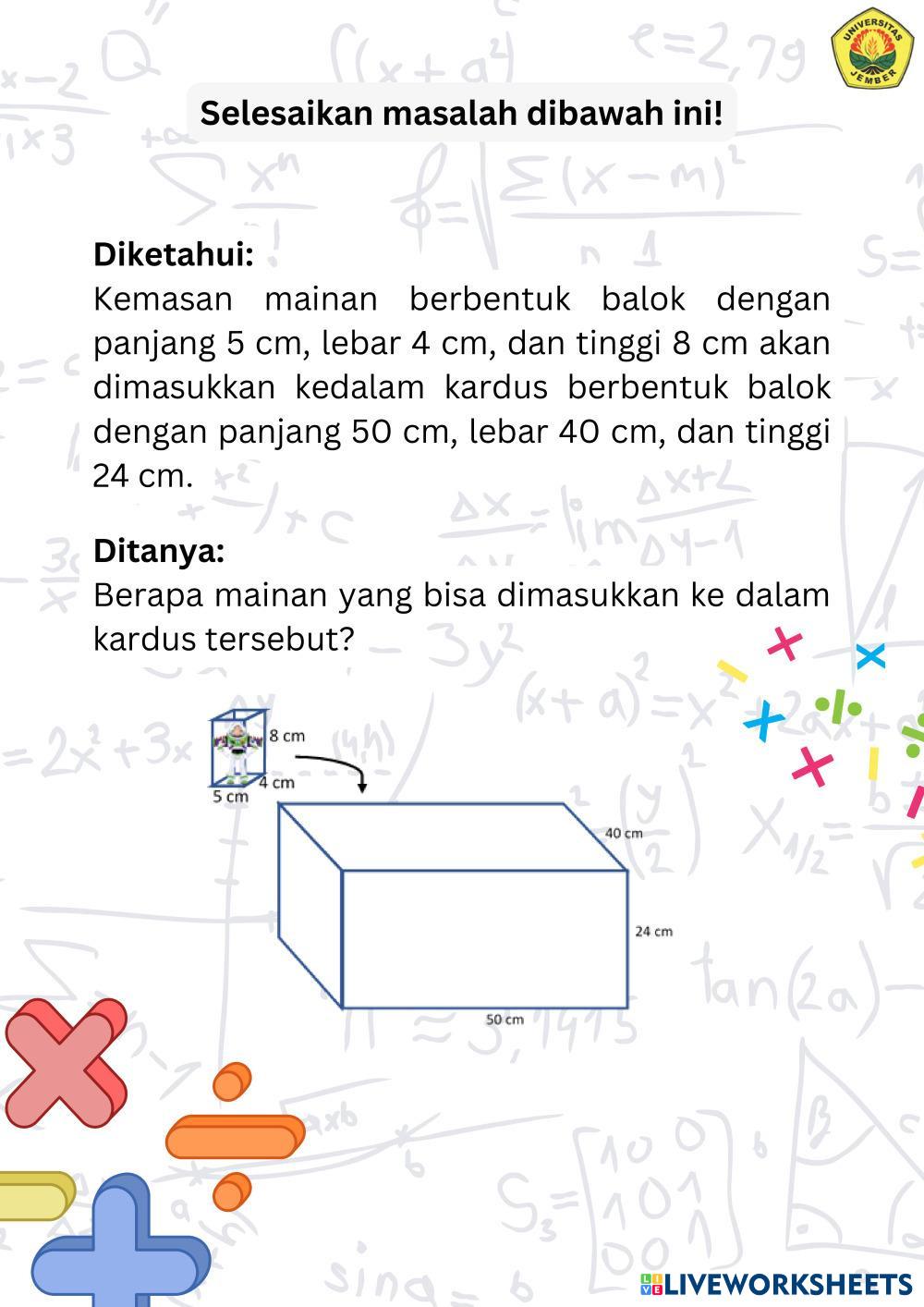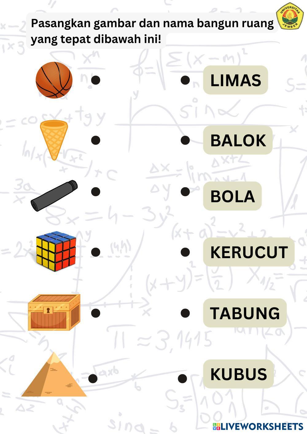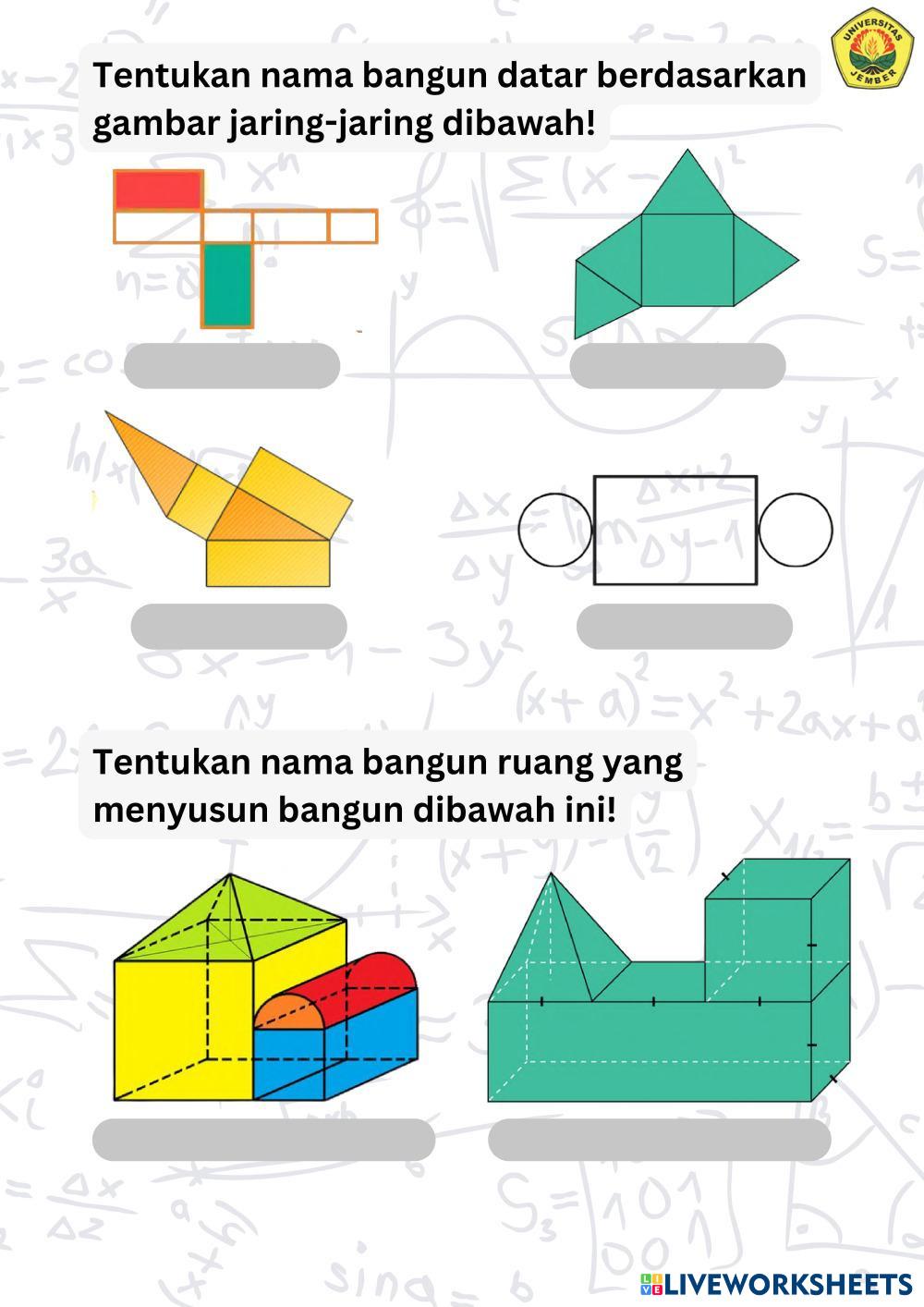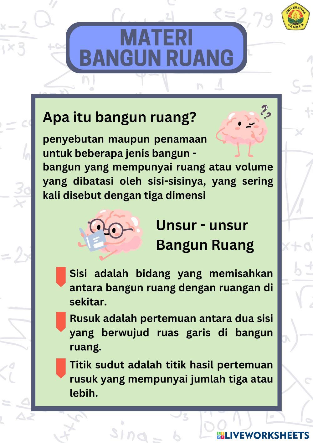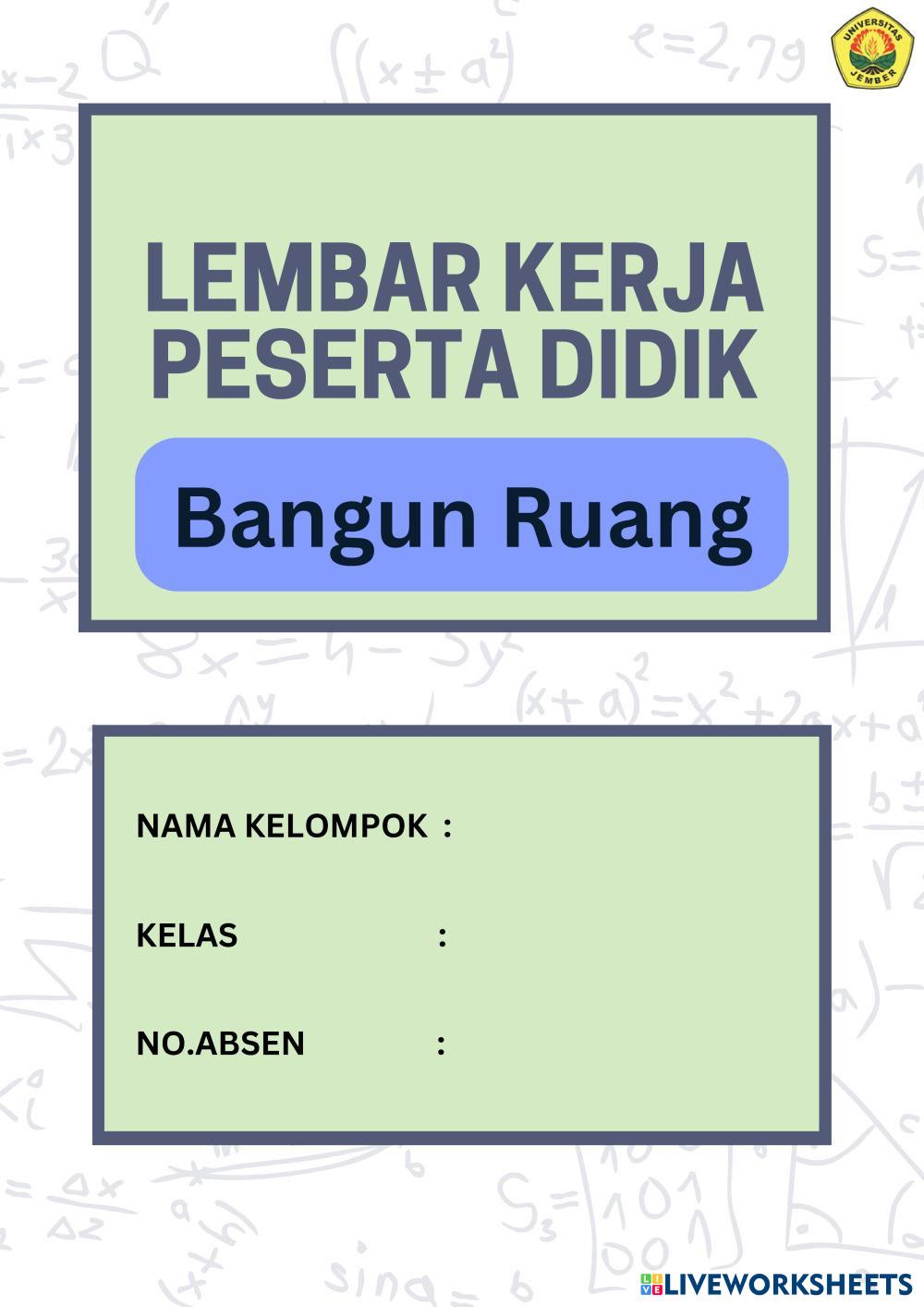 Created byMUHAMMAD ABDILLAH RAHMADANI WIJONO PUTRO Matematika Bangun ruang Age 10-14 level: 5-8 Indonesian Author's Instructions HOTS based My Google Classroom Courses × 0 classes selected (0 students total) Quick Access Select all classes (0 classes) All Classes Loading courses... Cancel Share Share to selected Course __COURSE_NAME__ __STUDENT_NAME__ (__STUDENT_EMAIL__) LKPD Bangun Ruang Kelas Download Worksheet Validation Check my answers Emails my answers to my teacher Full name Group/level School subject Teacher's email or key code Close Submit Validating worksheet... (12) Your answers have been sent to your teacher. Good luck! OK We encountered an error submitting your answers. Please try again. OK Advertisement | Go Ad Free Created byMUHAMMAD ABDILLAH RAHMADANI WIJONO PUTRO Matematika Bangun ruang Age 10-14 level: 5-8 Indonesian Author's Instructions HOTS based