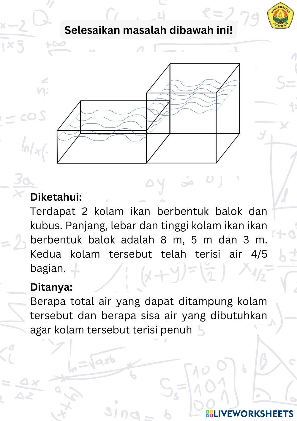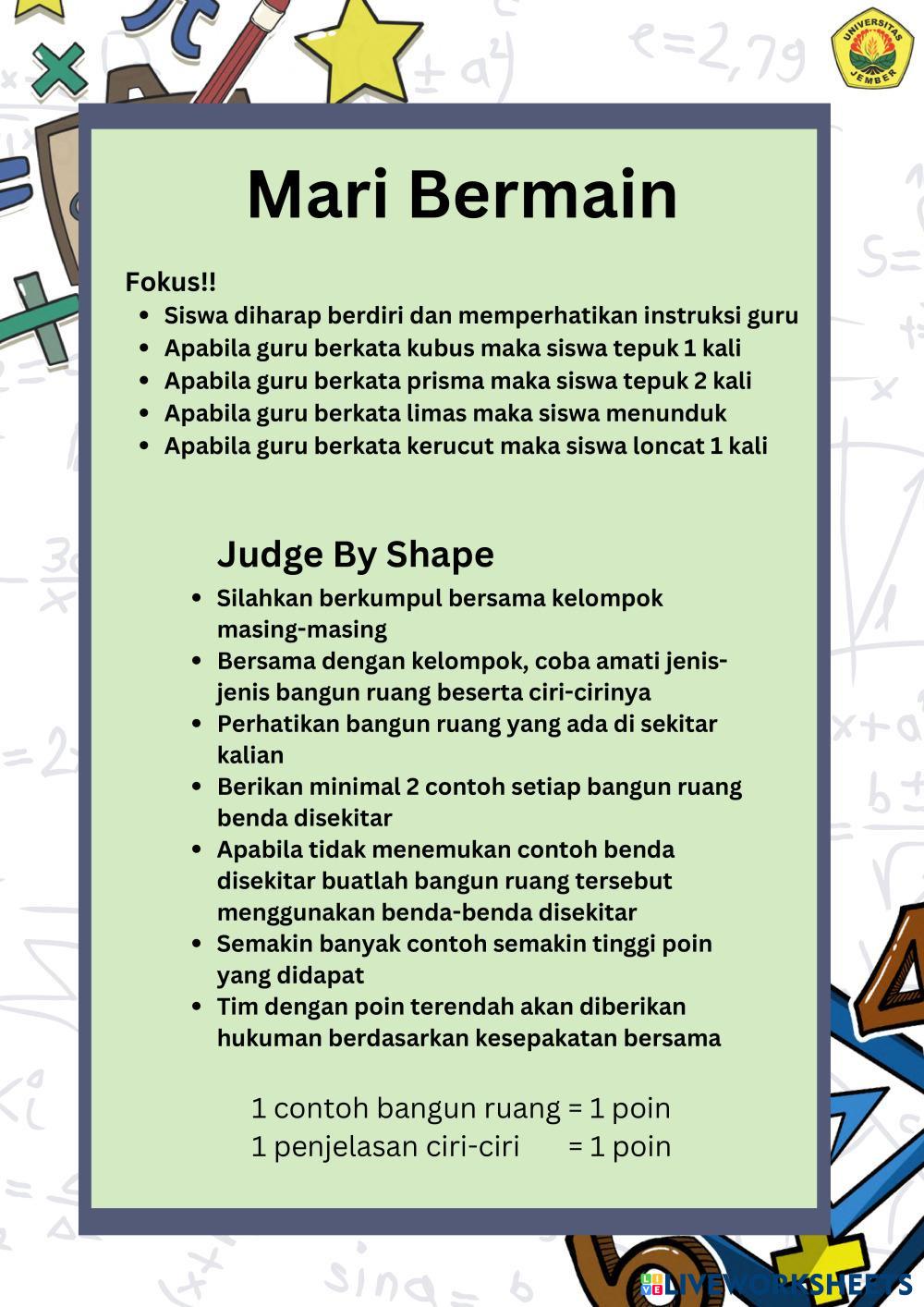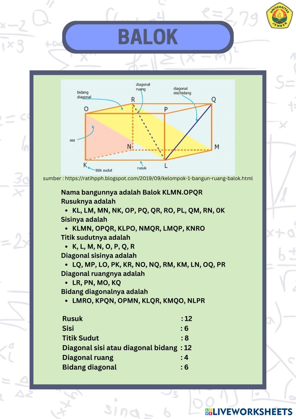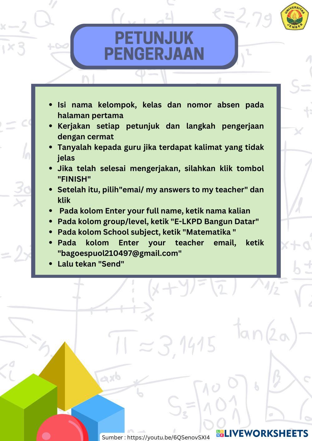 Created byMUHAMMAD ABDILLAH RAHMADANI WIJONO PUTRO Matematika Bangun ruang Age 10-14 level: 5-8 Indonesian Author's Instructions HOTS based My Google Classroom Courses × 0 classes selected (0 students total) Quick Access Select all classes (0 classes) All Classes Loading courses... Cancel Share Share to selected Course __COURSE_NAME__ __STUDENT_NAME__ (__STUDENT_EMAIL__) LKPD Bangun Ruang Kelas Download Worksheet Validation Check my answers Emails my answers to my teacher Full name Group/level School subject Teacher's email or key code Close Submit Validating worksheet... (12) Your answers have been sent to your teacher. Good luck! OK We encountered an error submitting your answers. Please try again. OK Advertisement | Go Ad Free Created byMUHAMMAD ABDILLAH RAHMADANI WIJONO PUTRO Matematika Bangun ruang Age 10-14 level: 5-8 Indonesian Author's Instructions HOTS based