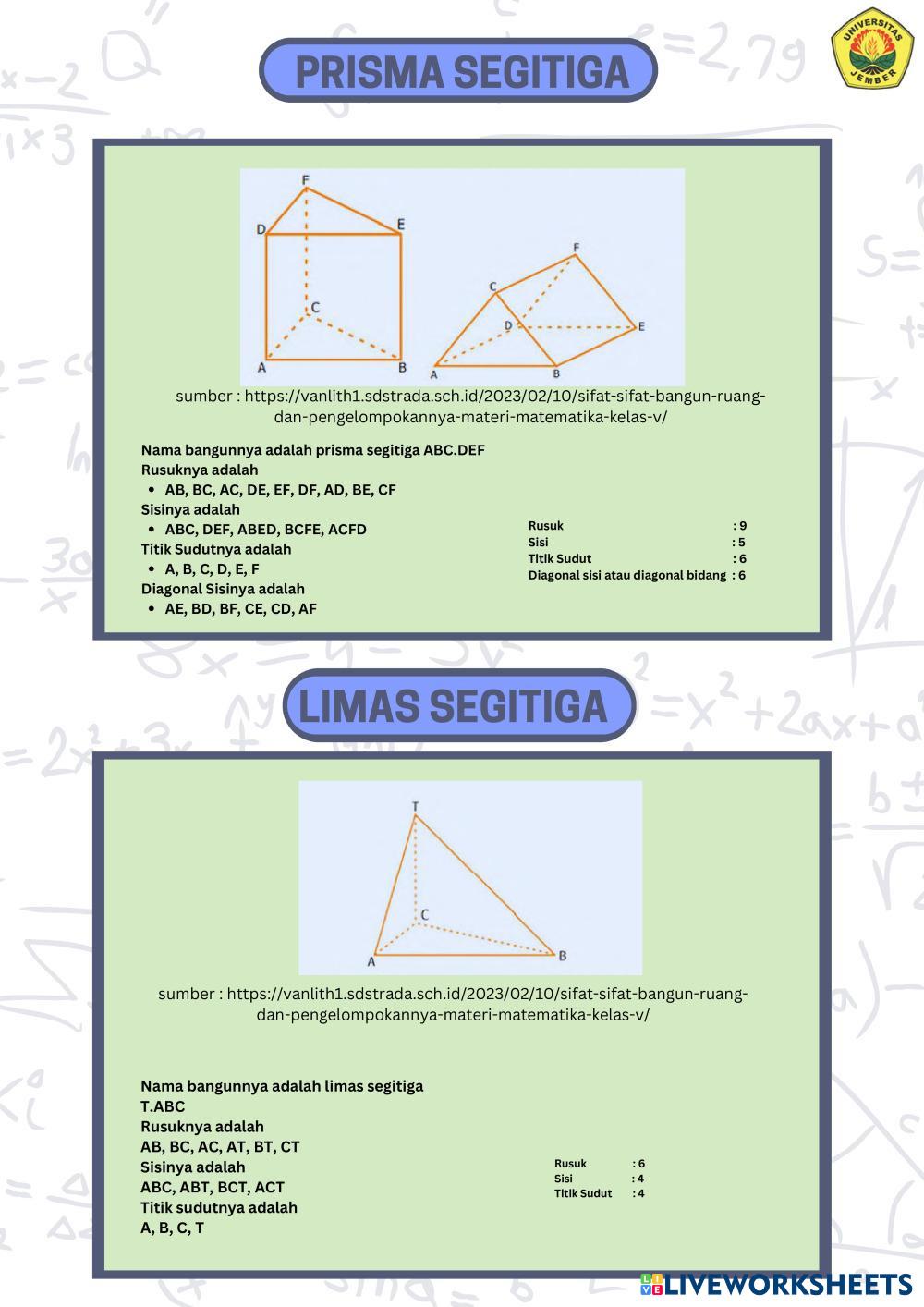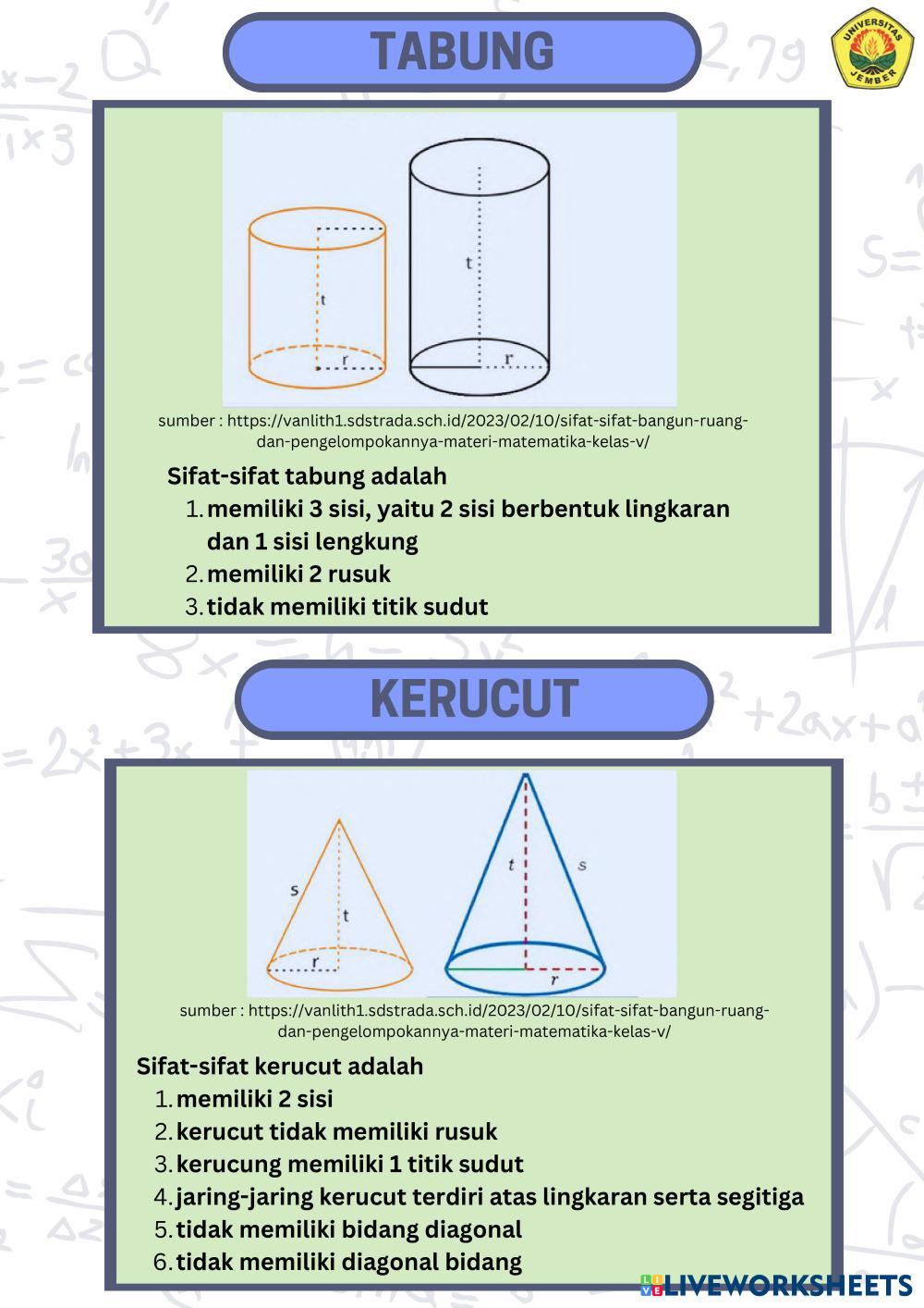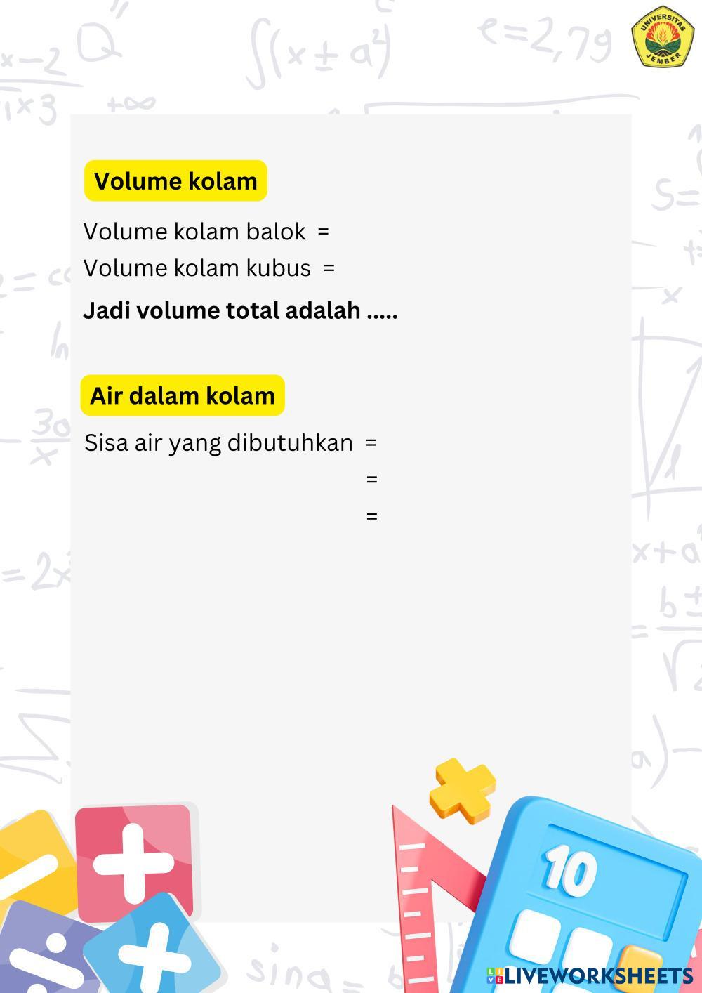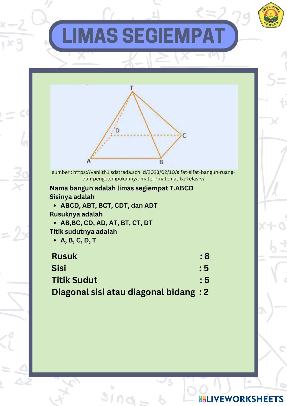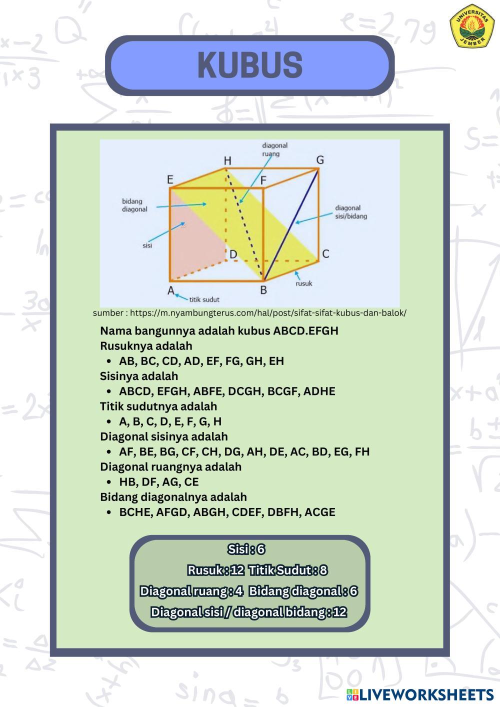 Created byMUHAMMAD ABDILLAH RAHMADANI WIJONO PUTRO Matematika Bangun ruang Age 10-14 level: 5-8 Indonesian Author's Instructions HOTS based My Google Classroom Courses × 0 classes selected (0 students total) Quick Access Select all classes (0 classes) All Classes Loading courses... Cancel Share Share to selected Course __COURSE_NAME__ __STUDENT_NAME__ (__STUDENT_EMAIL__) LKPD Bangun Ruang Kelas Download Worksheet Validation Check my answers Emails my answers to my teacher Full name Group/level School subject Teacher's email or key code Close Submit Validating worksheet... (12) Your answers have been sent to your teacher. Good luck! OK We encountered an error submitting your answers. Please try again. OK Advertisement | Go Ad Free Created byMUHAMMAD ABDILLAH RAHMADANI WIJONO PUTRO Matematika Bangun ruang Age 10-14 level: 5-8 Indonesian Author's Instructions HOTS based