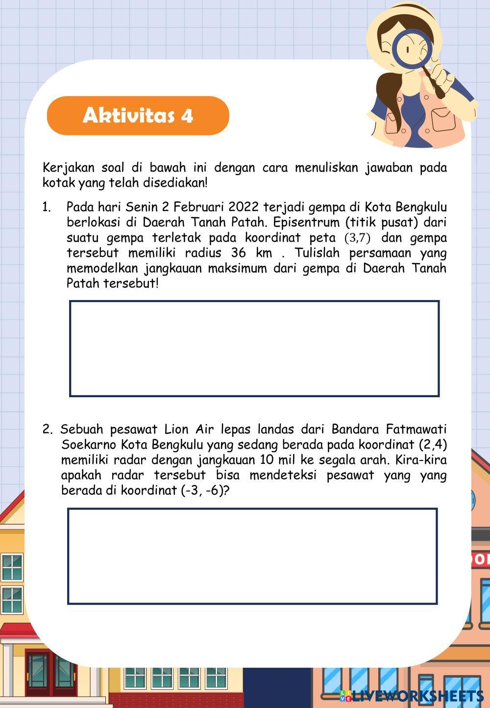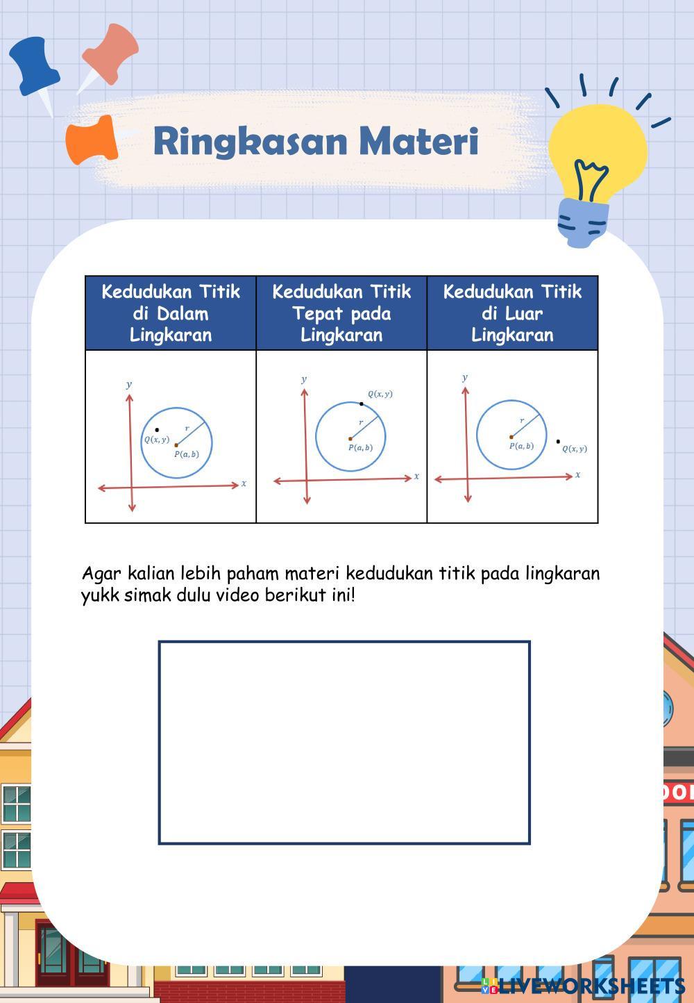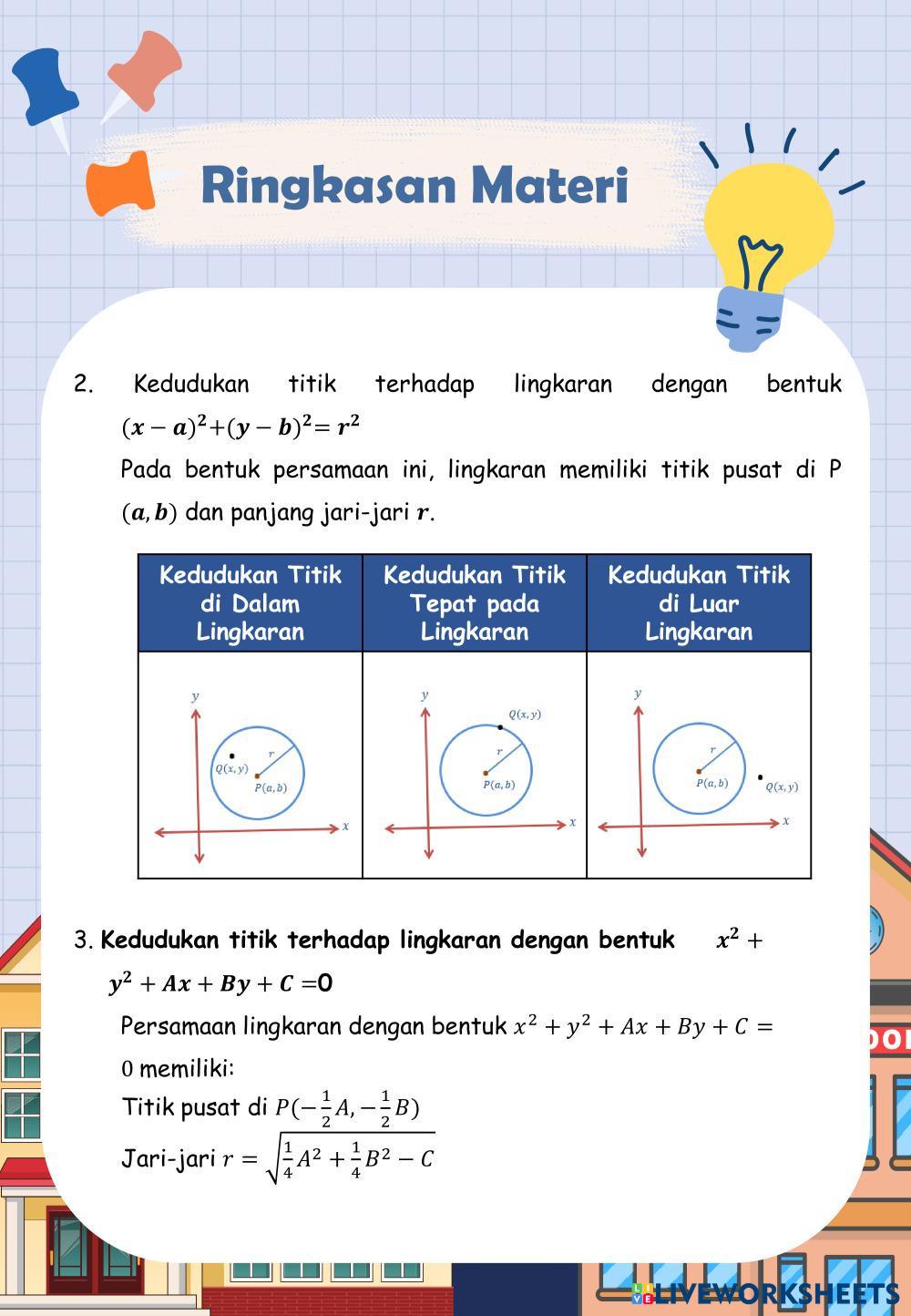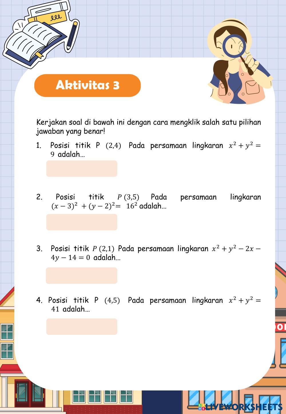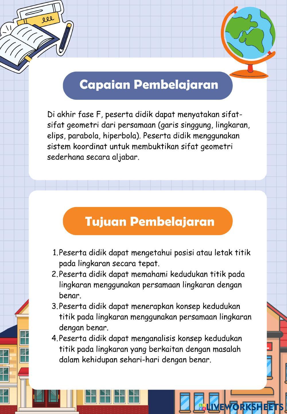 Created byEggy Anggraini Matematika Kedudukan titik terhadap lingkaran Age 10+ level: SMA Indonesian Author's Instructions My Google Classroom Courses × 0 classes selected (0 students total) Quick Access Select all classes (0 classes) All Classes Loading courses... Cancel Share Share to selected Course __COURSE_NAME__ __STUDENT_NAME__ (__STUDENT_EMAIL__) KEDUDUKAN TITIK PADA LINGKARAN Download Worksheet Validation Check my answers Emails my answers to my teacher Full name Group/level School subject Teacher's email or key code Close Submit Validating worksheet... (12) Your answers have been sent to your teacher. Good luck! OK We encountered an error submitting your answers. Please try again. OK Advertisement | Go Ad Free Created byEggy Anggraini Matematika Kedudukan titik terhadap lingkaran Age 10+ level: SMA Indonesian Author's Instructions