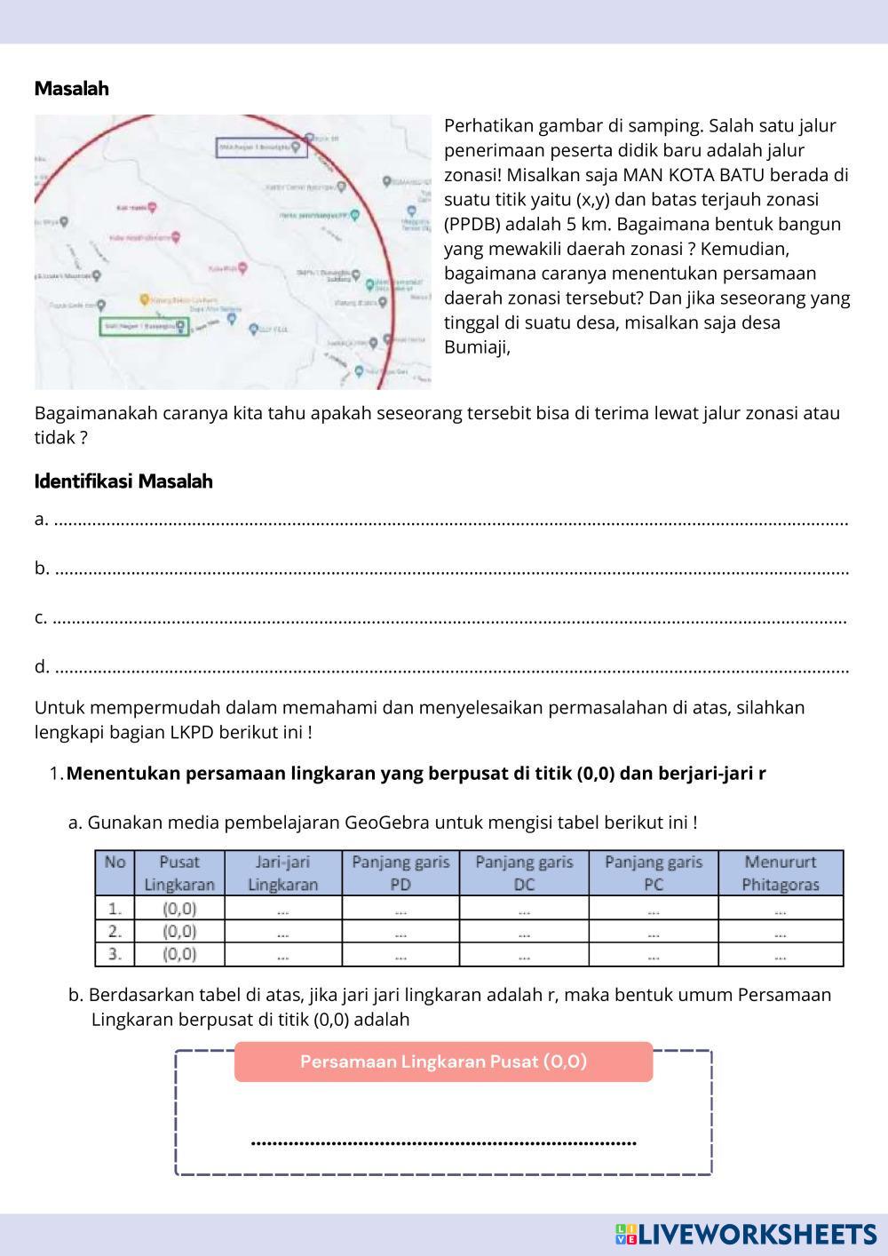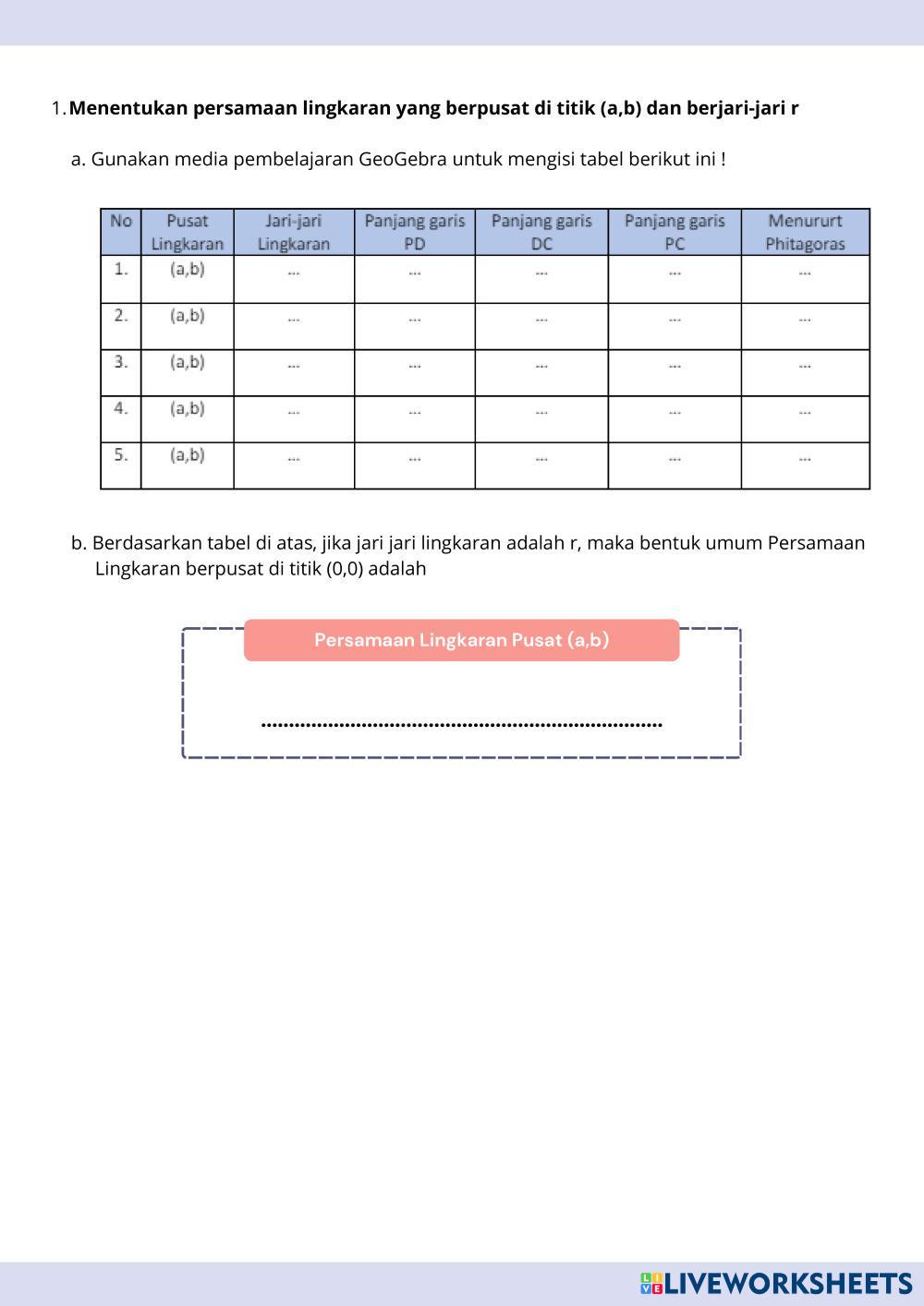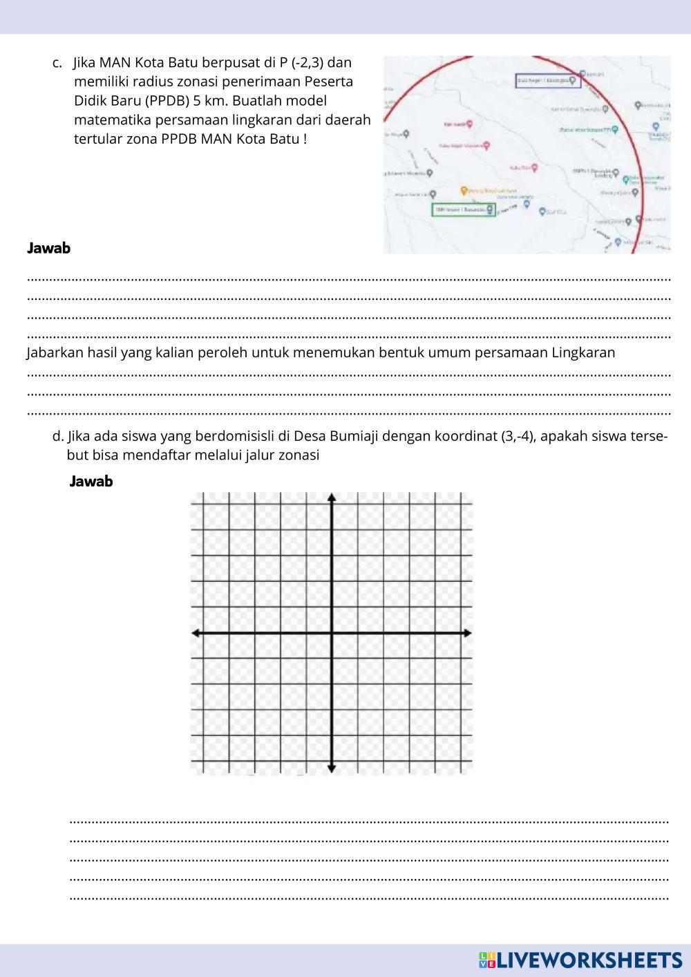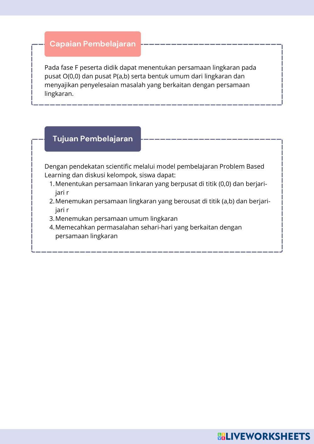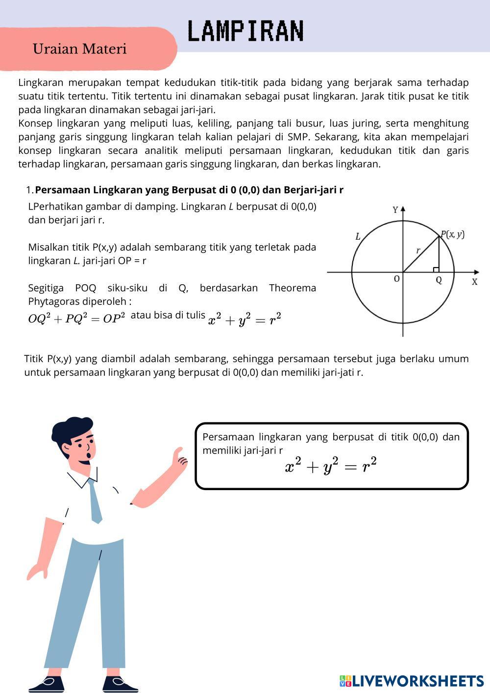 Created bymuthia ghassani Matematika Persamaan Lingkaran Age 17+ level: 11 Indonesian Author's Instructions My Google Classroom Courses × 0 classes selected (0 students total) Quick Access Select all classes (0 classes) All Classes Loading courses... Cancel Share Share to selected Course __COURSE_NAME__ __STUDENT_NAME__ (__STUDENT_EMAIL__) Persamaan Lingkaran Worksheet Download Worksheet Validation Check my answers Emails my answers to my teacher Full name Group/level School subject Teacher's email or key code Close Submit Validating worksheet... (12) Your answers have been sent to your teacher. Good luck! OK We encountered an error submitting your answers. Please try again. OK Advertisement | Go Ad Free Created bymuthia ghassani Matematika Persamaan Lingkaran Age 17+ level: 11 Indonesian Author's Instructions