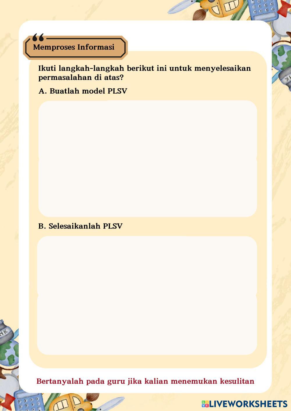 Created byRidwan Sukma Matematika Persamaan Linear Satu Variabel (PLSV) Age 14+ level: 7 Indonesian Author's Instructions Persamaan Linear Satu Variabel (PLSV) My Google Classroom Courses × 0 classes selected (0 students total) Quick Access Select all classes (0 classes) All Classes Loading courses... Cancel Share Share to selected Course __COURSE_NAME__ __STUDENT_NAME__ (__STUDENT_EMAIL__) Persamaan Linear Satu Variabel (PLSV) Download Worksheet Validation Check my answers Emails my answers to my teacher Full name Group/level School subject Teacher's email or key code Close Submit Validating worksheet... (12) Your answers have been sent to your teacher. Good luck! OK We encountered an error submitting your answers. Please try again. OK Advertisement | Go Ad Free Created byRidwan Sukma Matematika Persamaan Linear Satu Variabel (PLSV) Age 14+ level: 7 Indonesian Author's Instructions Persamaan Linear Satu Variabel (PLSV)