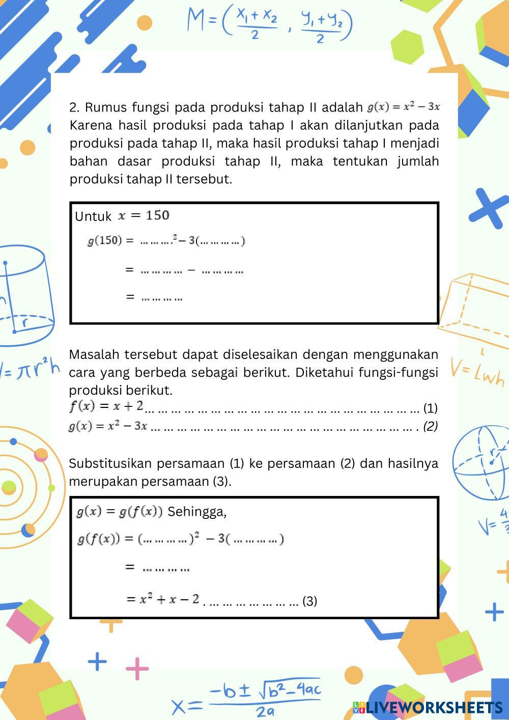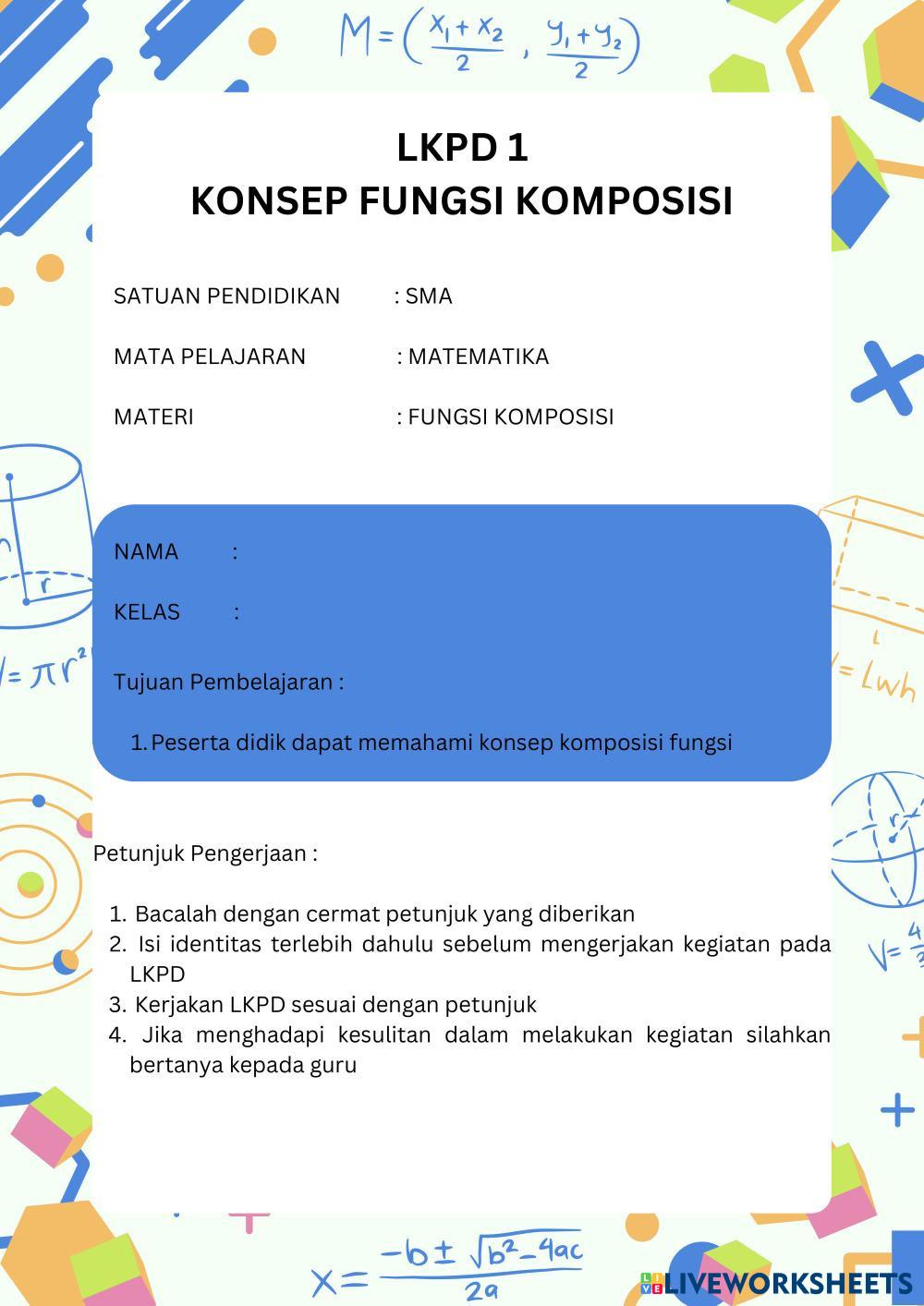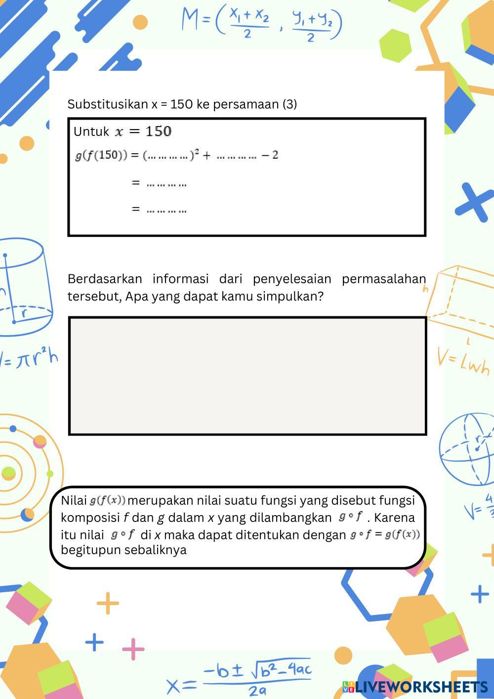 Created by Fanang01 Matematika Fungsi Komposisi dan Fungsi Invers Age 17+ level: 11 Indonesian Author's Instructions My Google Classroom Courses × 0 classes selected (0 students total) Quick Access Select all classes (0 classes) All Classes Loading courses... Cancel Share Share to selected Course __COURSE_NAME__ __STUDENT_NAME__ (__STUDENT_EMAIL__) LKPD 1 REVISI Download Worksheet Validation Check my answers Emails my answers to my teacher Full name Group/level School subject Teacher's email or key code Close Submit Validating worksheet... (12) Your answers have been sent to your teacher. Good luck! OK We encountered an error submitting your answers. Please try again. OK Advertisement | Go Ad Free Created by Fanang01 Matematika Fungsi Komposisi dan Fungsi Invers Age 17+ level: 11 Indonesian Author's Instructions