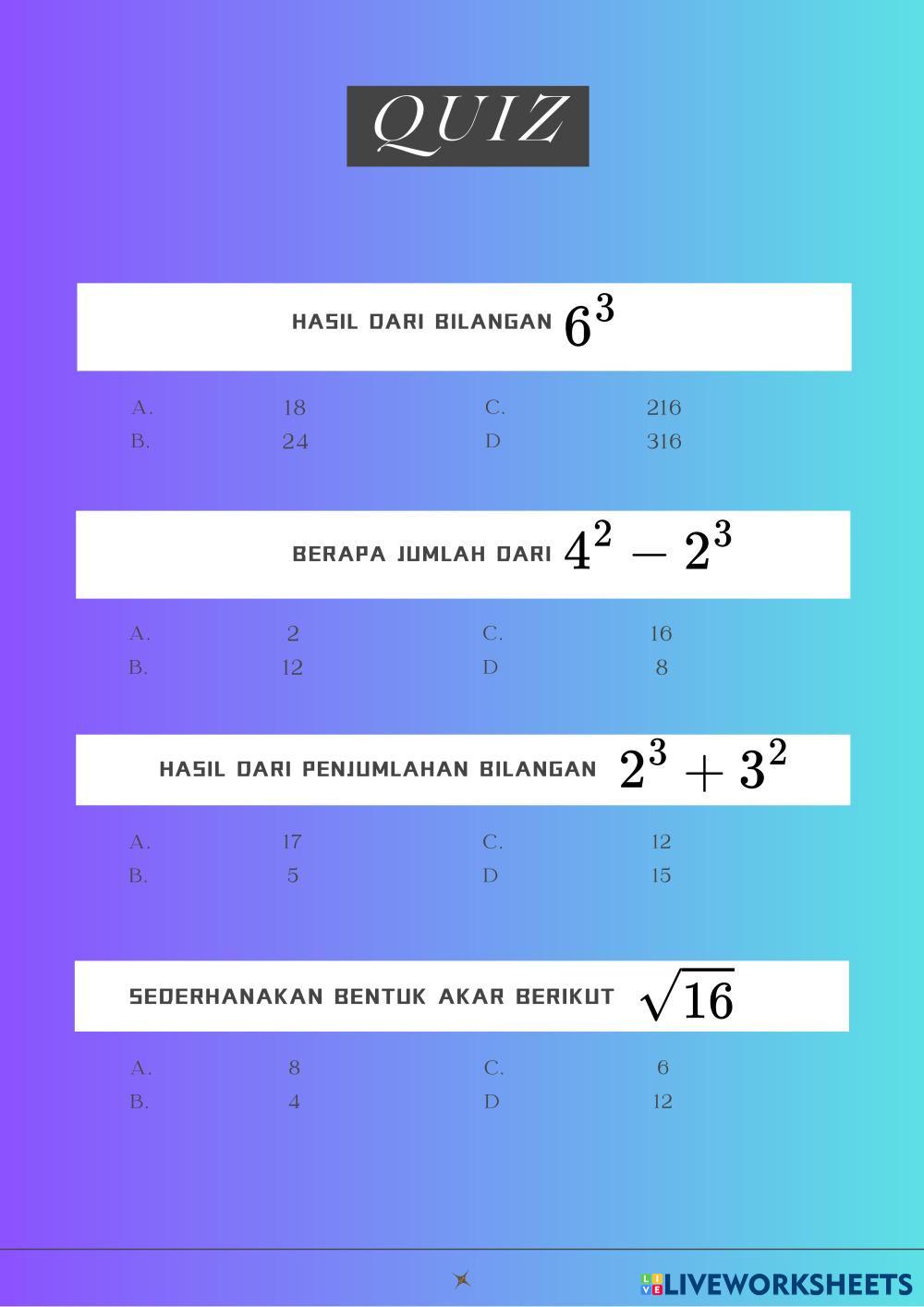 Created byfifi sufiah Matematika Bilangan Berpangkat dan Bentuk Akar Age 13-17 level: 8 Indonesian Author's Instructions My Google Classroom Courses × 0 classes selected (0 students total) Quick Access Select all classes (0 classes) All Classes Loading courses... Cancel Share Share to selected Course __COURSE_NAME__ __STUDENT_NAME__ (__STUDENT_EMAIL__) LKPD Download Worksheet Validation Check my answers Emails my answers to my teacher Full name Group/level School subject Teacher's email or key code Close Submit Validating worksheet... (12) Your answers have been sent to your teacher. Good luck! OK We encountered an error submitting your answers. Please try again. OK Advertisement | Go Ad Free Created byfifi sufiah Matematika Bilangan Berpangkat dan Bentuk Akar Age 13-17 level: 8 Indonesian Author's Instructions
