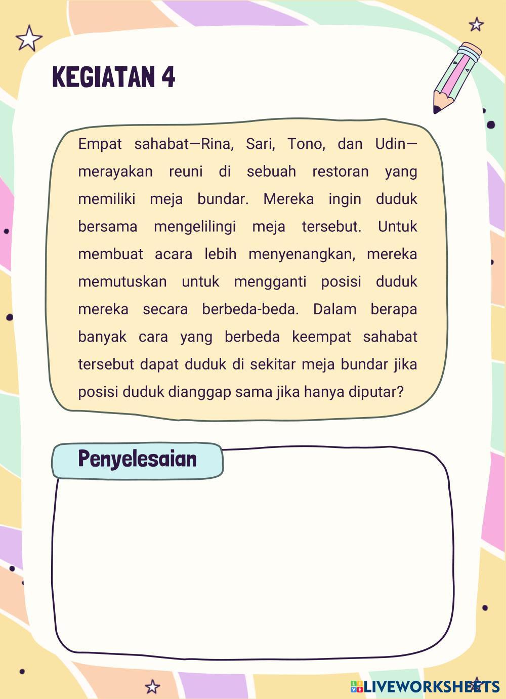 Created byTyurma L Matematika Permutasi Age 15+ level: 12 Indonesian Author's Instructions My Google Classroom Courses × 0 classes selected (0 students total) Quick Access Select all classes (0 classes) All Classes Loading courses... Cancel Share Share to selected Course __COURSE_NAME__ __STUDENT_NAME__ (__STUDENT_EMAIL__) LKPD PERMUTASI Download Worksheet Validation Check my answers Emails my answers to my teacher Full name Group/level School subject Teacher's email or key code Close Submit Validating worksheet... (12) Your answers have been sent to your teacher. Good luck! OK We encountered an error submitting your answers. Please try again. OK Advertisement | Go Ad Free Created byTyurma L Matematika Permutasi Age 15+ level: 12 Indonesian Author's Instructions
