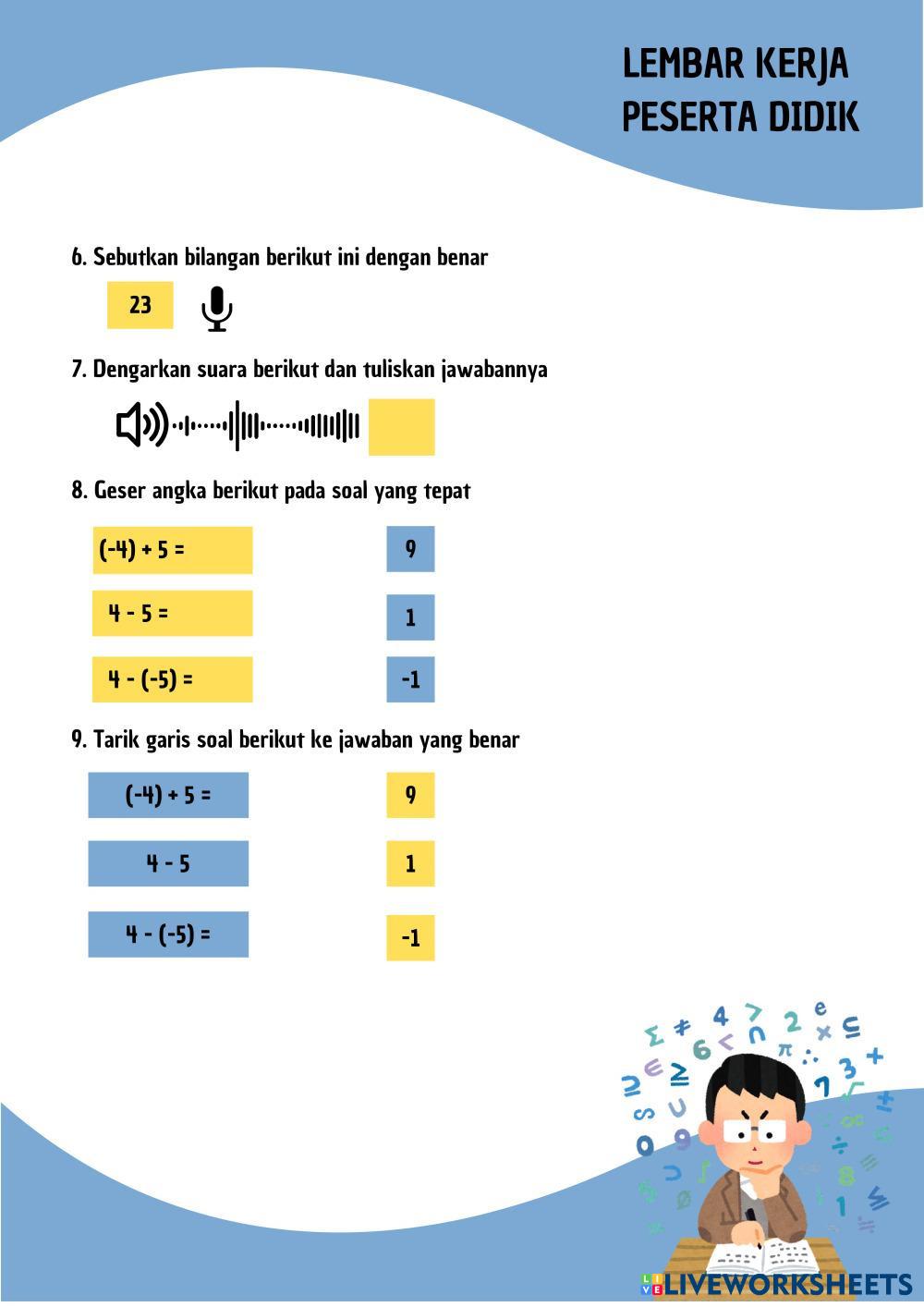 Created byAnnisaq Ardies Matematika Integer Age 11-15 level: 7 Indonesian Author's Instructions My Google Classroom Courses × 0 classes selected (0 students total) Quick Access Select all classes (0 classes) All Classes Loading courses... Cancel Share Share to selected Course __COURSE_NAME__ __STUDENT_NAME__ (__STUDENT_EMAIL__) Bilangan Bulat Kelas 7 Download Worksheet Validation Check my answers Emails my answers to my teacher Full name Group/level School subject Teacher's email or key code Close Submit Validating worksheet... (12) Your answers have been sent to your teacher. Good luck! OK We encountered an error submitting your answers. Please try again. OK Advertisement | Go Ad Free Created byAnnisaq Ardies Matematika Integer Age 11-15 level: 7 Indonesian Author's Instructions