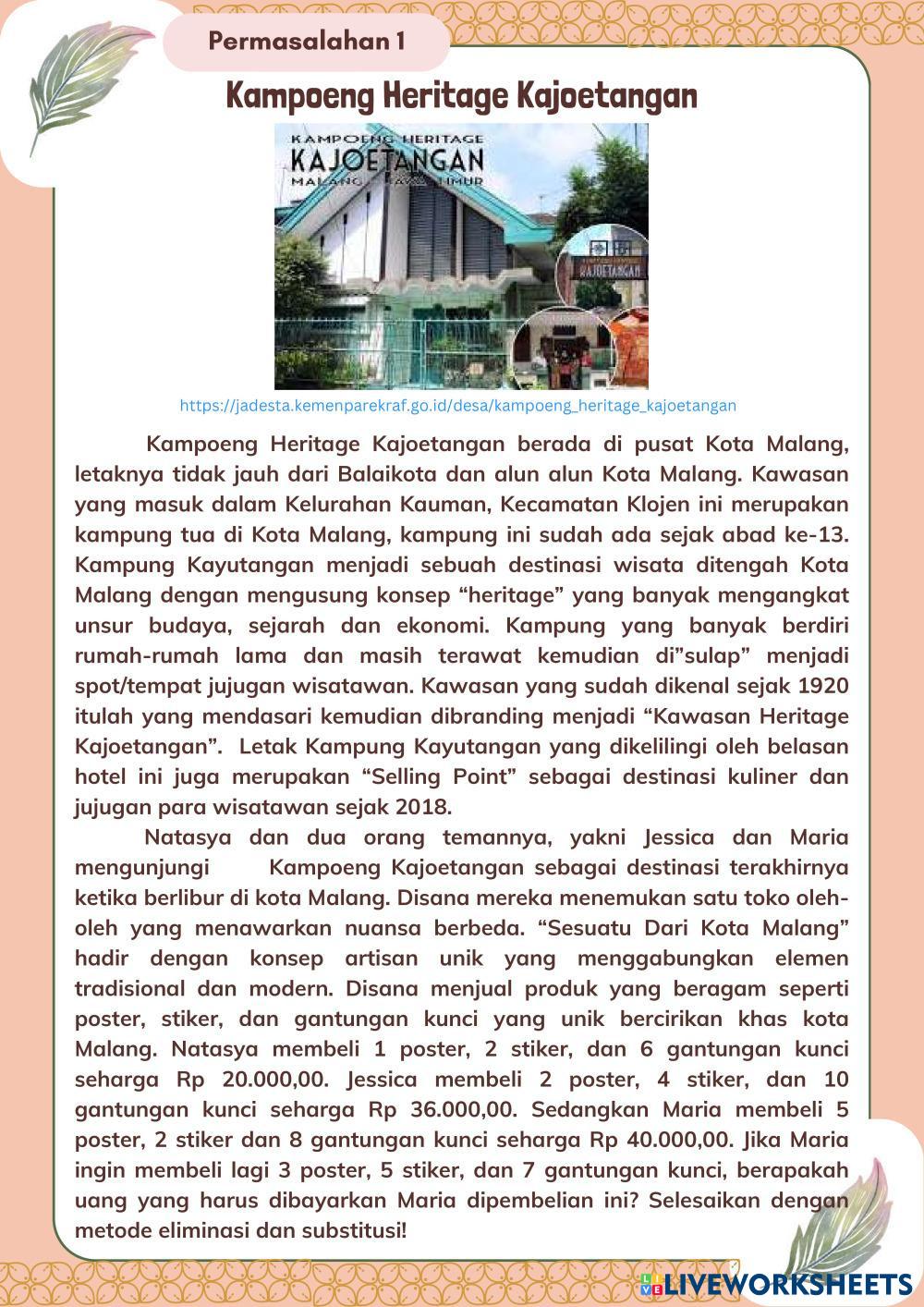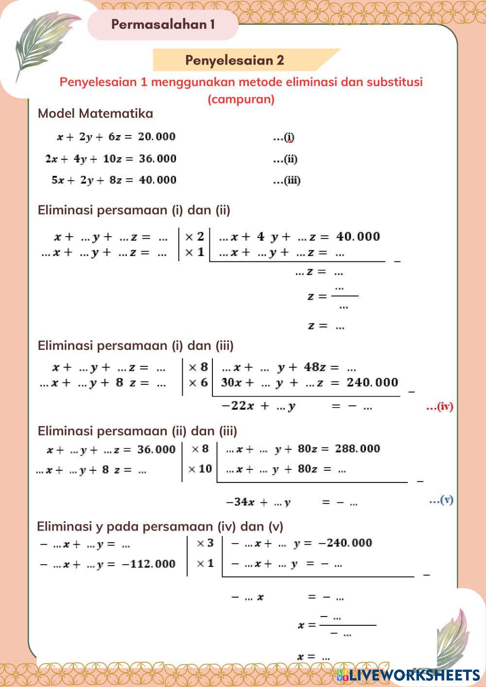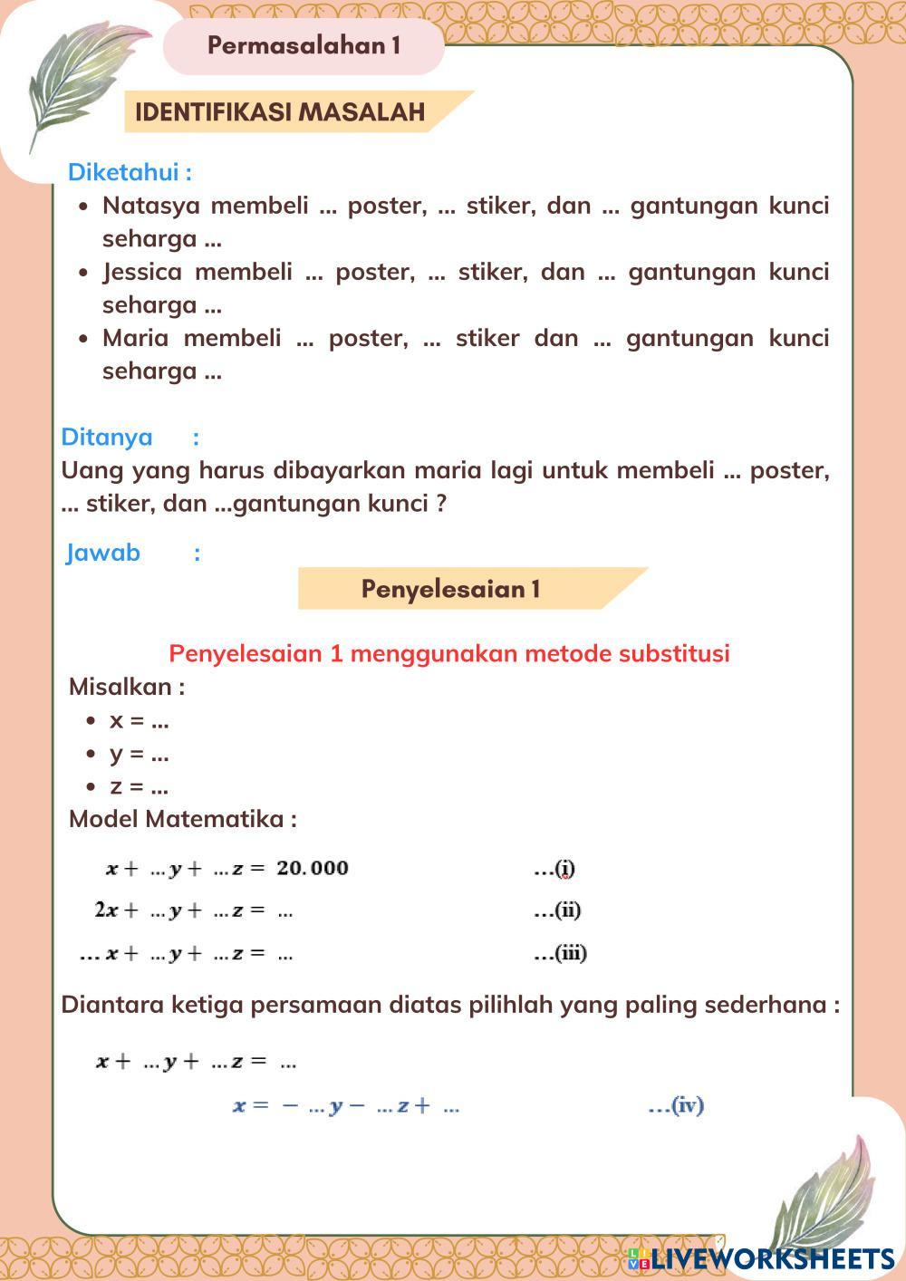Created byDwi tania MATEMATIKA Sistem Persamaan Linear Tiga Variabel (SPLTV) Age 15+ level: 10 Indonesian Author's Instructions My Google Classroom Courses × 0 classes selected (0 students total) Quick Access Select all classes (0 classes) All Classes Loading courses... Cancel Share Share to selected Course __COURSE_NAME__ __STUDENT_NAME__ (__STUDENT_EMAIL__) LKPD CRT SPLTV Download Worksheet Validation Check my answers Emails my answers to my teacher Full name Group/level School subject Teacher's email or key code Close Submit Validating worksheet... (12) Your answers have been sent to your teacher. Good luck! OK We encountered an error submitting your answers. Please try again. OK Advertisement | Go Ad Free Created byDwi tania MATEMATIKA Sistem Persamaan Linear Tiga Variabel (SPLTV) Age 15+ level: 10 Indonesian Author's Instructions