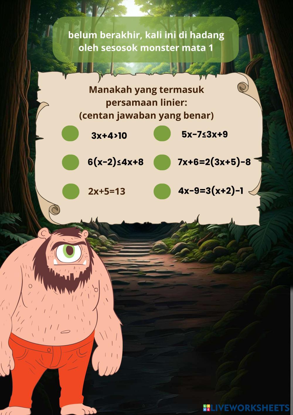 Created byShafiyah Shabihah Matematika Persamaan dan Pertidaksamaan Linear Satu Variabel Age 13+ level: 8 Indonesian Author's Instructions My Google Classroom Courses × 0 classes selected (0 students total) Quick Access Select all classes (0 classes) All Classes Loading courses... Cancel Share Share to selected Course __COURSE_NAME__ __STUDENT_NAME__ (__STUDENT_EMAIL__) Persamaan dan Pertidaksamaan Linear Download Worksheet Validation Check my answers Emails my answers to my teacher Full name Group/level School subject Teacher's email or key code Close Submit Validating worksheet... (12) Your answers have been sent to your teacher. Good luck! OK We encountered an error submitting your answers. Please try again. OK Advertisement | Go Ad Free Created byShafiyah Shabihah Matematika Persamaan dan Pertidaksamaan Linear Satu Variabel Age 13+ level: 8 Indonesian Author's Instructions