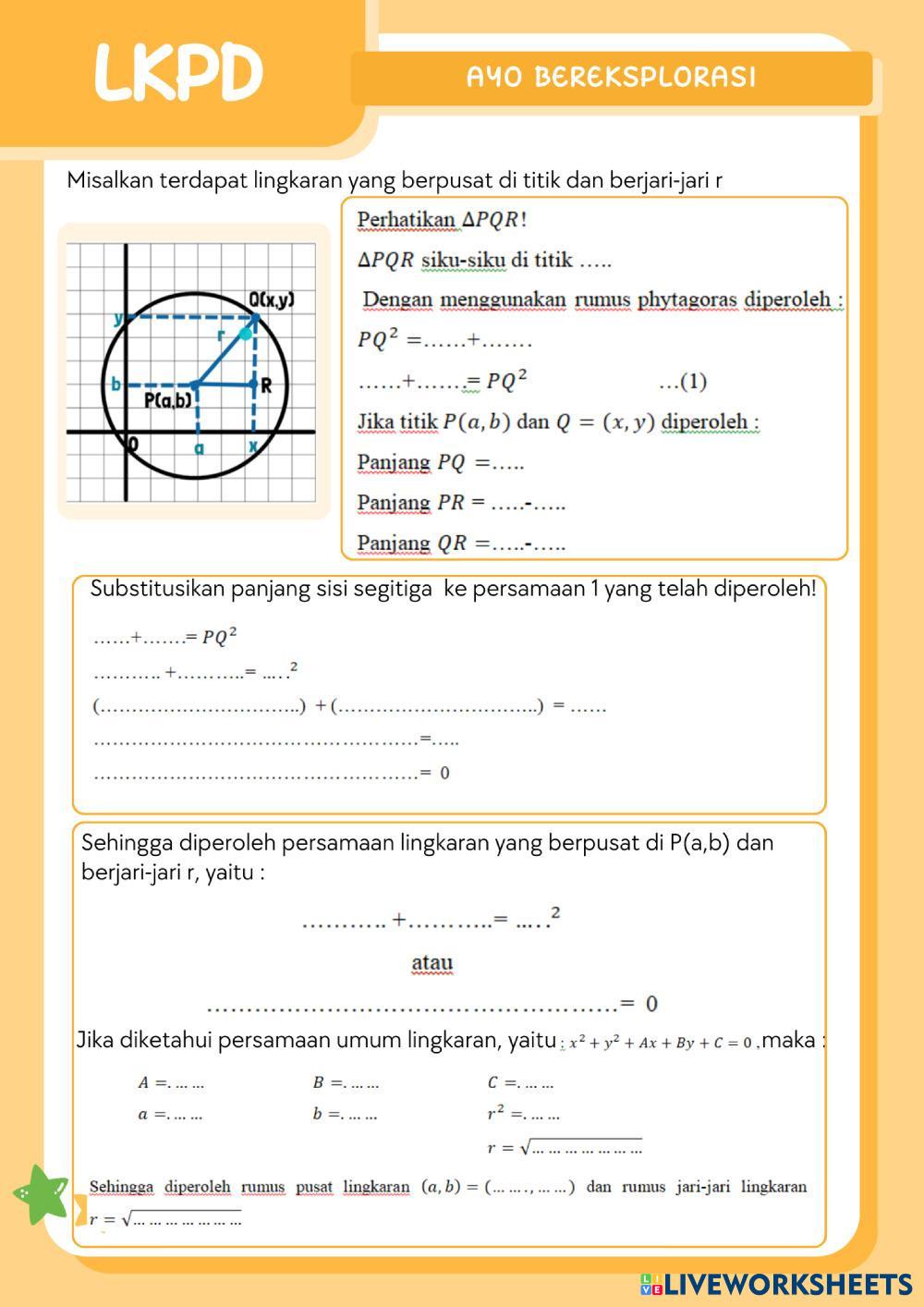 Created byLilia Gina Matematika Persamaan Lingkaran Age 16+ level: SMA Indonesian Author's Instructions My Google Classroom Courses × 0 classes selected (0 students total) Quick Access Select all classes (0 classes) All Classes Loading courses... Cancel Share Share to selected Course __COURSE_NAME__ __STUDENT_NAME__ (__STUDENT_EMAIL__) LKPD Persamaan Lingkaran Berpusat di titik (a,b) Download Worksheet Validation Check my answers Emails my answers to my teacher Full name Group/level School subject Teacher's email or key code Close Submit Validating worksheet... (12) Your answers have been sent to your teacher. Good luck! OK We encountered an error submitting your answers. Please try again. OK Advertisement | Go Ad Free Created byLilia Gina Matematika Persamaan Lingkaran Age 16+ level: SMA Indonesian Author's Instructions