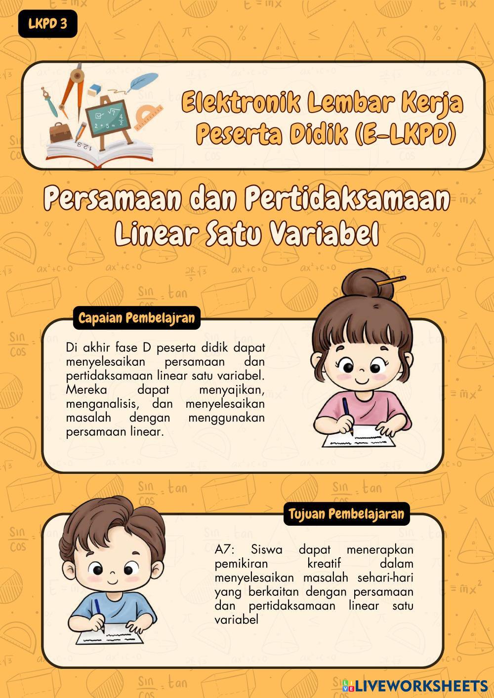 Created byGellegraA3 Matematika Persamaan dan Pertidaksamaan Linear Satu Variabel Age 13+ level: 7 Indonesian Author's Instructions My Google Classroom Courses × 0 classes selected (0 students total) Quick Access Select all classes (0 classes) All Classes Loading courses... Cancel Share Share to selected Course __COURSE_NAME__ __STUDENT_NAME__ (__STUDENT_EMAIL__) LKPD 3 Persamaan dan Pertidaksamaan Linear Satu Variabel Download Worksheet Validation Check my answers Emails my answers to my teacher Full name Group/level School subject Teacher's email or key code Close Submit Validating worksheet... (12) Your answers have been sent to your teacher. Good luck! OK We encountered an error submitting your answers. Please try again. OK Advertisement | Go Ad Free Created byGellegraA3 Matematika Persamaan dan Pertidaksamaan Linear Satu Variabel Age 13+ level: 7 Indonesian Author's Instructions