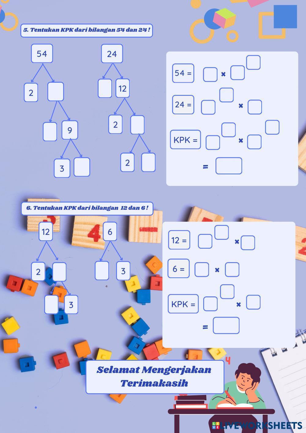 Created byRIKA WULANDARI Matematika Lkpd mtk (menentukan kpk & fpb) Age 9-12 level: 4 Indonesian Author's Instructions MENENTUKAN KPK My Google Classroom Courses × 0 classes selected (0 students total) Quick Access Select all classes (0 classes) All Classes Loading courses... Cancel Share Share to selected Course __COURSE_NAME__ __STUDENT_NAME__ (__STUDENT_EMAIL__) LEMBAR KERJA KELAS 3 Download Worksheet Validation Check my answers Emails my answers to my teacher Full name Group/level School subject Teacher's email or key code Close Submit Validating worksheet... (12) Your answers have been sent to your teacher. Good luck! OK We encountered an error submitting your answers. Please try again. OK Advertisement | Go Ad Free Created byRIKA WULANDARI Matematika Lkpd mtk (menentukan kpk & fpb) Age 9-12 level: 4 Indonesian Author's Instructions MENENTUKAN KPK
