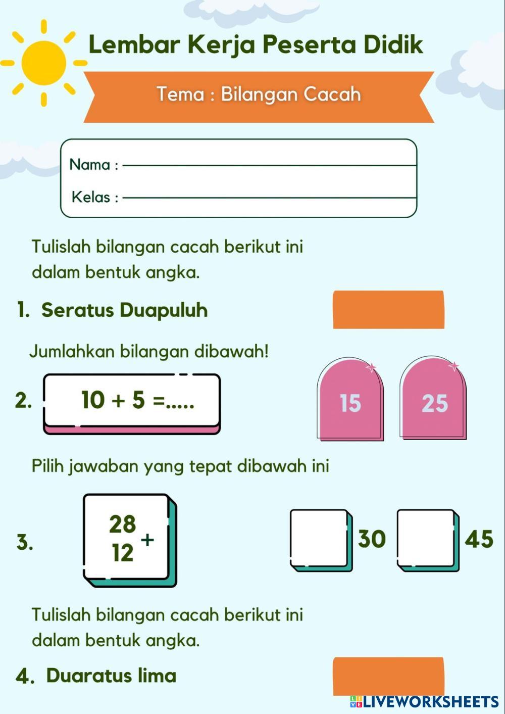 Created bySiska Salsabila Matematika Penjumlahan Bilangan cacah Age 8-12 level: 2 Indonesian Author's Instructions My Google Classroom Courses × 0 classes selected (0 students total) Quick Access Select all classes (0 classes) All Classes Loading courses... Cancel Share Share to selected Course __COURSE_NAME__ __STUDENT_NAME__ (__STUDENT_EMAIL__) LKPD Interaktif bilangan cacah Download Worksheet Validation Check my answers Emails my answers to my teacher Full name Group/level School subject Teacher's email or key code Close Submit Validating worksheet... (12) Your answers have been sent to your teacher. Good luck! OK We encountered an error submitting your answers. Please try again. OK Advertisement | Go Ad Free Created bySiska Salsabila Matematika Penjumlahan Bilangan cacah Age 8-12 level: 2 Indonesian Author's Instructions