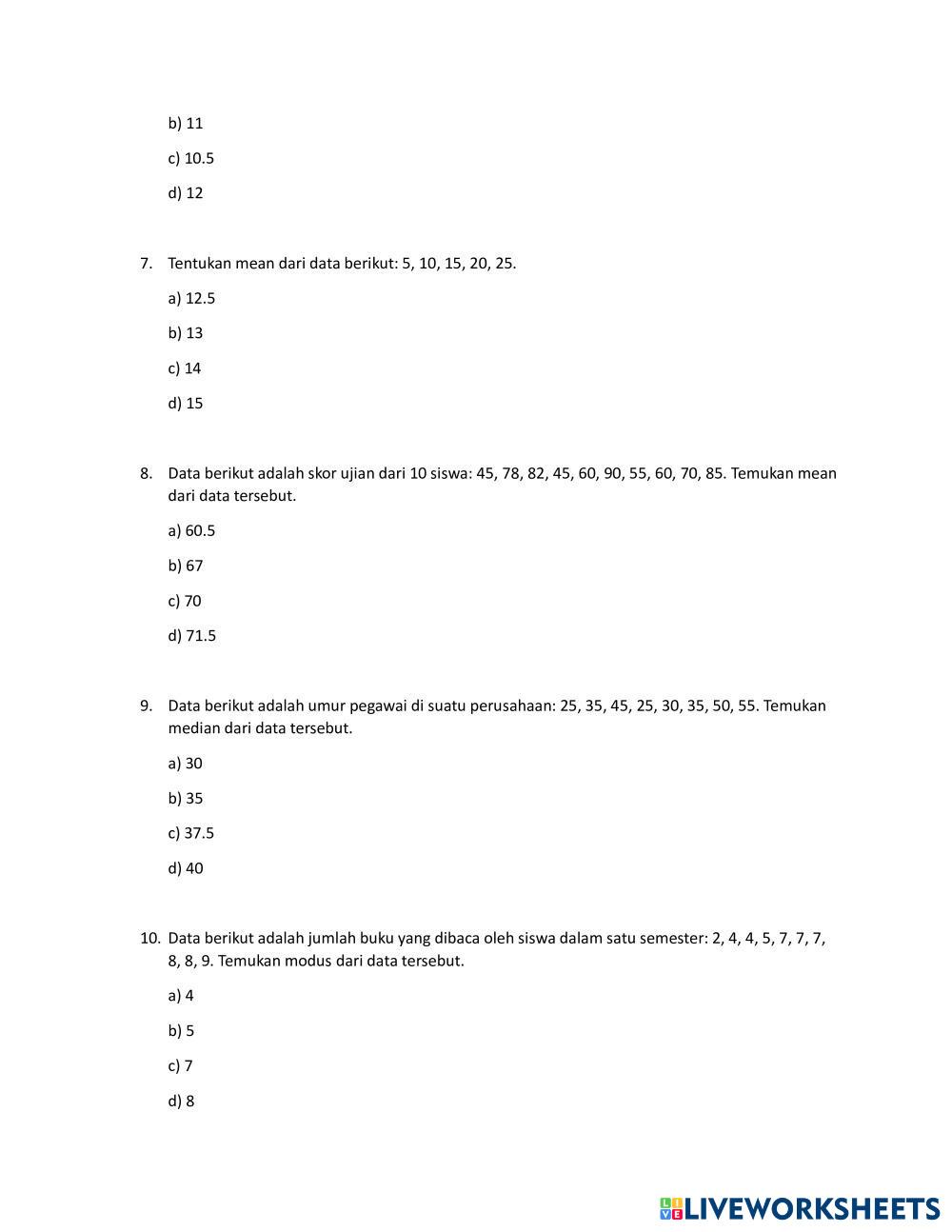 Created by Tsabitha Matematika Statistika (Mean, median, modus) Age 14+ level: 8 Indonesian Author's Instructions My Google Classroom Courses × 0 classes selected (0 students total) Quick Access Select all classes (0 classes) All Classes Loading courses... Cancel Share Share to selected Course __COURSE_NAME__ __STUDENT_NAME__ (__STUDENT_EMAIL__) Statistika Download Worksheet Validation Check my answers Emails my answers to my teacher Full name Group/level School subject Teacher's email or key code Close Submit Validating worksheet... (12) Your answers have been sent to your teacher. Good luck! OK We encountered an error submitting your answers. Please try again. OK Advertisement | Go Ad Free Created by Tsabitha Matematika Statistika (Mean, median, modus) Age 14+ level: 8 Indonesian Author's Instructions