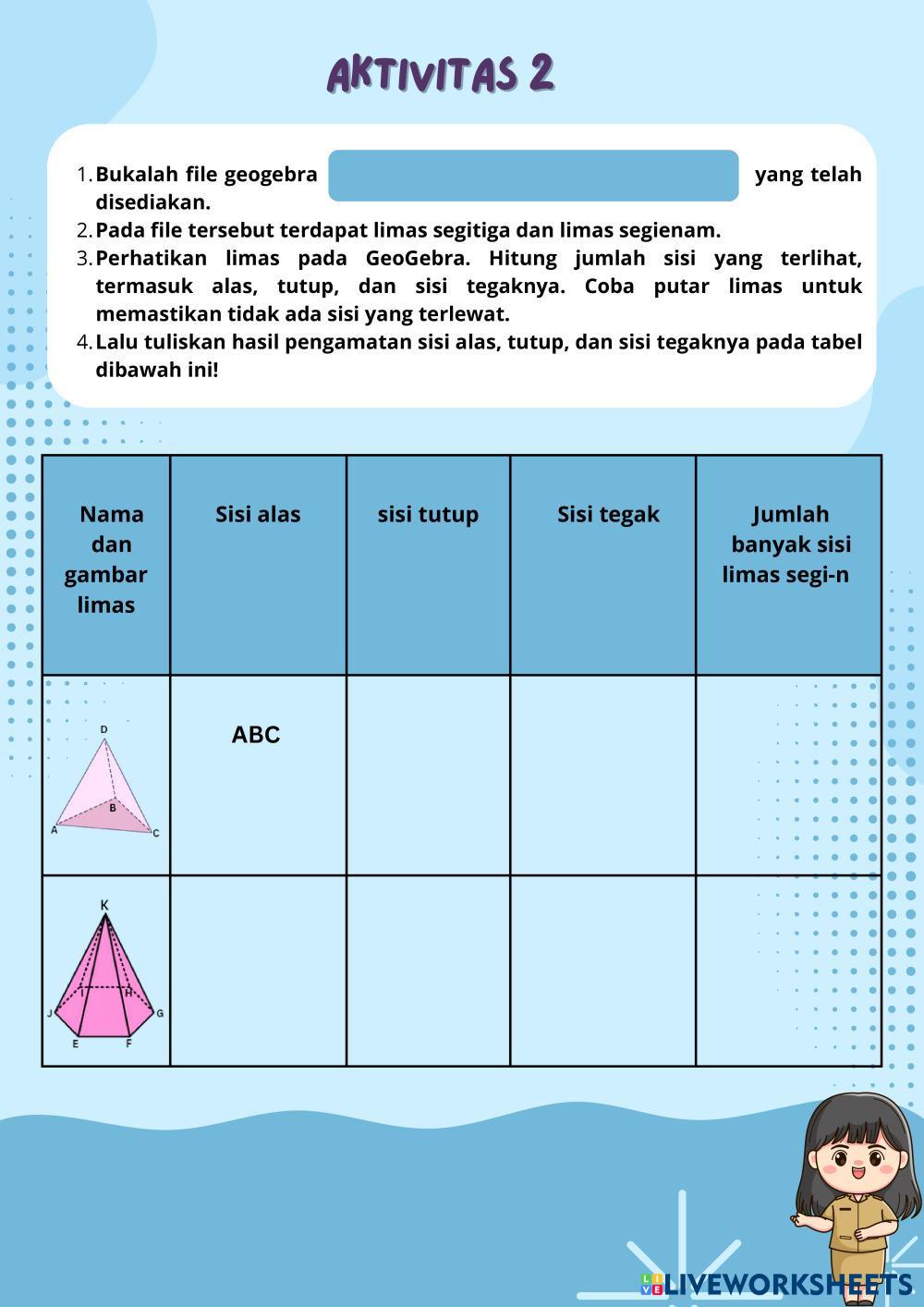 Created bymerinnn Matematika Bangun ruang sisi datar Age 13-17 level: 8 Indonesian Author's Instructions mengidentifikasi unsur unsur limas My Google Classroom Courses × 0 classes selected (0 students total) Quick Access Select all classes (0 classes) All Classes Loading courses... Cancel Share Share to selected Course __COURSE_NAME__ __STUDENT_NAME__ (__STUDENT_EMAIL__) 2. Unsur-unsur limas Download Worksheet Validation Check my answers Emails my answers to my teacher Full name Group/level School subject Teacher's email or key code Close Submit Validating worksheet... (12) Your answers have been sent to your teacher. Good luck! OK We encountered an error submitting your answers. Please try again. OK Advertisement | Go Ad Free Created bymerinnn Matematika Bangun ruang sisi datar Age 13-17 level: 8 Indonesian Author's Instructions mengidentifikasi unsur unsur limas