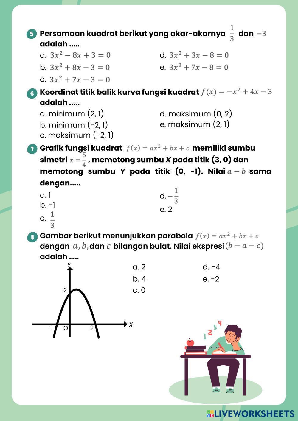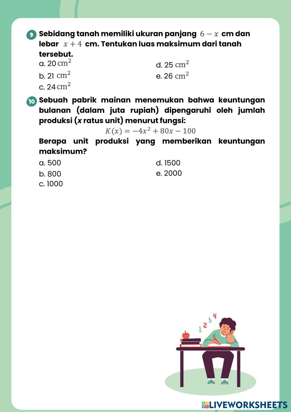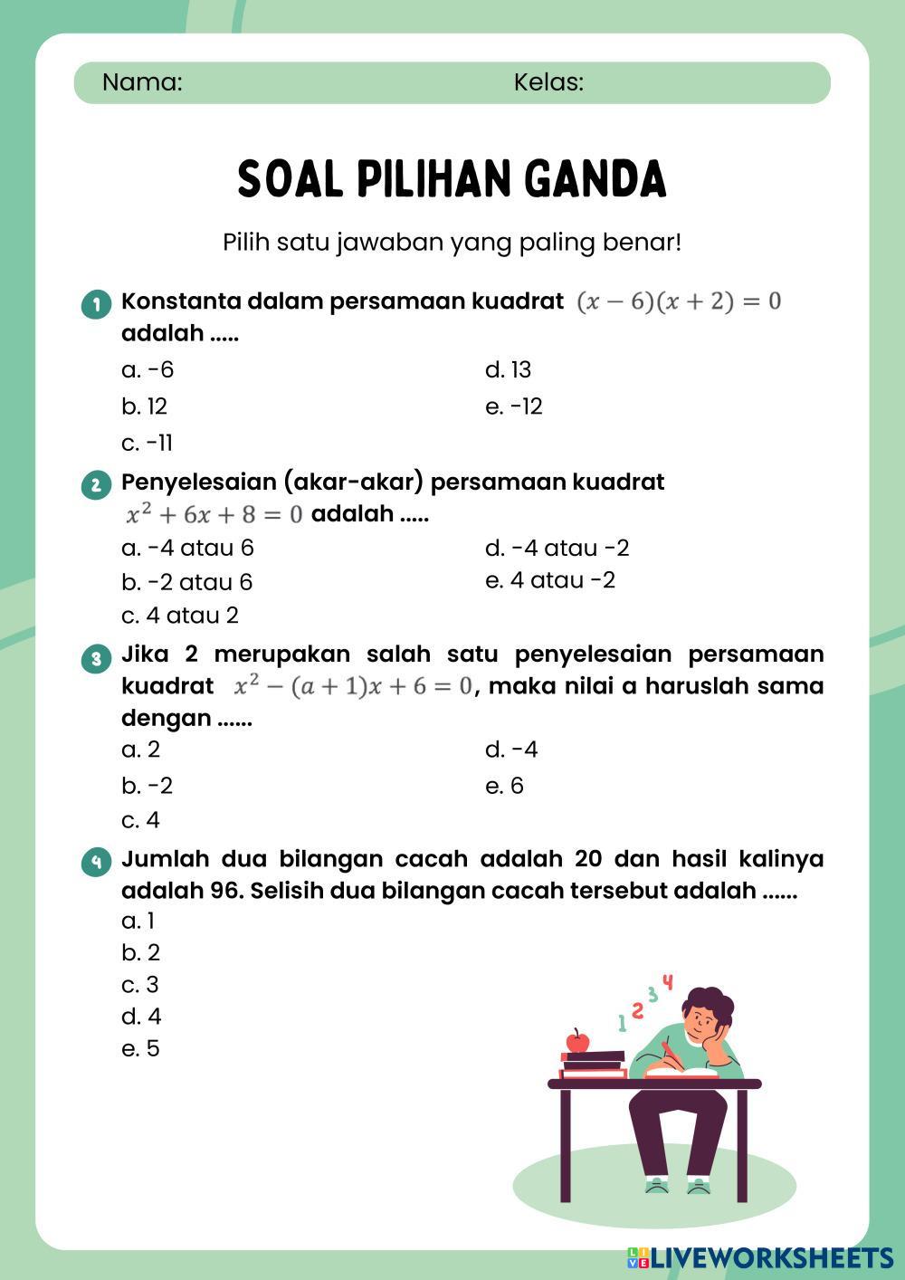 Created byVeni Saputri Matematika Persamaan dan Fungsi Kuadrat Age 16+ level: Kelas 10 Indonesian Author's Instructions My Google Classroom Courses × 0 classes selected (0 students total) Quick Access Select all classes (0 classes) All Classes Loading courses... Cancel Share Share to selected Course __COURSE_NAME__ __STUDENT_NAME__ (__STUDENT_EMAIL__) Asesmen Kompetensi Pilihan Ganda Download Worksheet Validation Check my answers Emails my answers to my teacher Full name Group/level School subject Teacher's email or key code Close Submit Validating worksheet... (12) Your answers have been sent to your teacher. Good luck! OK We encountered an error submitting your answers. Please try again. OK Advertisement | Go Ad Free Created byVeni Saputri Matematika Persamaan dan Fungsi Kuadrat Age 16+ level: Kelas 10 Indonesian Author's Instructions