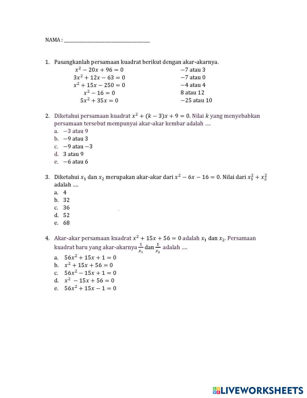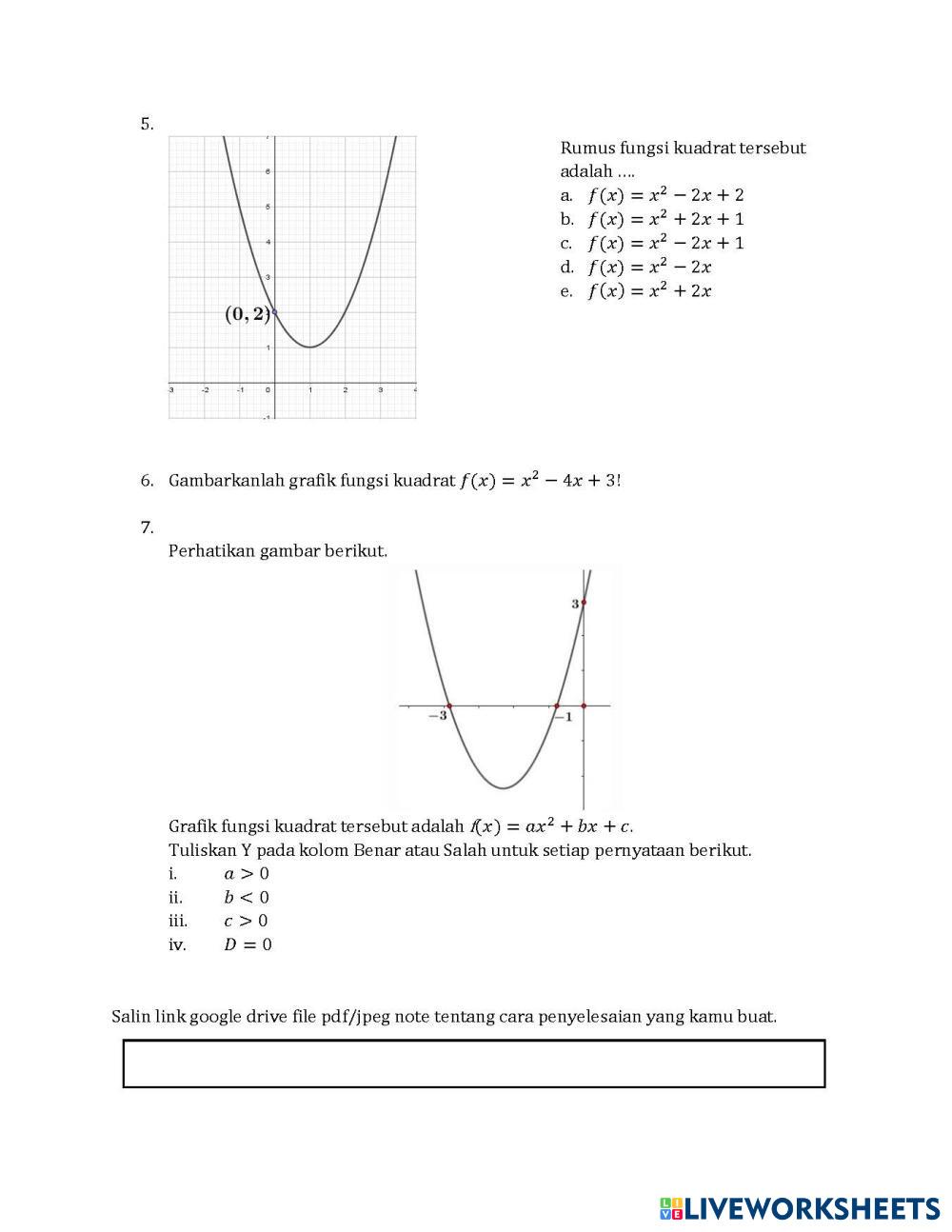 Created byAnnisa Hasna Matematika Persamaan dan Fungsi Kuadrat Age 6+ level: X Indonesian Author's Instructions PH Persamaan dan Fungsi Kuadrat My Google Classroom Courses × 0 classes selected (0 students total) Quick Access Select all classes (0 classes) All Classes Loading courses... Cancel Share Share to selected Course __COURSE_NAME__ __STUDENT_NAME__ (__STUDENT_EMAIL__) PH Persamaan dan Fungsi Kuadrat Download Worksheet Validation Check my answers Emails my answers to my teacher Full name Group/level School subject Teacher's email or key code Close Submit Validating worksheet... (12) Your answers have been sent to your teacher. Good luck! OK We encountered an error submitting your answers. Please try again. OK Advertisement | Go Ad Free Created byAnnisa Hasna Matematika Persamaan dan Fungsi Kuadrat Age 6+ level: X Indonesian Author's Instructions PH Persamaan dan Fungsi Kuadrat