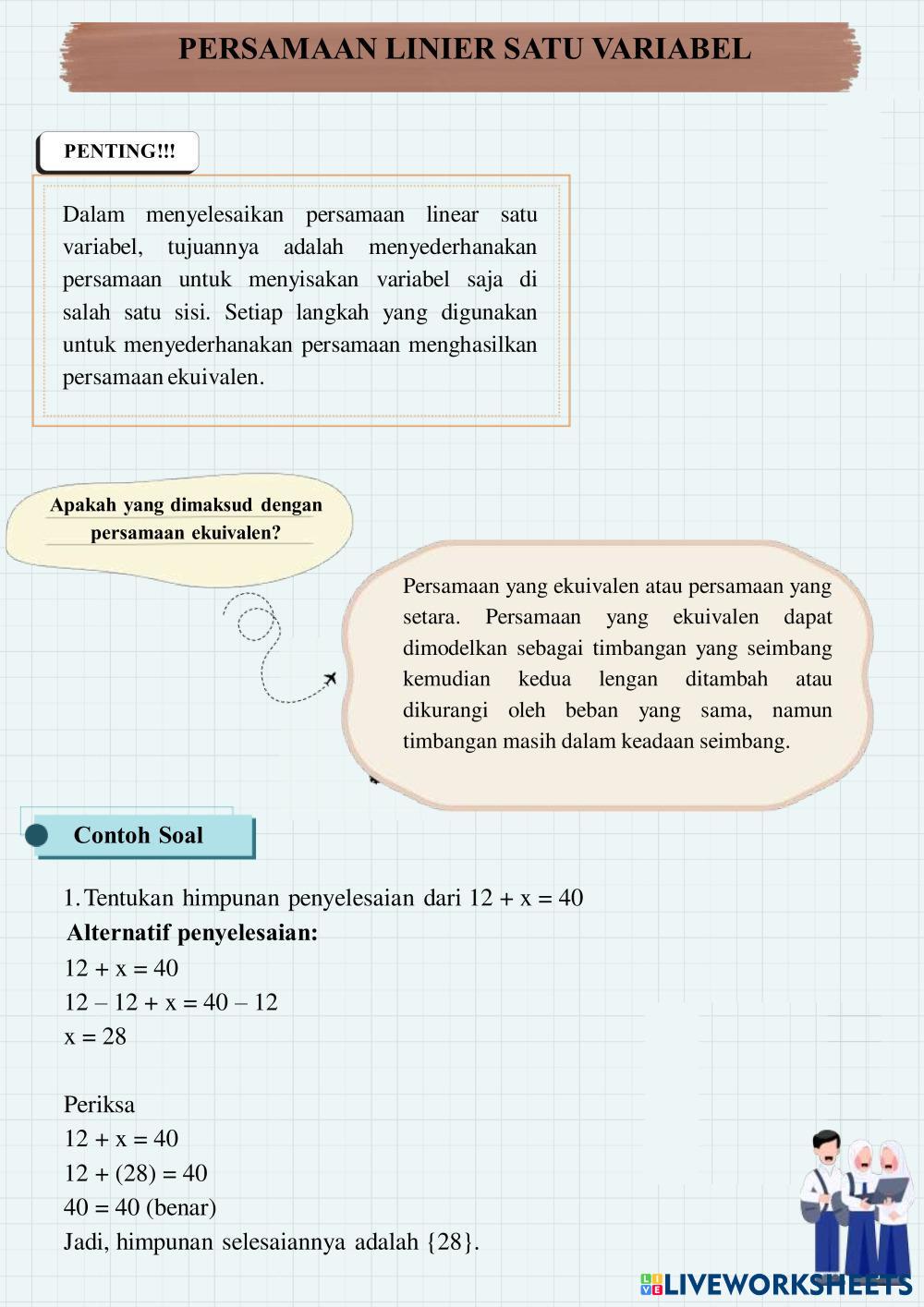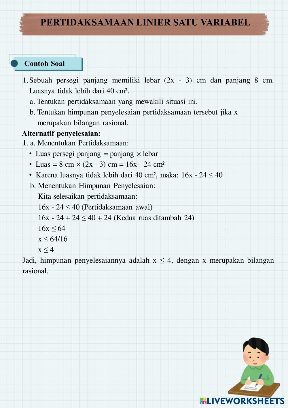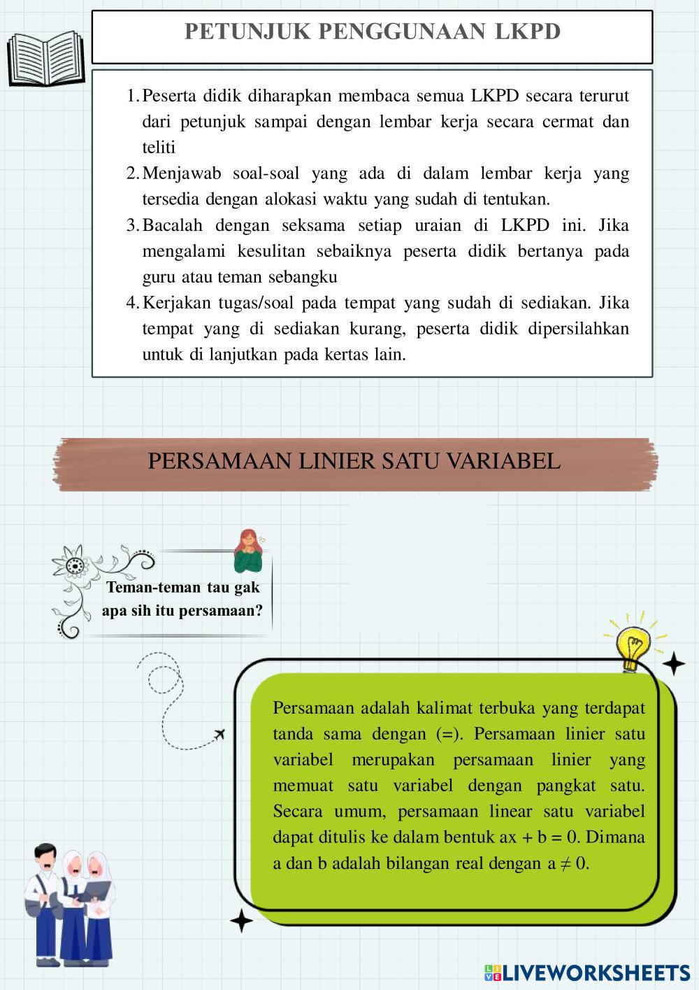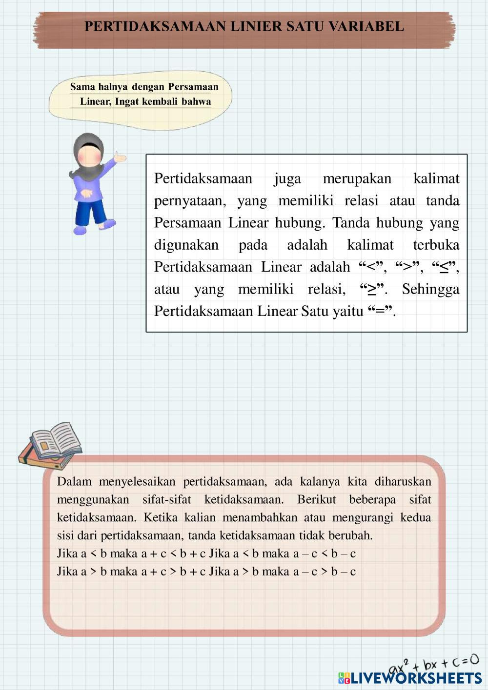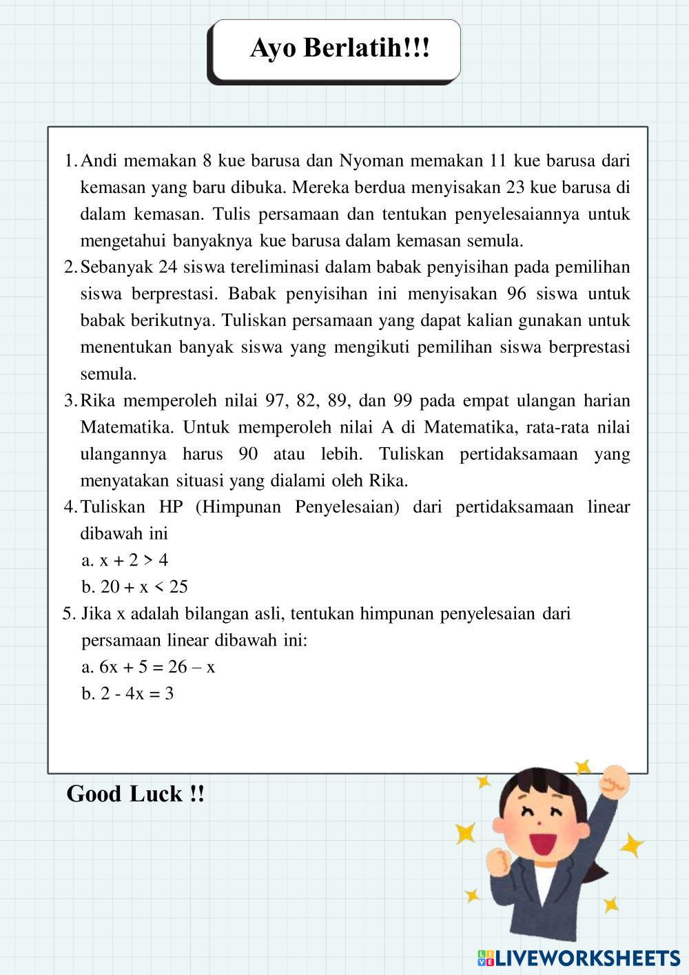 Created byNadia safa Matematika Persamaan dan Pertidaksamaan Linear Satu Variabel Age 13-18 level: 7 Indonesian Author's Instructions Persamaan dan Pertidaksamaan Linear Satu Variabel My Google Classroom Courses × 0 classes selected (0 students total) Quick Access Select all classes (0 classes) All Classes Loading courses... Cancel Share Share to selected Course __COURSE_NAME__ __STUDENT_NAME__ (__STUDENT_EMAIL__) Persamaan dan Pertidaksamaan Linear Satu Variabel Download Worksheet Validation Check my answers Emails my answers to my teacher Full name Group/level School subject Teacher's email or key code Close Submit Validating worksheet... (12) Your answers have been sent to your teacher. Good luck! OK We encountered an error submitting your answers. Please try again. OK Advertisement | Go Ad Free Created byNadia safa Matematika Persamaan dan Pertidaksamaan Linear Satu Variabel Age 13-18 level: 7 Indonesian Author's Instructions Persamaan dan Pertidaksamaan Linear Satu Variabel