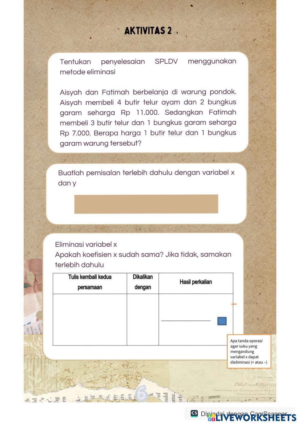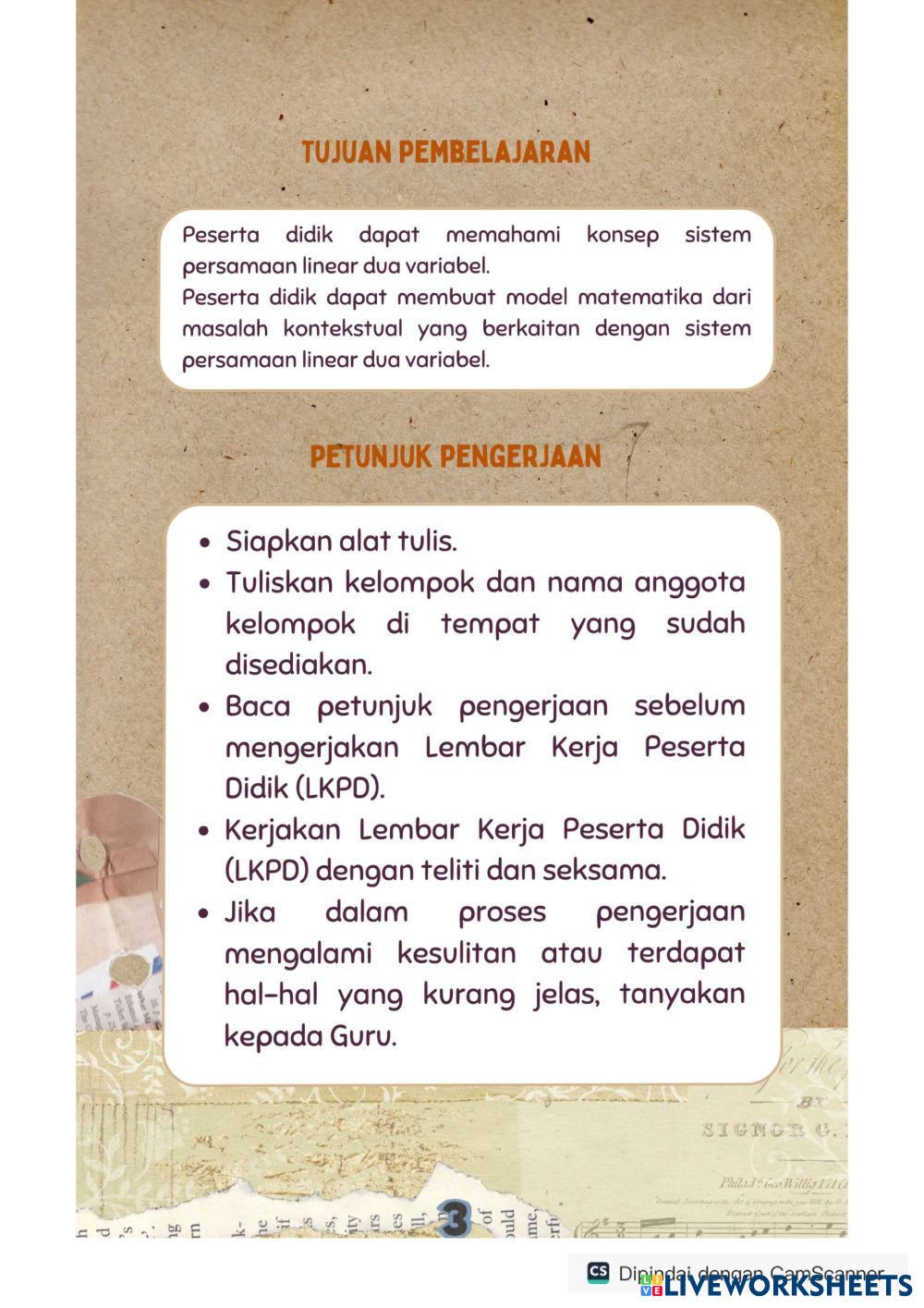 Created byWiwit Lestari Matematika SPLDV Metode Eliminasi Age 11-18 level: 9 Indonesian Author's Instructions My Google Classroom Courses × 0 classes selected (0 students total) Quick Access Select all classes (0 classes) All Classes Loading courses... Cancel Share Share to selected Course __COURSE_NAME__ __STUDENT_NAME__ (__STUDENT_EMAIL__) E-LKPD Download Worksheet Validation Check my answers Emails my answers to my teacher Full name Group/level School subject Teacher's email or key code Close Submit Validating worksheet... (12) Your answers have been sent to your teacher. Good luck! OK We encountered an error submitting your answers. Please try again. OK Advertisement | Go Ad Free Created byWiwit Lestari Matematika SPLDV Metode Eliminasi Age 11-18 level: 9 Indonesian Author's Instructions