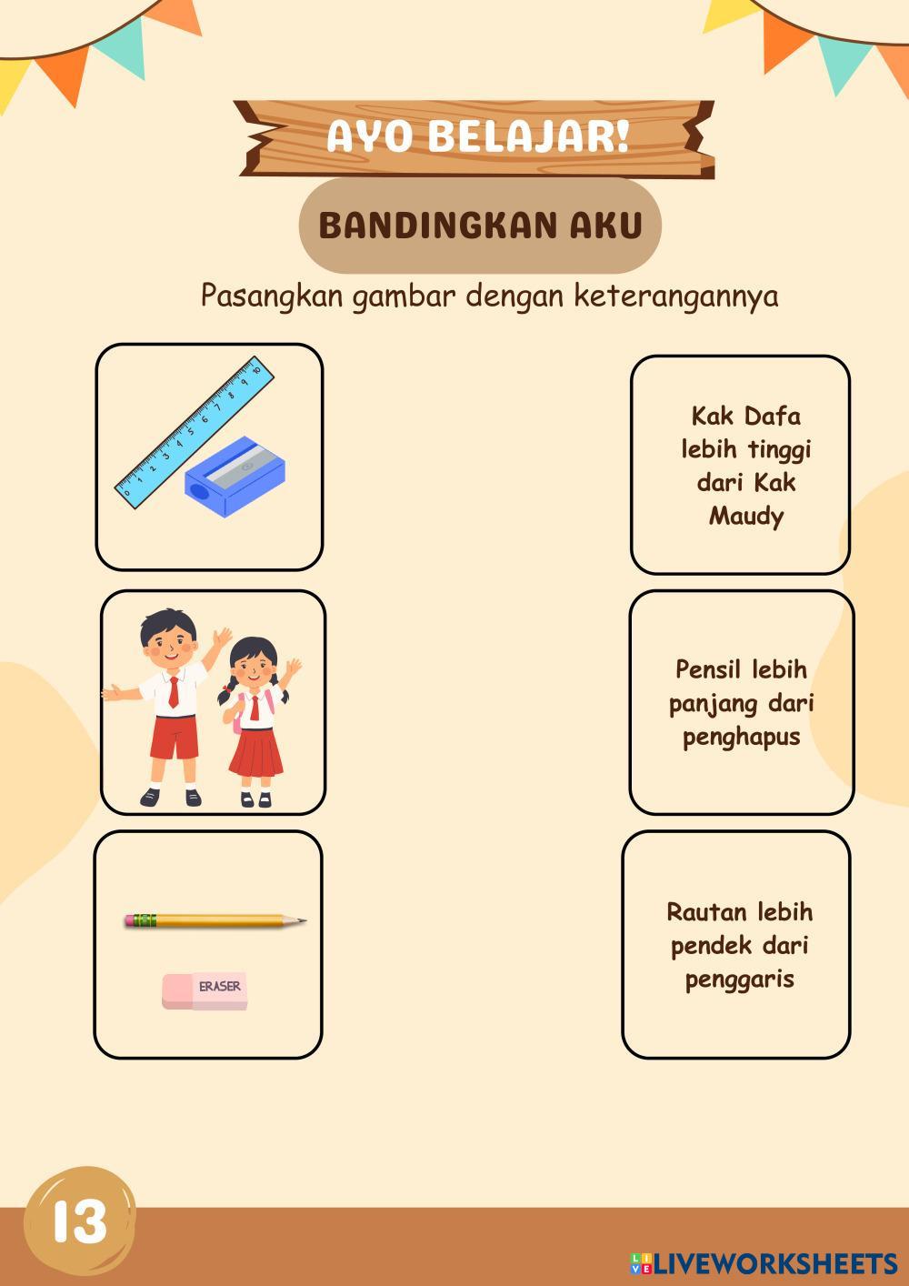 Created byIsna Karisma Matematika Pengukuran panjang Age 6-11 level: 1 Indonesian Author's Instructions My Google Classroom Courses × 0 classes selected (0 students total) Quick Access Select all classes (0 classes) All Classes Loading courses... Cancel Share Share to selected Course __COURSE_NAME__ __STUDENT_NAME__ (__STUDENT_EMAIL__) perbandingan panjang Download Worksheet Validation Check my answers Emails my answers to my teacher Full name Group/level School subject Teacher's email or key code Close Submit Validating worksheet... (12) Your answers have been sent to your teacher. Good luck! OK We encountered an error submitting your answers. Please try again. OK Advertisement | Go Ad Free Created byIsna Karisma Matematika Pengukuran panjang Age 6-11 level: 1 Indonesian Author's Instructions