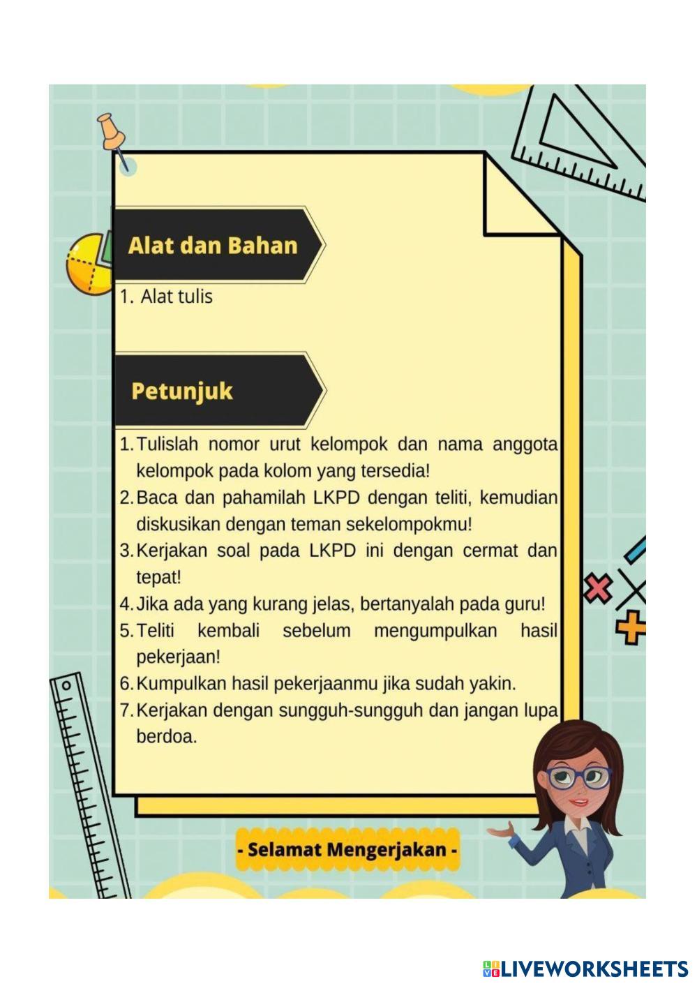 Created byALFAN Math Elementary 1st grade Addition and Subtraction Indonesian Author's Instructions IKUTI PETUNJUK DI DALAMNYA My Google Classroom Courses × 0 classes selected (0 students total) Quick Access Select all classes (0 classes) All Classes Loading courses... Cancel Share Share to selected Course __COURSE_NAME__ __STUDENT_NAME__ (__STUDENT_EMAIL__) LKPD KB- 2 Download Worksheet Validation Check my answers Emails my answers to my teacher Full name Group/level School subject Teacher's email or key code Close Submit Validating worksheet... (12) Your answers have been sent to your teacher. Good luck! OK We encountered an error submitting your answers. Please try again. OK Advertisement | Go Ad Free Created byALFAN Math Elementary 1st grade Addition and Subtraction Indonesian Author's Instructions IKUTI PETUNJUK DI DALAMNYA Explore Worksheets Addition & Calendar Math 1st grade Addition & Calendar Addition and Subtraction - Math Calendar Days of the week Solar months SAS Matematika Math 1st grade SAS Matematika Addition and Subtraction - Math Kerjakan soal dengan benar! Matematika Kelas 1 SD Math 1st grade Matematika Kelas 1 SD Addition and Subtraction - Math Kerjakan soal- soal berikut dengan benar ! MATEMATICA Math 1st grade MATEMATICA Addition and Subtraction - Math MATEMATICA TIPO ECE recordando lo que se aprendio