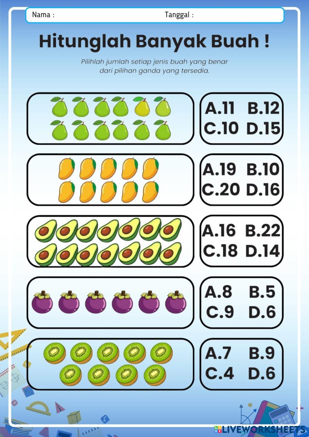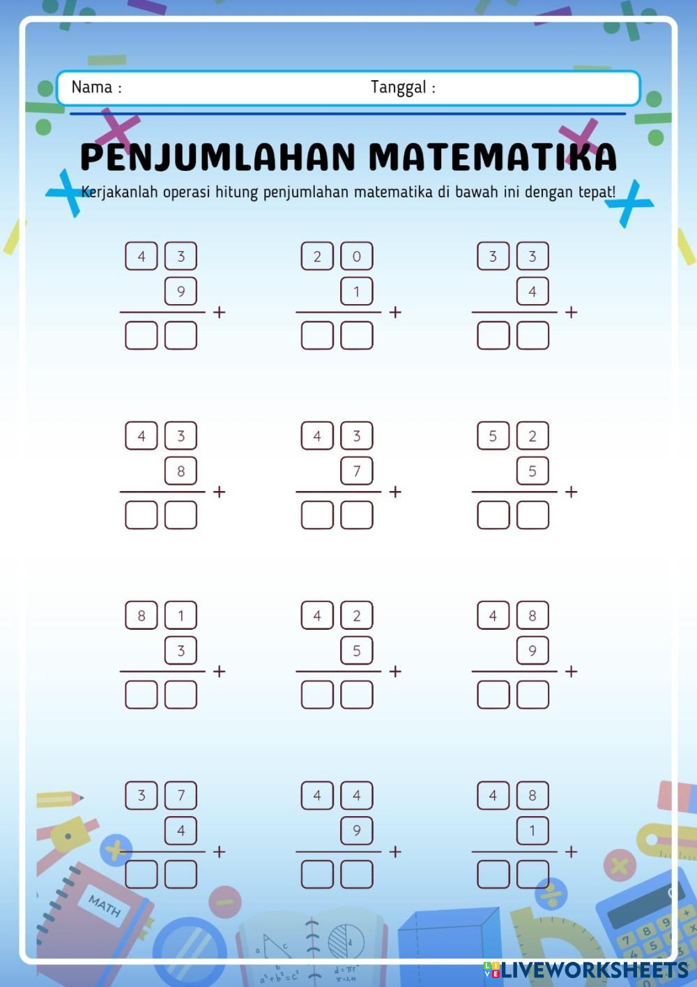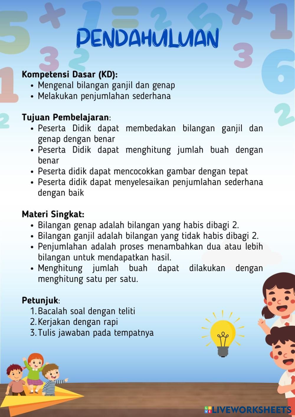 Created by zahraaulia1 Math Elementary 3rd grade Addition and Subtraction Indonesian Author's Instructions kerjakan dengan benar sesuai dengan petunjuk My Google Classroom Courses × 0 classes selected (0 students total) Quick Access Select all classes (0 classes) All Classes Loading courses... Cancel Share Share to selected Course __COURSE_NAME__ __STUDENT_NAME__ (__STUDENT_EMAIL__) 098_Zahra Riyani Aulia_4C_LKPD Matematika Download Worksheet Validation Check my answers Emails my answers to my teacher Full name Group/level School subject Teacher's email or key code Close Submit Validating worksheet... (12) Your answers have been sent to your teacher. Good luck! OK We encountered an error submitting your answers. Please try again. OK Advertisement | Go Ad Free Created by zahraaulia1 Math Elementary 3rd grade Addition and Subtraction Indonesian Author's Instructions kerjakan dengan benar sesuai dengan petunjuk Explore Worksheets Matematika Fase B: Petualangan Pola Bilangan Math 3rd grade Matematika Fase B: Petualangan Pola Bilangan Addition and Subtraction - Math 1. Tontonlah video pembelajaran yang tersedia di bagian atas lembar kerja. 2. Bacalah ringkasan materi dengan saksama. 3. Klik pada lingkaran atau kotak jawaban yang menurutmu paling benar pada soal pilihan ganda. 4. Jika sudah selesai, klik tombol "Finish" untuk melihat hasilmu. Mathematics Addition and Subtraction word problem facts to 20 Homework Math 3rd grade Mathematics Addition and Subtraction word problem facts to 20 Homework Addition and Subtraction - Math Solve word problems to fact of 20 Addition with regrouping Math 3rd grade Addition with regrouping Addition and Subtraction - Math Addition with regrouping Bài 3 Math 3rd grade Bài 3 Addition and Subtraction - Math Tính nhẩm rồi điền vào chỗ trống