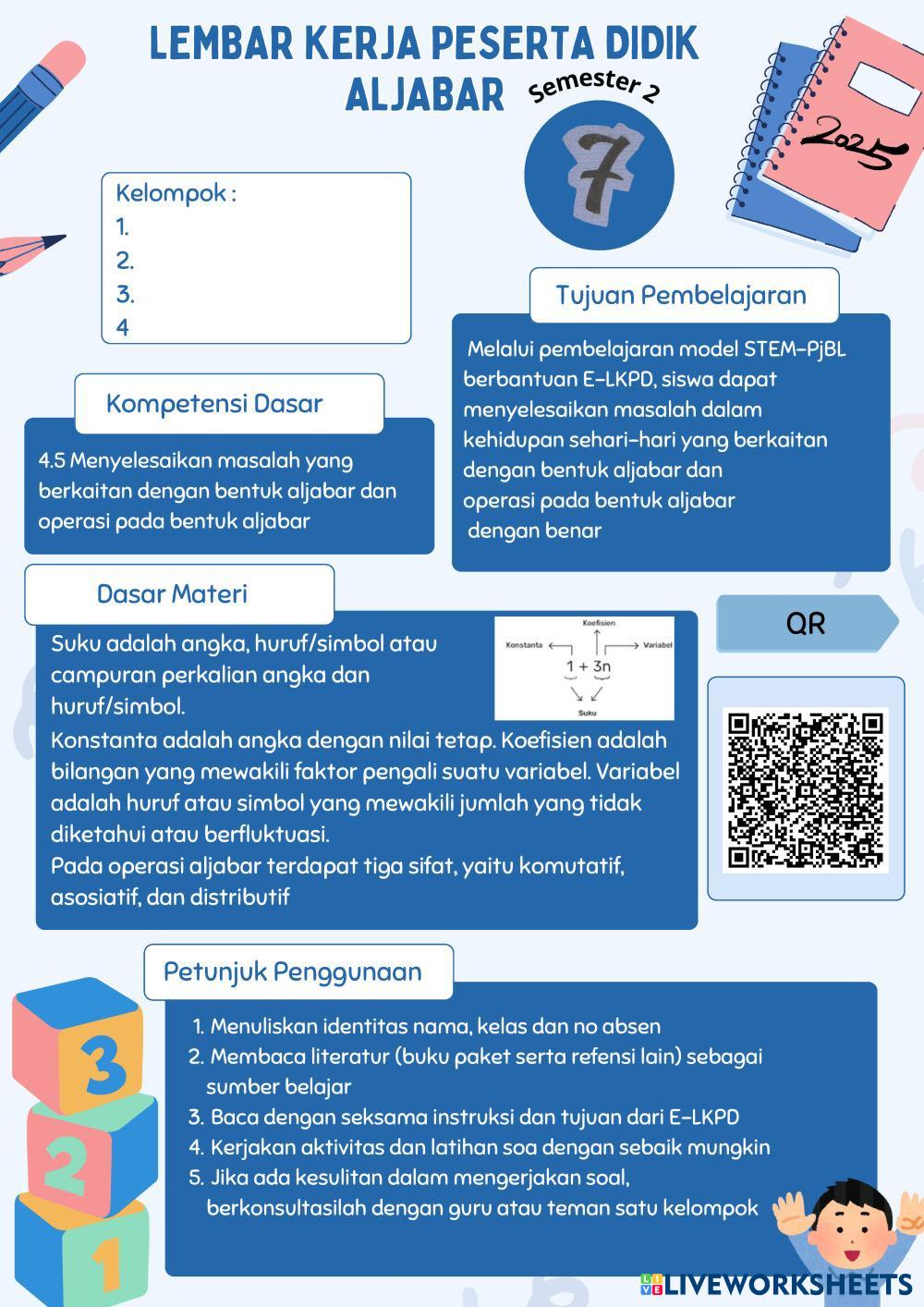 E-LKPD ini berisi latihan soal terkait pemodelan aljabar