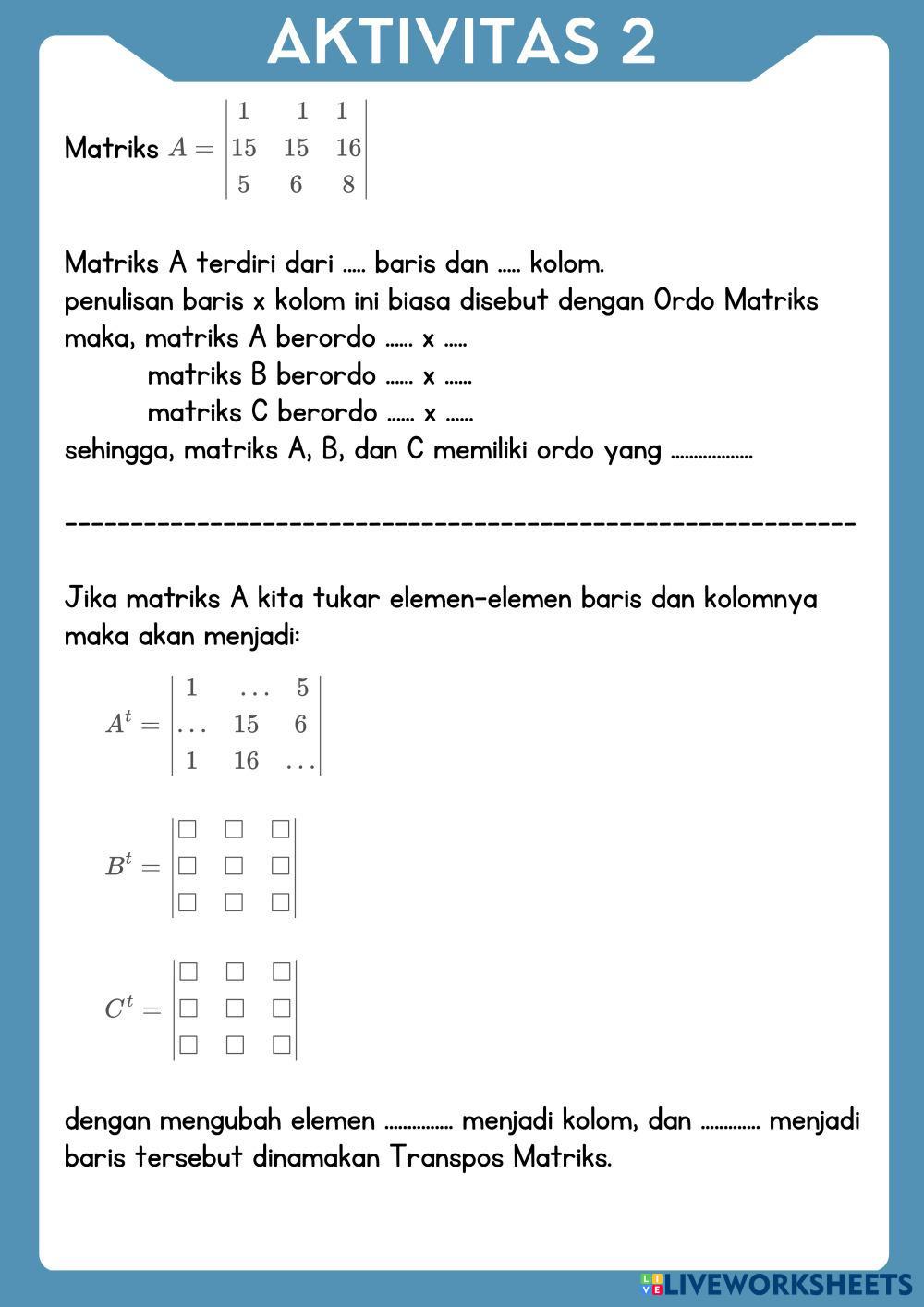 Created byFranzeska Math High School 11th grade Algebra Indonesian Author's Instructions - My Google Classroom Courses × 0 classes selected (0 students total) Quick Access Select all classes (0 classes) All Classes Loading courses... Cancel Share Share to selected Course __COURSE_NAME__ __STUDENT_NAME__ (__STUDENT_EMAIL__) Matriks Download Worksheet Validation Check my answers Emails my answers to my teacher Full name Group/level School subject Teacher's email or key code Close Submit Validating worksheet... (12) Your answers have been sent to your teacher. Good luck! OK We encountered an error submitting your answers. Please try again. OK Advertisement | Go Ad Free Created byFranzeska Math High School 11th grade Algebra Indonesian Author's Instructions - Explore Worksheets نظريات على الدوال Math 11th grade نظريات على الدوال Algebra - Math تمرين 10 نظريات Math 11th grade نظريات Algebra - Math حل تمرين رقم 10 صفحة 153 PERKALIAN DUA MATRIKS Math 11th grade PERKALIAN DUA MATRIKS Algebra - Math Silahkan anak-anak diskusikan LKPD berikut ini secara berkelompok. Perkalian Dua Matriks Math 11th grade Perkalian Dua Matriks Algebra - Math Silahkan anak-anak dikerjakan dengan teliti dan jujur