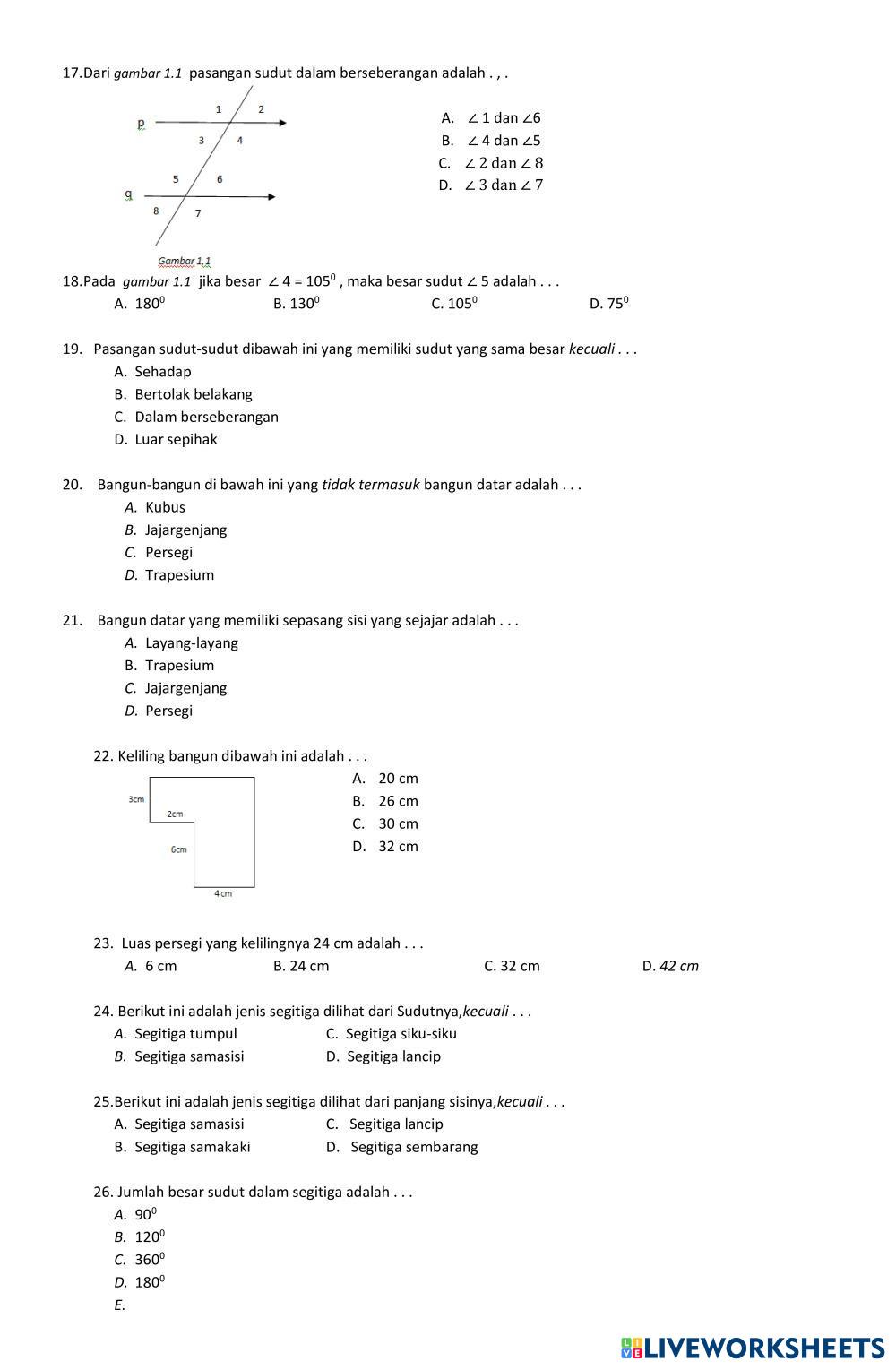 Created byKELAS VII Math Middle School 7th grade Geometry Indonesian Author's Instructions ASASMEN My Google Classroom Courses × 0 classes selected (0 students total) Quick Access Select all classes (0 classes) All Classes Loading courses... Cancel Share Share to selected Course __COURSE_NAME__ __STUDENT_NAME__ (__STUDENT_EMAIL__) MATEMATIKA 7-2 Download Worksheet Validation Check my answers Emails my answers to my teacher Full name Group/level School subject Teacher's email or key code Close Submit Validating worksheet... (12) Your answers have been sent to your teacher. Good luck! OK We encountered an error submitting your answers. Please try again. OK Advertisement | Go Ad Free Created byKELAS VII Math Middle School 7th grade Geometry Indonesian Author's Instructions ASASMEN Explore Worksheets LKPD Bangun Ruang Math 7th grade LKPD Bangun Ruang Geometry - Math Kerjakan dengan baik dan benar LKPD SEGI EMPAT Math 7th grade LKPD SEGI EMPAT Geometry - Math kerjakan dengan benar LKPD SEGI EMPAT Math 7th grade LKPD SEGI EMPAT Geometry - Math Kerjakan dengan benar LKPD Math 7th grade LKPD Geometry - Math Jawablah dengan benar dan teliti