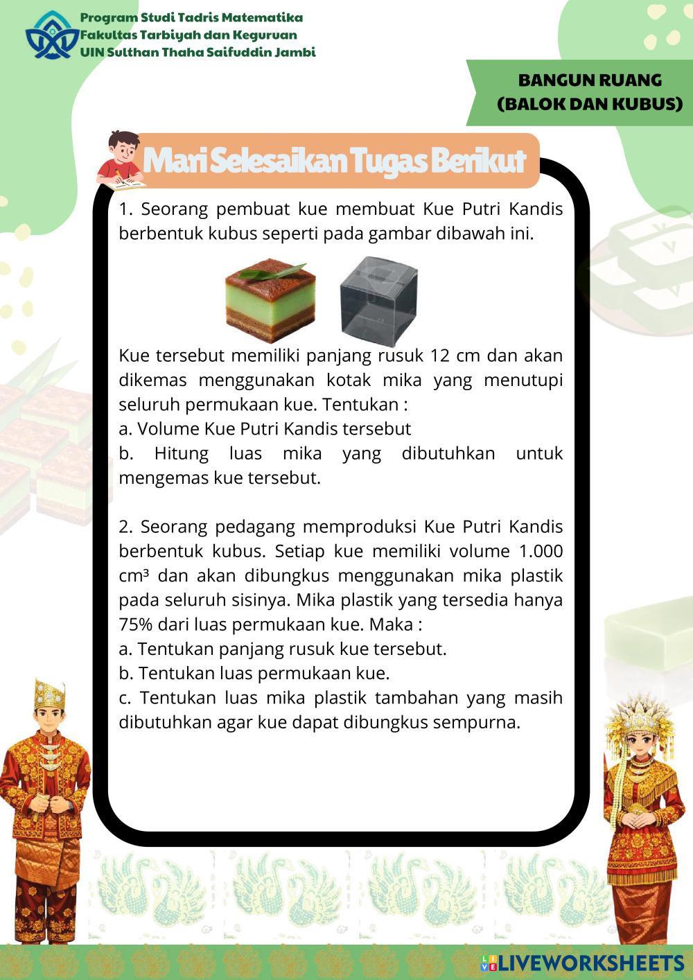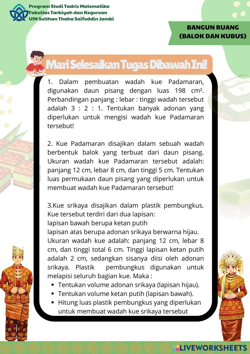 Created byfebiola dwi putri vizzaro Math Middle School 8th grade Geometry Indonesian Author's Instructions Kerjakan LKPD dibawah ini! My Google Classroom Courses × 0 classes selected (0 students total) Quick Access Select all classes (0 classes) All Classes Loading courses... Cancel Share Share to selected Course __COURSE_NAME__ __STUDENT_NAME__ (__STUDENT_EMAIL__) E-LKPD Etnomatematika Bagian 2 Download Worksheet Validation Check my answers Emails my answers to my teacher Full name Group/level School subject Teacher's email or key code Close Submit Validating worksheet... (12) Your answers have been sent to your teacher. Good luck! OK We encountered an error submitting your answers. Please try again. OK Advertisement | Go Ad Free Created byfebiola dwi putri vizzaro Math Middle School 8th grade Geometry Indonesian Author's Instructions Kerjakan LKPD dibawah ini! Explore Worksheets משיק למעגל Math 8th grade משיק למעגל Geometry - Math ענו על השאלות הבאות Hình chóp tam giác đều drap and drop Math 8th grade Hình chóp tam giác đều drap and drop Geometry - Math abc Hình chóp tam giác đều Math 8th grade Hình chóp tam giác đều Geometry - Math ABC S Math 8th grade S Geometry - Math Sumas