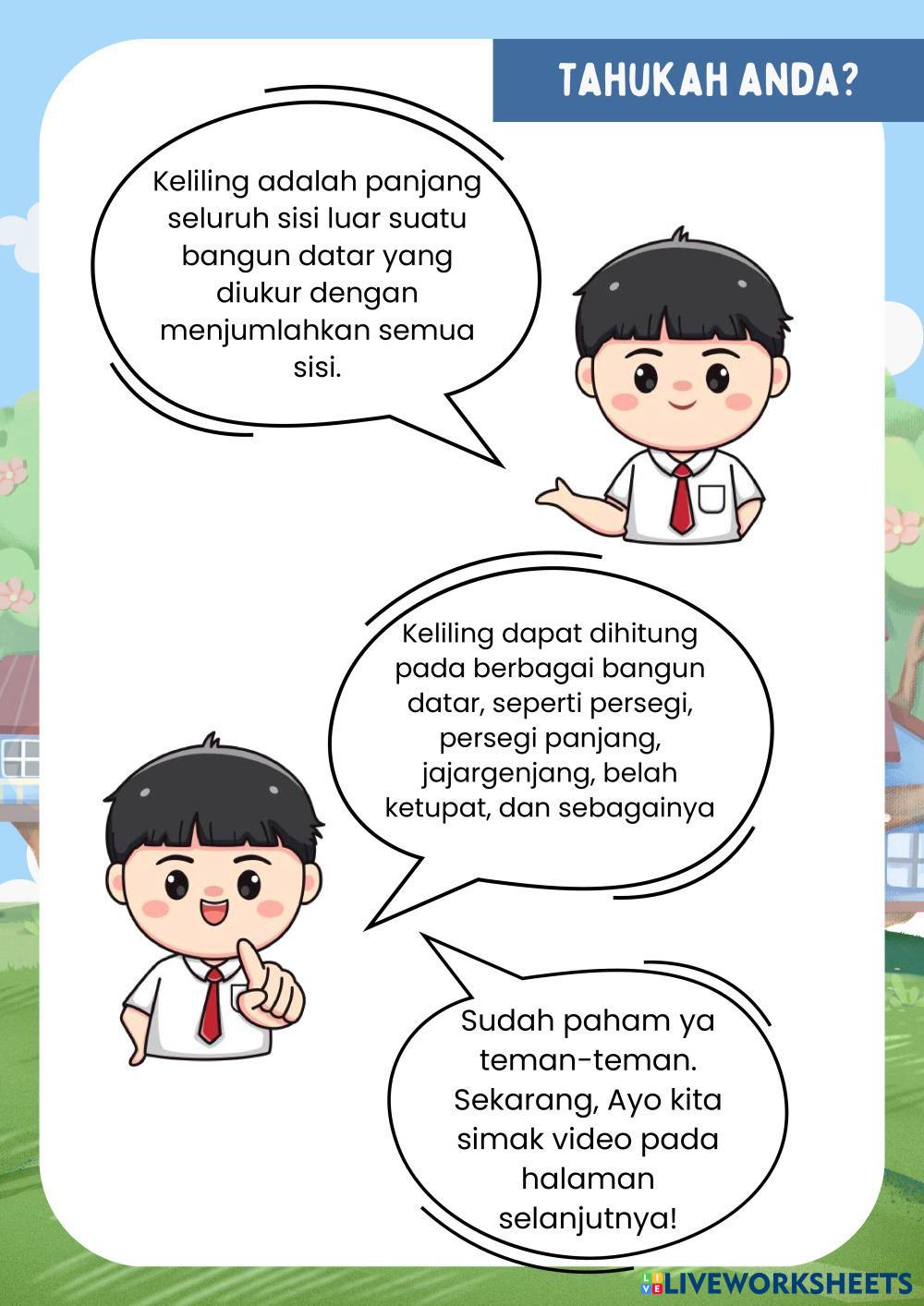 Created by vithaecha Math Elementary 5th grade Geometry Indonesian Author's Instructions Menentukan Keliling Bangun Datar Segiempat My Google Classroom Courses × 0 classes selected (0 students total) Quick Access Select all classes (0 classes) All Classes Loading courses... Cancel Share Share to selected Course __COURSE_NAME__ __STUDENT_NAME__ (__STUDENT_EMAIL__) LKPD Keliling Bangun Datar Segiempat Download Worksheet Validation Check my answers Emails my answers to my teacher Full name Group/level School subject Teacher's email or key code Close Submit Validating worksheet... (12) Your answers have been sent to your teacher. Good luck! OK We encountered an error submitting your answers. Please try again. OK Advertisement | Go Ad Free Created by vithaecha Math Elementary 5th grade Geometry Indonesian Author's Instructions Menentukan Keliling Bangun Datar Segiempat Explore Worksheets ÁREA Y PERÍMETRO Math 5th grade ÁREA Y PERÍMETRO Geometry - Math Lee y responde تدريب ايجاد مساحة المتوازي الأضلاع Math 5th grade تدريب ايجاد مساحة المتوازي الأضلاع Geometry - Math أوجدي مساحة المتوازي الأضلاع LKPD dan soal perbandingan ciri-ciri bangun datar Math 5th grade LKPD dan soal perbandingan ciri-ciri bangun datar Geometry - Math Ayo Kerjakan LKPD dan soal dengan jawaban yang benar BÀI TẬP TƯƠNG TÁC TOÁN 5 - HÌNH KHỐI Math 5th grade BÀI TẬP TƯƠNG TÁC TOÁN 5 - HÌNH KHỐI Geometry - Math Các em đọc kỹ câu hỏi, thực hiện kết nối, kéo giãn hoặc điền số đúng vào ô trống. Xong nhấn nút FINISH để xem điểm nhé!