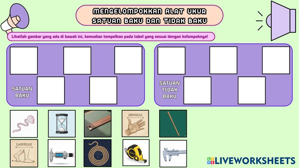 Kelompokan gambar-gambar alat ukur sesuai dengan tempat yang tersedia yaitu satuan baku dan satuan tidak baku