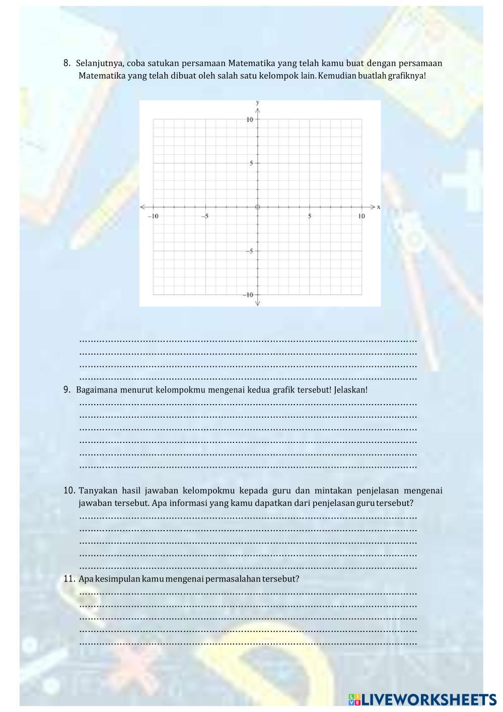Created by tarryes Mathematics Sistem Persamaan Linear Dua Variabel Age 11+ level: X Indonesian Author's Instructions My Google Classroom Courses × 0 classes selected (0 students total) Quick Access Select all classes (0 classes) All Classes Loading courses... Cancel Share Share to selected Course __COURSE_NAME__ __STUDENT_NAME__ (__STUDENT_EMAIL__) LKPD2 SPLDV Download Worksheet Validation Check my answers Emails my answers to my teacher Full name Group/level School subject Teacher's email or key code Close Submit Validating worksheet... (12) Your answers have been sent to your teacher. Good luck! OK We encountered an error submitting your answers. Please try again. OK Advertisement | Go Ad Free Created by tarryes Mathematics Sistem Persamaan Linear Dua Variabel Age 11+ level: X Indonesian Author's Instructions