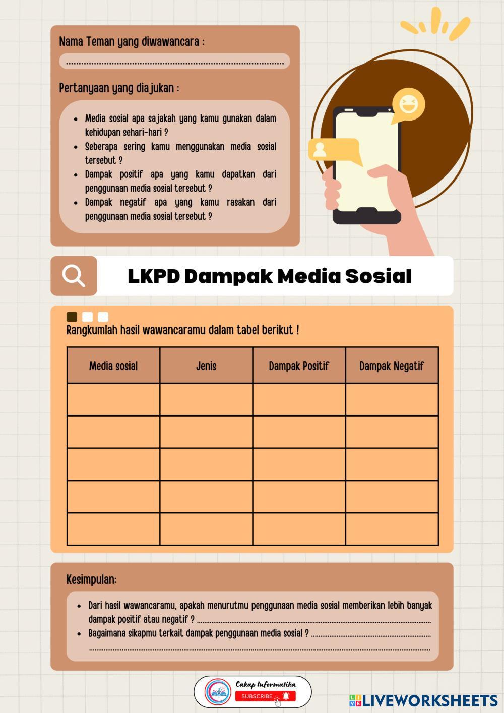 Created by anixusay Media Sosial 1 Pengenalan Media Sosial Age 12+ level: 8 Indonesian Author's Instructions My Google Classroom Courses × 0 classes selected (0 students total) Quick Access Select all classes (0 classes) All Classes Loading courses... Cancel Share Share to selected Course __COURSE_NAME__ __STUDENT_NAME__ (__STUDENT_EMAIL__) LKPD Media Sosial Download Worksheet Validation Check my answers Emails my answers to my teacher Full name Group/level School subject Teacher's email or key code Close Submit Validating worksheet... (12) Your answers have been sent to your teacher. Good luck! OK We encountered an error submitting your answers. Please try again. OK Advertisement | Go Ad Free Created by anixusay Media Sosial 1 Pengenalan Media Sosial Age 12+ level: 8 Indonesian Author's Instructions
