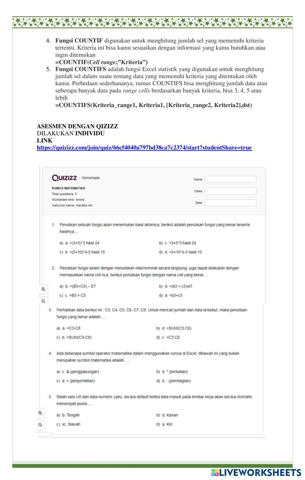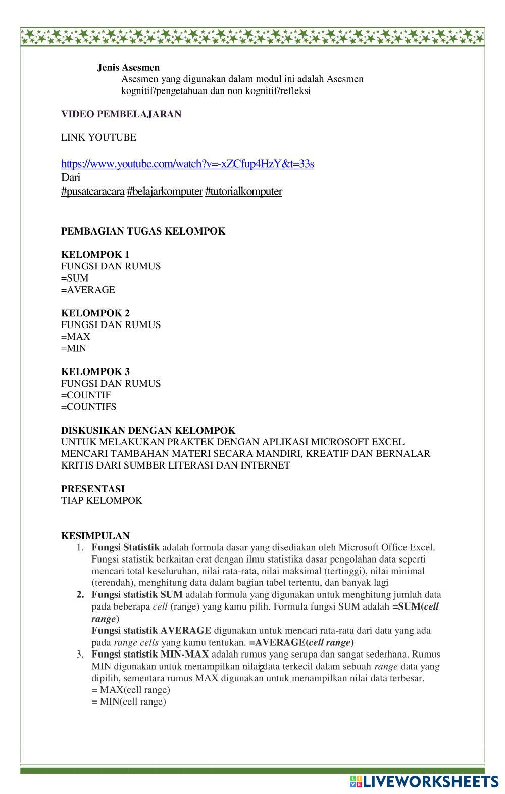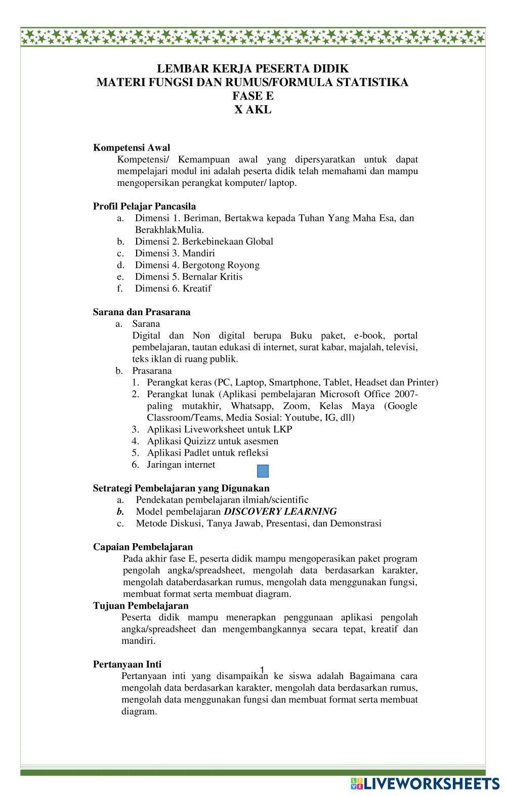 Created byagustina mardika rini MENGOPERASIKAN SPREADSHEET STATISTIKA Age 15+ level: X Indonesian Author's Instructions RUMUS STATISTIKA My Google Classroom Courses × 0 classes selected (0 students total) Quick Access Select all classes (0 classes) All Classes Loading courses... Cancel Share Share to selected Course __COURSE_NAME__ __STUDENT_NAME__ (__STUDENT_EMAIL__) LKPD-STATISTIKA-AKL Download Worksheet Validation Check my answers Emails my answers to my teacher Full name Group/level School subject Teacher's email or key code Close Submit Validating worksheet... (12) Your answers have been sent to your teacher. Good luck! OK We encountered an error submitting your answers. Please try again. OK Advertisement | Go Ad Free Created byagustina mardika rini MENGOPERASIKAN SPREADSHEET STATISTIKA Age 15+ level: X Indonesian Author's Instructions RUMUS STATISTIKA