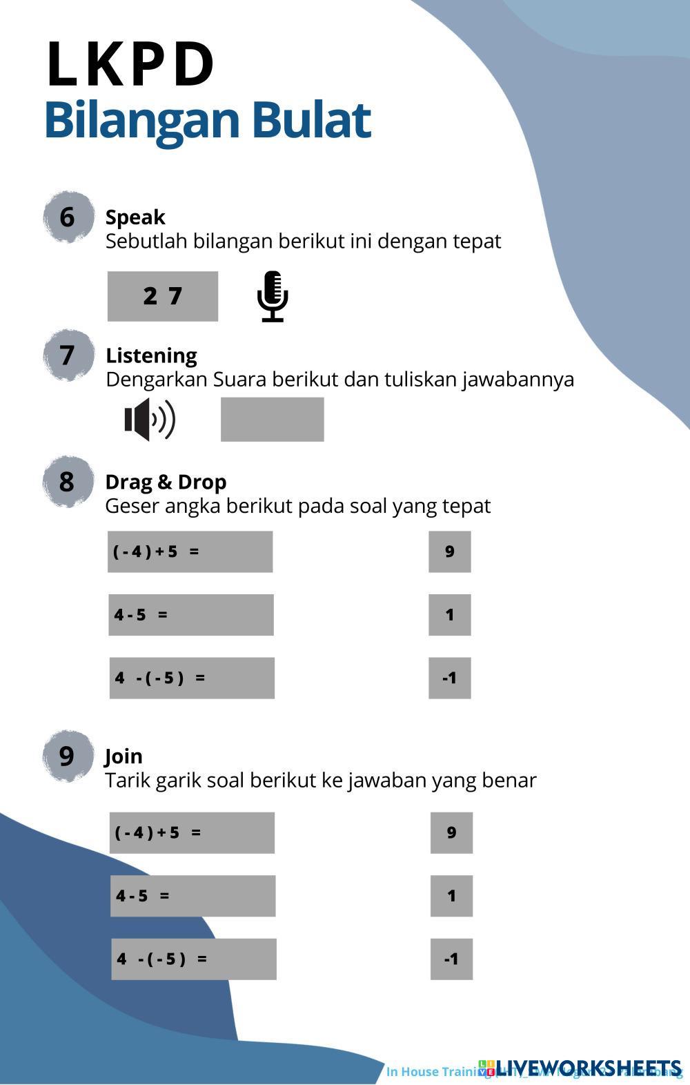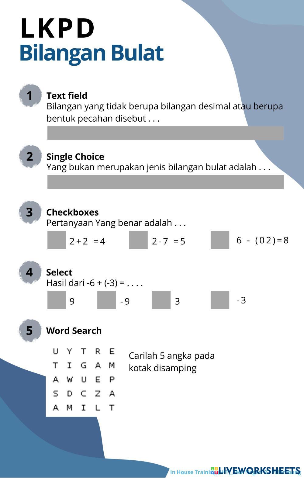 Created byrininofitri mtk bil negatif Age 12-9 level: SMP Indonesian Author's Instructions LKPD Kelas 7 matematika oke My Google Classroom Courses × 0 classes selected (0 students total) Quick Access Select all classes (0 classes) All Classes Loading courses... Cancel Share Share to selected Course __COURSE_NAME__ __STUDENT_NAME__ (__STUDENT_EMAIL__) Bilangan Bulat Download Worksheet Validation Check my answers Emails my answers to my teacher Full name Group/level School subject Teacher's email or key code Close Submit Validating worksheet... (12) Your answers have been sent to your teacher. Good luck! OK We encountered an error submitting your answers. Please try again. OK Advertisement | Go Ad Free Created byrininofitri mtk bil negatif Age 12-9 level: SMP Indonesian Author's Instructions LKPD Kelas 7 matematika oke