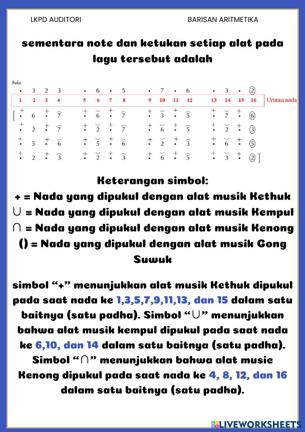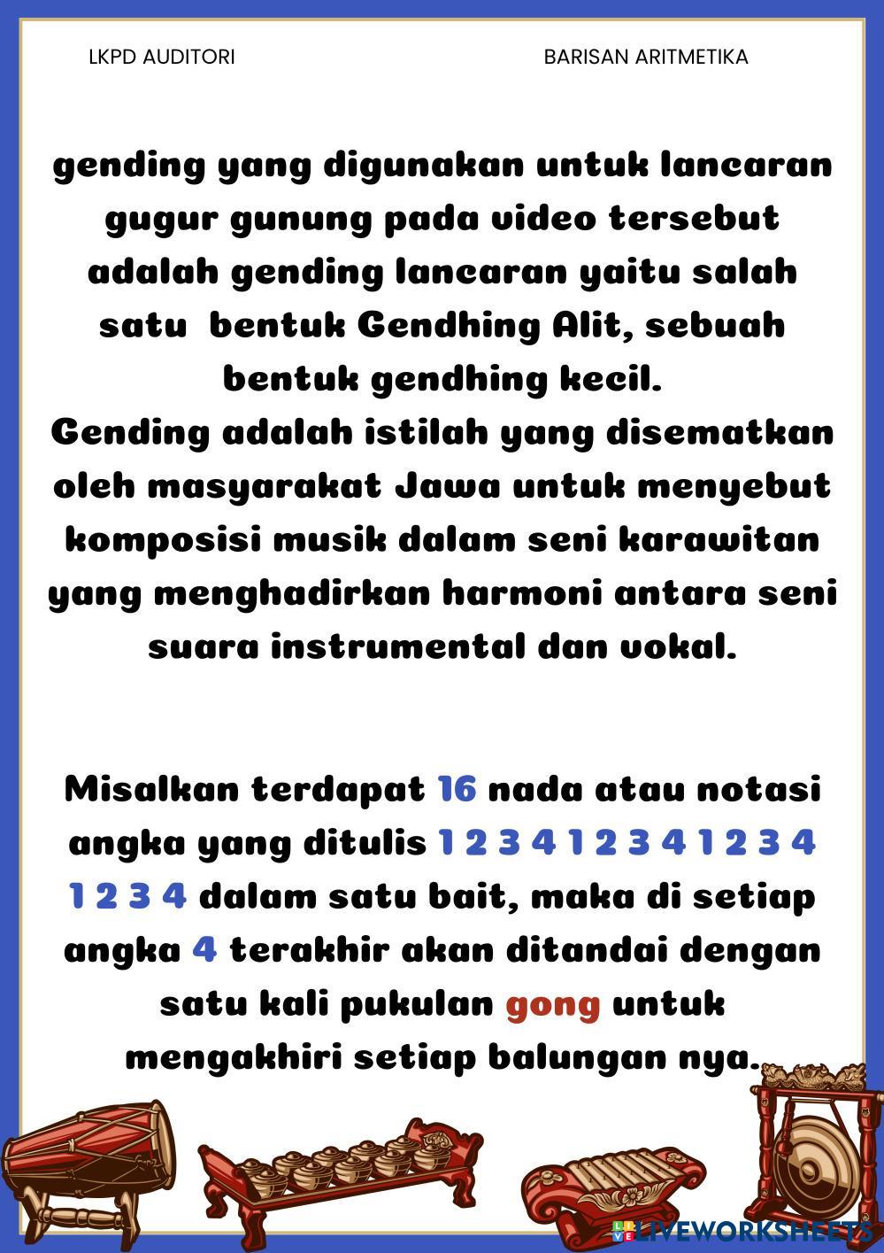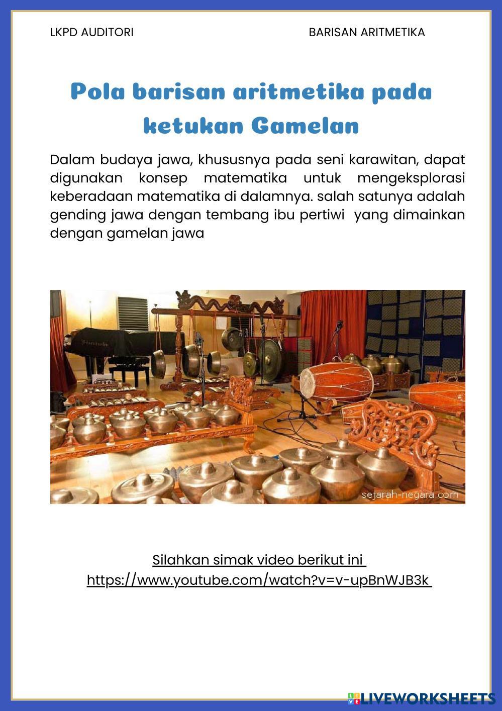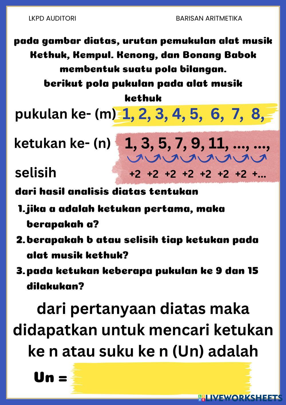 Created byAdiyat Hanis MTK Mtk Age 15+ level: X Indonesian Author's Instructions My Google Classroom Courses × 0 classes selected (0 students total) Quick Access Select all classes (0 classes) All Classes Loading courses... Cancel Share Share to selected Course __COURSE_NAME__ __STUDENT_NAME__ (__STUDENT_EMAIL__) LKDP AUDITORI BARISAN ARITMETIKA Download Worksheet Validation Check my answers Emails my answers to my teacher Full name Group/level School subject Teacher's email or key code Close Submit Validating worksheet... (12) Your answers have been sent to your teacher. Good luck! OK We encountered an error submitting your answers. Please try again. OK Advertisement | Go Ad Free Created byAdiyat Hanis MTK Mtk Age 15+ level: X Indonesian Author's Instructions