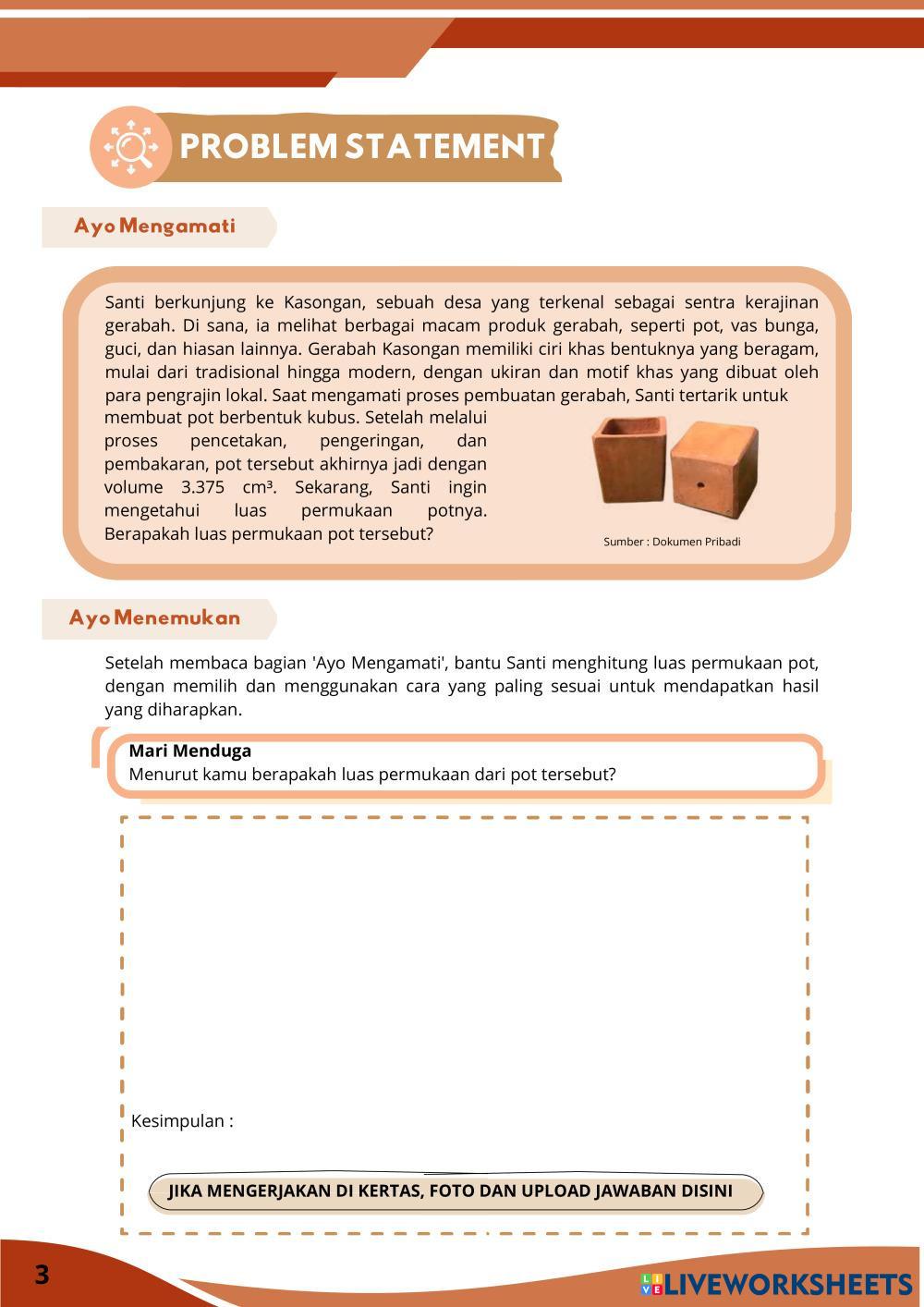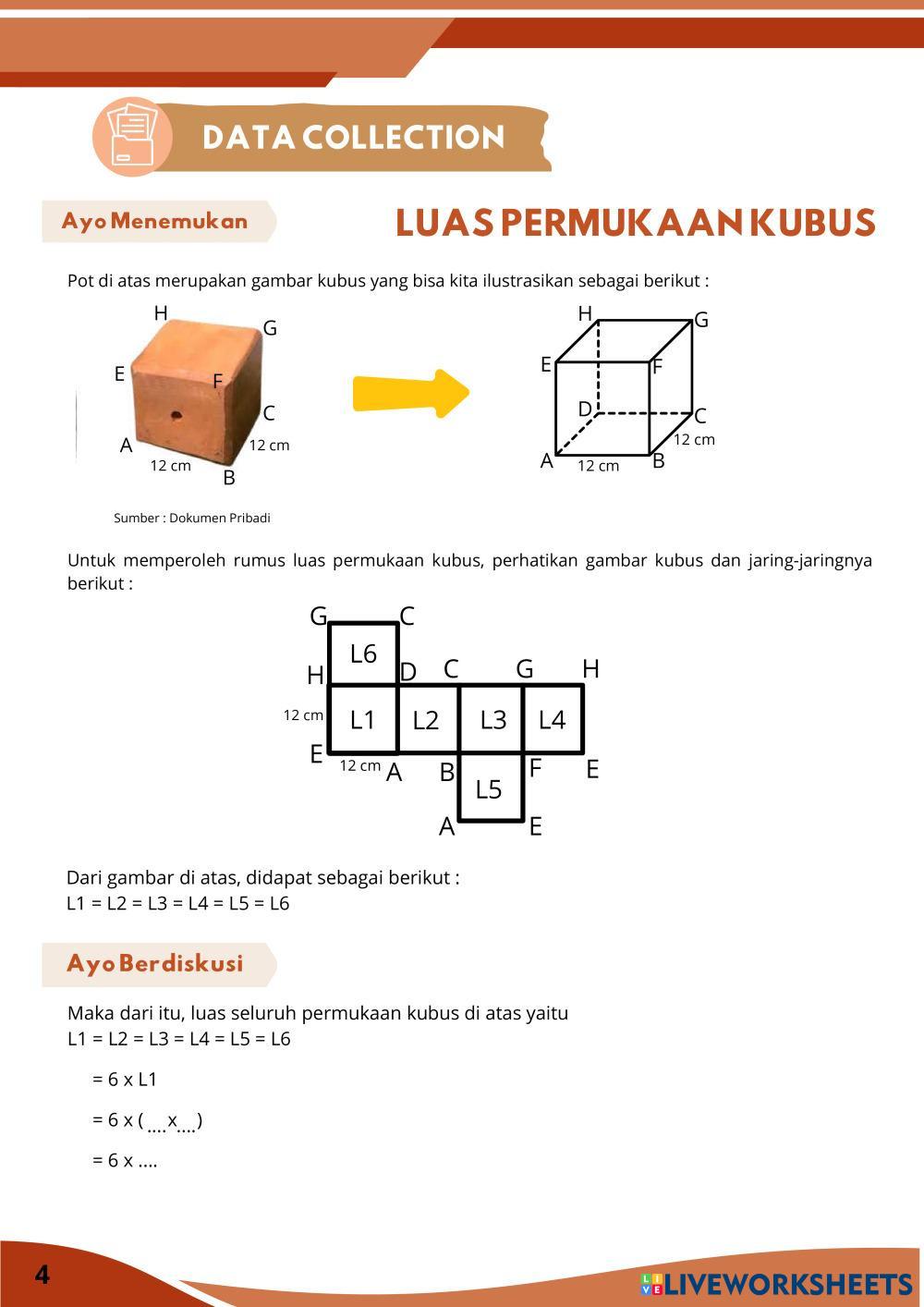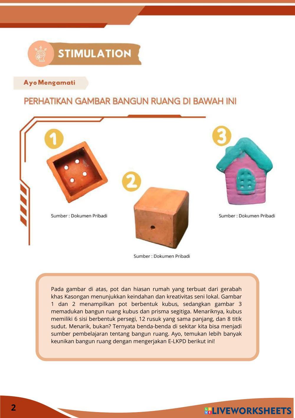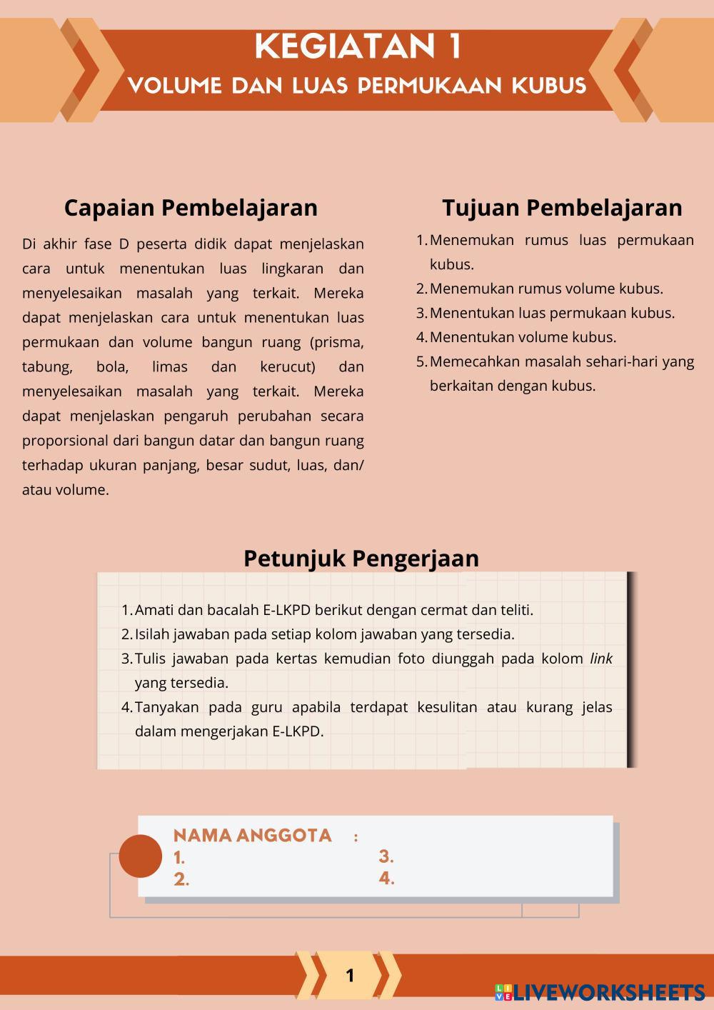 Created bySasikirana Zahra MTK Bangun ruang sisi datar Age 13-18 level: 8 Indonesian Author's Instructions My Google Classroom Courses × 0 classes selected (0 students total) Quick Access Select all classes (0 classes) All Classes Loading courses... Cancel Share Share to selected Course __COURSE_NAME__ __STUDENT_NAME__ (__STUDENT_EMAIL__) E-LKPD Kubus Berbasis Discovery Learning Download Worksheet Validation Check my answers Emails my answers to my teacher Full name Group/level School subject Teacher's email or key code Close Submit Validating worksheet... (12) Your answers have been sent to your teacher. Good luck! OK We encountered an error submitting your answers. Please try again. OK Advertisement | Go Ad Free Created bySasikirana Zahra MTK Bangun ruang sisi datar Age 13-18 level: 8 Indonesian Author's Instructions